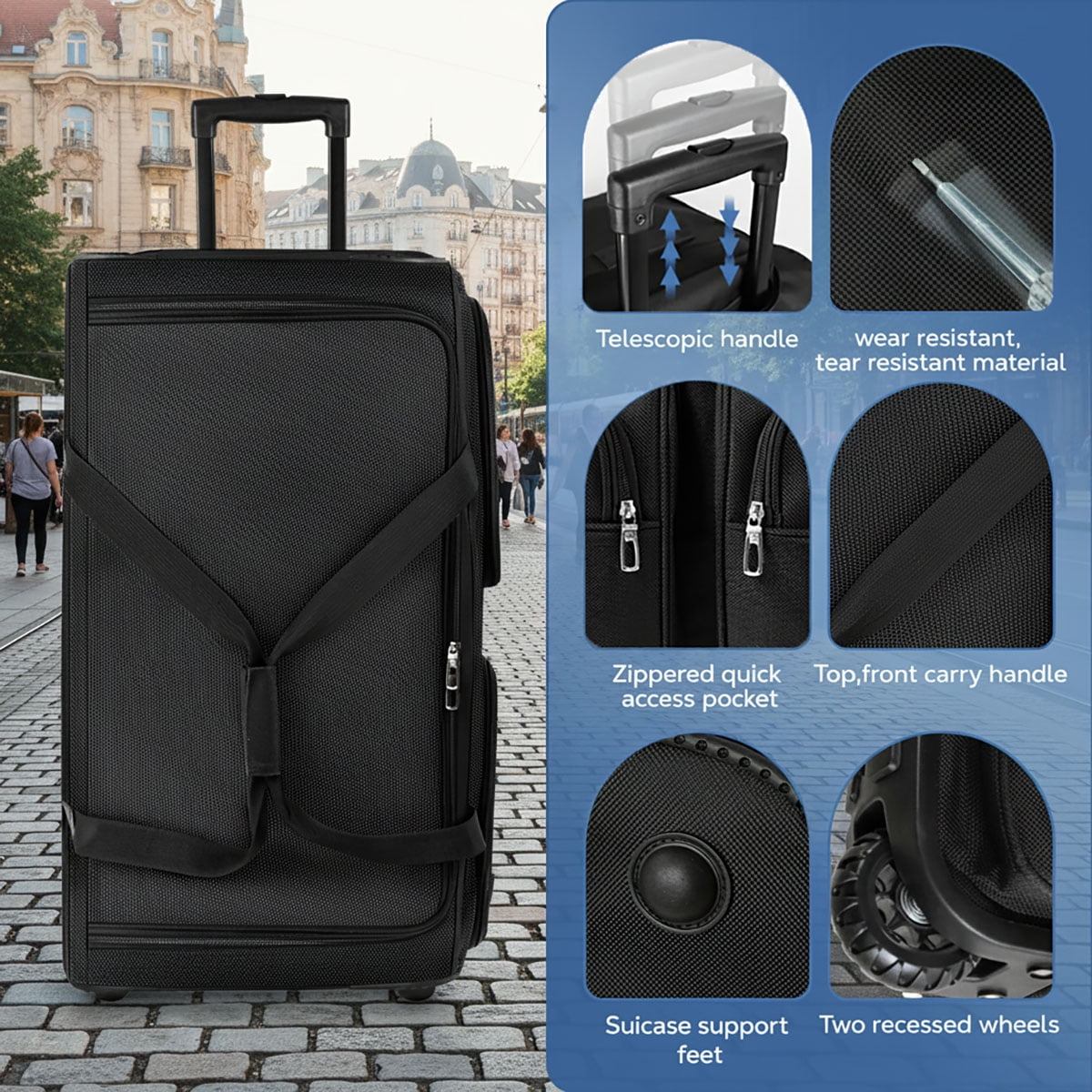 If you’re looking for stylish and practical travel duffel bag, you’ve come to the right place. Our duffle bag with wheels is equipped with expandable handles and durable 600D polyester fabric, durable, tear-resistant material ensures long-lasting product,making it the perfect companion for your travels. We offer four sizes to choose from: 22 inches, 30 inches, 36 inches, and 40 inches, to meet your different travel needs. Each duffel bag with wheels design features a spacious U-shape main compartment, allowing you to easily pack all necessary items, while two side pockets provide additional storage space for small items and essentials. Rolling duffle bag luggage not only feature ergonomically designed expandable handles but also smooth and quiet large inline wheels,making it easier for you to move around during your journey. Whether it’s a weekend getaway, camping, work, school, or a business trip, New York XPress wheeled duffel bag ensures your belongings arrive safely and conveniently at your destination. Explore our product series, choose the size that suits your needs,and embark on a pleasant and worry-free journey. 【Specification】: -Name:foldable duffle bag with wheels -Material: 600D polyester -Exterior:3 zipped pockets -Gender:Male /Female -Ideal for Business Traveling Study etc -Color:Black 【Size】: -22″:12.5×11*22 inches -30″:13.5x14x30 inches -36″:15x15x30 inches -40″:15.5×15.5×40 inches 【Parcel list】:1x 36″ rolling duffle bag with wheels 【Note】: -Please allow 1-3cm differs due to manual measurement. -The color may be a little different from that of real item due to the different display and different light.