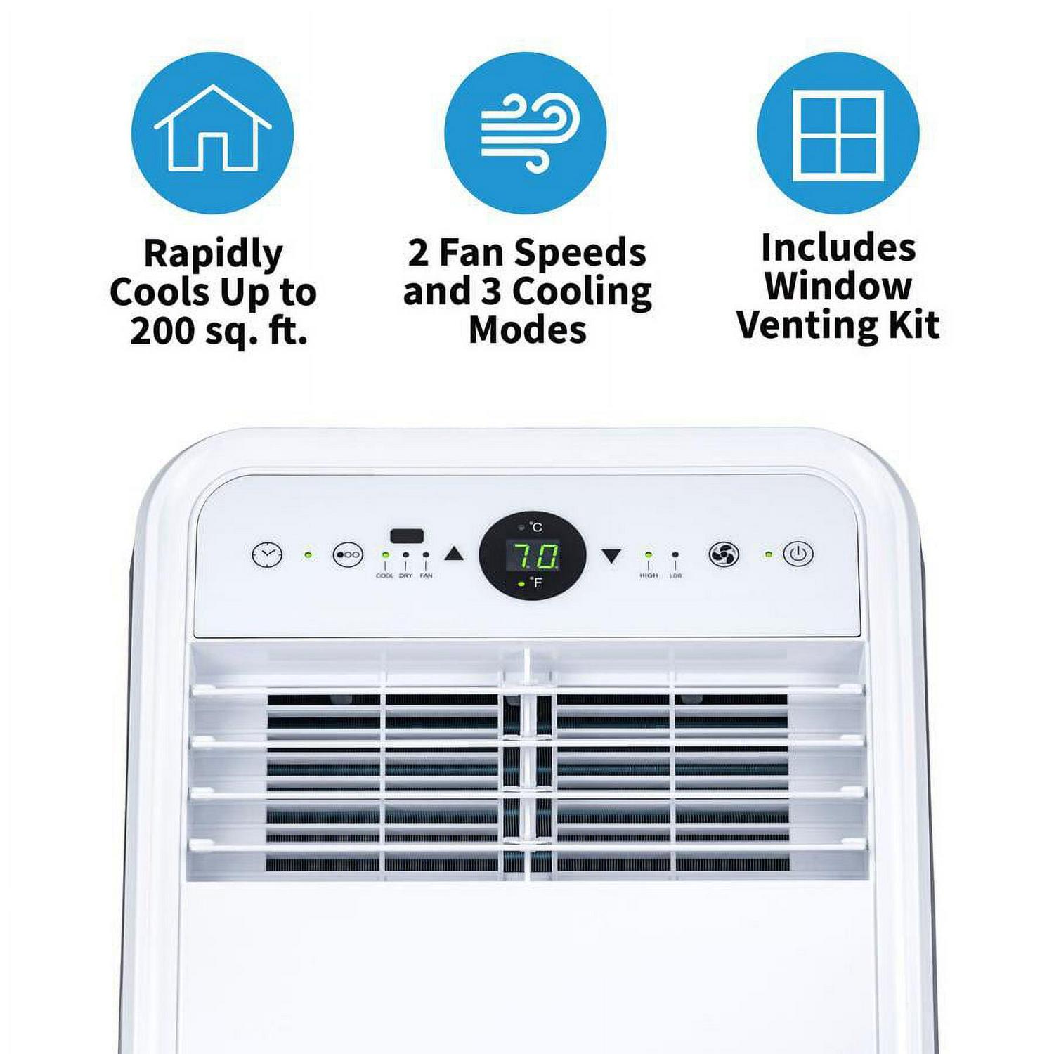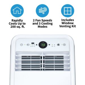 - Compact portable air conditioner quickly and evenly cools up to 200 square feet