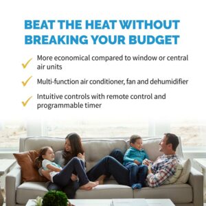 – Compact portable air conditioner quickly and evenly cools up to 200 square feet.