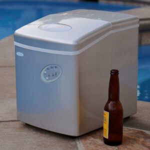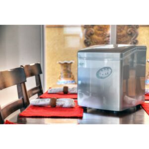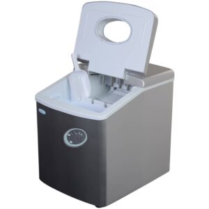 This NewAir Countertop Ice Maker keeps you in a steady supply of ice for entertaining at home or on the road. This compact countertop ice maker looks great in your kitchen, but it’s portable enough to take out in your RV, camper or boat. This NewAir Countertop Ice Maker produces 28 pounds of bullet ice each day and keeps it cold in a well insulated storage compartment. Choose from four stylish colors: black, red, stainless steel or silver.