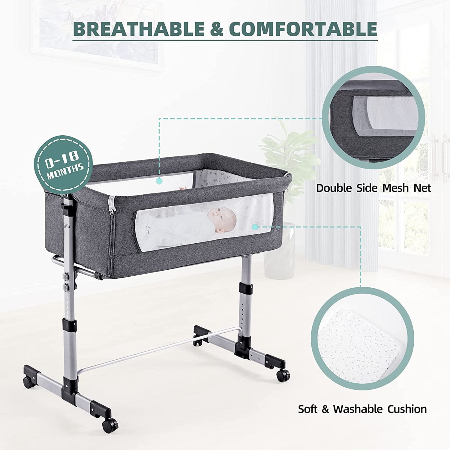 【3 in 1 Multifunction】This Unisex bedside sleeper can be used as a standalone bassinet, or side-sleeper bassinet, attached to an adult bed. Besides, it comes with detachable breathable mosquito net and extra storage bag which fits baby essentials like diapers, wipes, and more. 【Stable & Safe】We put your baby’s safety first. This premium bedside bassinet is crafted with sturdy iron and aluminum frame. The wheels and the brakes system allow bassinet to move around easily or stand stably. 【Breathable & Comfortable】The bedside bassinet was manufactured with soft skin-friendly fabric and breathable mesh, which is designed for breathability and visibility. And the removable and machine-washable mattress is soft, pressure-resistant for comfort. 【Adjustable Height】5 height adjustment to fit different height of the beds. Retractable feet with safety auto-locks allow the bassinet to be stablely fixed at the parents’ bedside within reach 【A Must-have for New Parents】No tools needed while assembly, Portable and easy to move, you can take it into plane and travel. Specification: 1) Color: Grey 2) Gender: Unisex 3) Applicable Age: 0-6 Months (recommended for babies up to 33 lbs, or 6 months of age, or whenever your baby begins to show signs of pushing up to hands and knees.) 4) Material Safety: paint-free Aluminum Alloy + skin-friendly Linen + Airy Mesh, all material is non-toxic: lead, surface coating and other chemical all pass the related tests 5) Airy Mesh on the Side: allow for more air circulation and allows you to keep an eye your baby`s action to reduce the risk of baby suffocation 6) ASTM and CSPC compliant adjustable angle (5°- 8°) prevent milk from choking and overflowing 7) This bassinet is flat and meets the Safety Standard for Baby Bassinet. Notice: Guardians are not allowed to leave the site use when it’s used by children The weight of children should not exceed 15kg(33lbs) This bedside sleeper is designed for use only with adult beds that are between 18.5-24 Inches (47-60cm) from floor to top of adult mattress