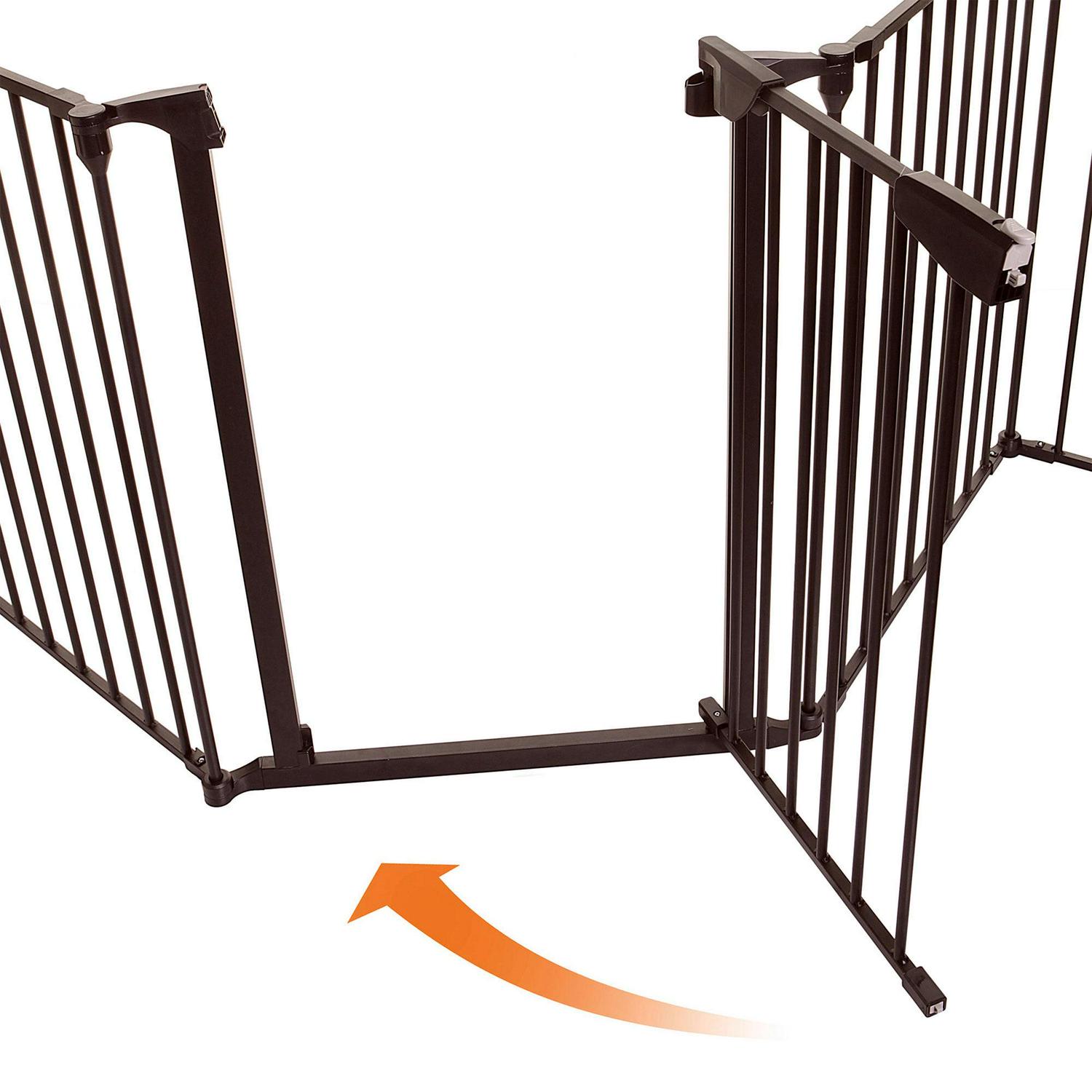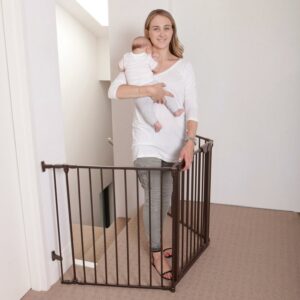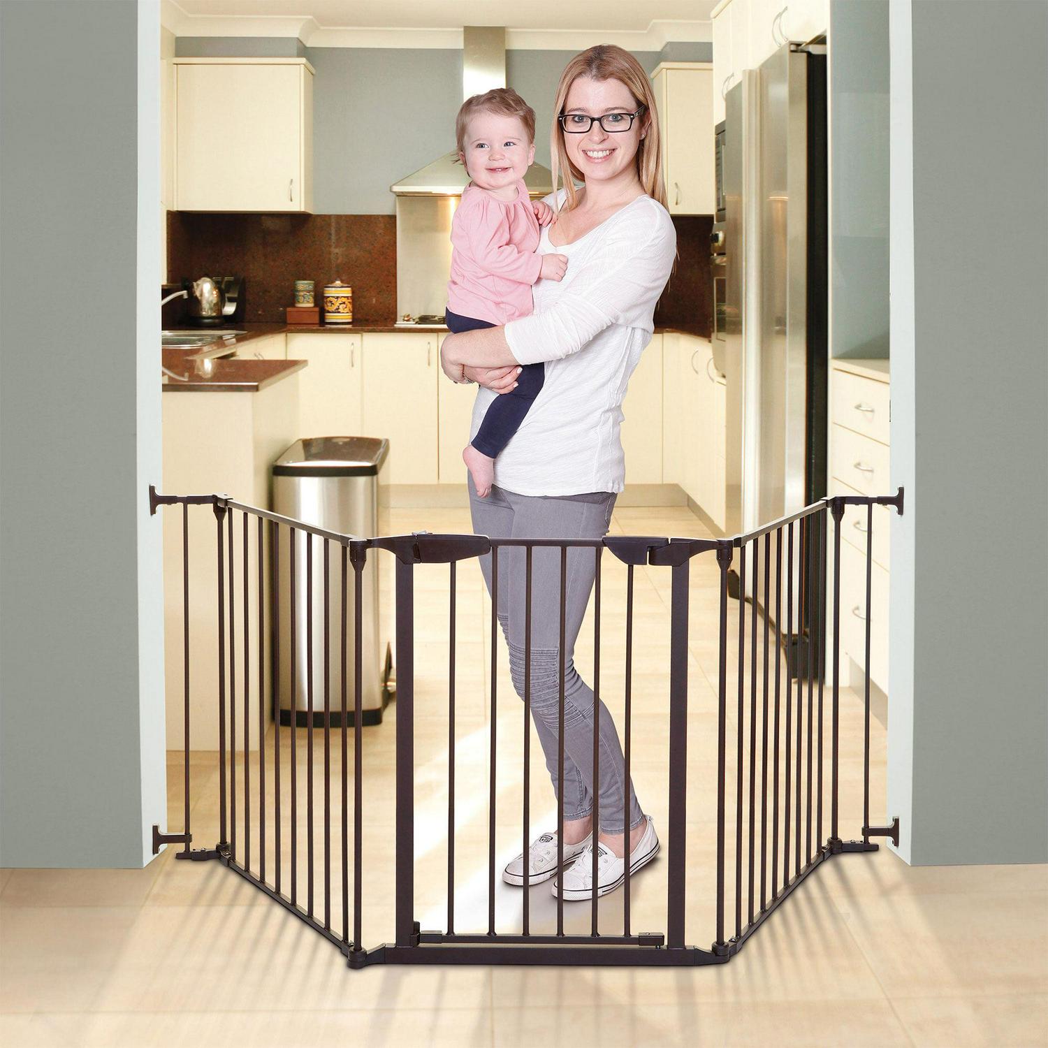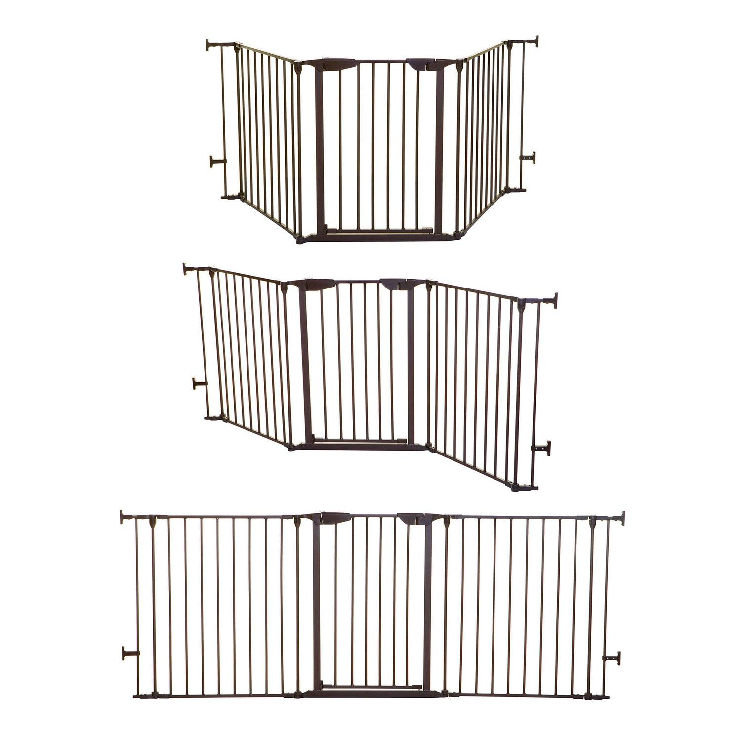 – Hardware mounted for stability, this tri-paneled baby gate is easy to arrange and install based upon your needs and preferences. It s also easy to use with simple, reliable, one-handed operation