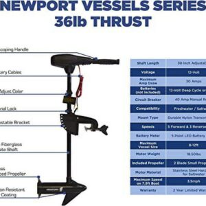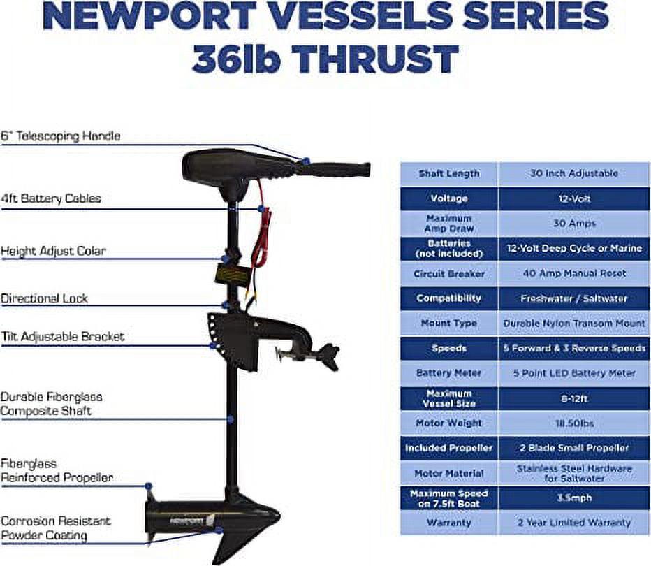 This versatile and all around use trolling motor is constructed with the highest quality materials and design concepts. This small but powerful trolling motor is built to last. With an adjustable 30-inch shaft length, the Newport Vessels trolling motor is built to fit all Newport Vessels inflatable boats as well as almost all other brands of inflatable boats, kayaks, dinghies, tenders, fishing boats, aluminum fishing boats and inflatables with a transom. The eight-speed control system (five forward speeds and three reverse speeds) makes for a smooth and easily controlled ride. The 36-pound thrust electric trolling motor comes with a two-blade propeller (8.9-inch diameter) for optimal performance. This transom mount motor is to be powered by one 12-volt deep cycle battery or marine battery (battery not included).