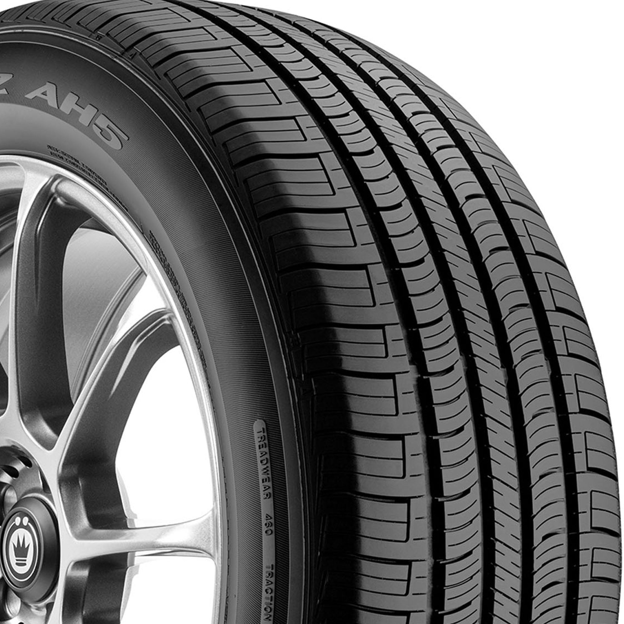 An all-season tire, the N’Priz AH5 from Nexen is designed for use on coupes and sedans and offers drivers better cornering and handling along with a 50,000 mile limited tread life warranty. For a good all-season touring tire, look no further than the Nexen N’Priz AH5. This tire is built with four wide longitudinal grooves. These grooves are computer designed and improve drainage from the tire to give you a strong grip on the road and great traction on the corners. The rigid shoulder block design provides better cornering and handling as well as a quiet and comfortable ride. There is a dual kerf design which enhances block stiffness, giving you a solid and reliable tire which will last a lot of miles. The tires are built for use on a variety of coupes, sedans, minivans, and crossovers, all of which will enjoy fuel efficiency and a quiet comfortable ride. The continuous center rib helps keep your tire moving straight ahead and also provides longer tread life.