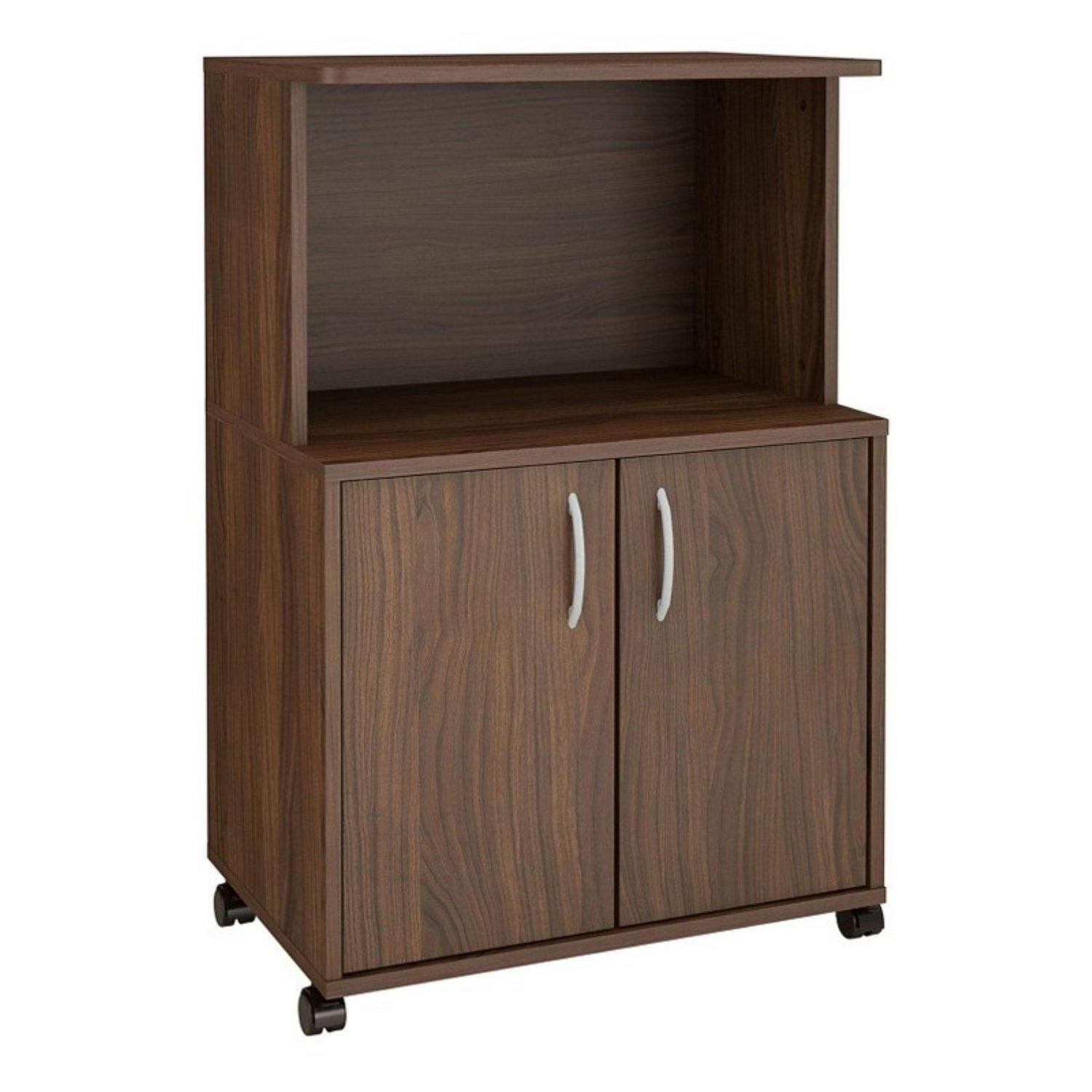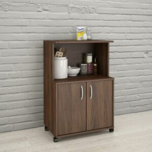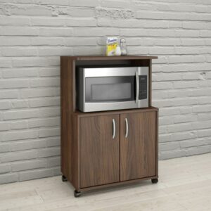 Nexera 2-Door Microwave Cart features 1 open section at the top with a 2-door closed section at the bottom with an adjustable shelf. The cart is mounted on casters for ease of use and mobility.