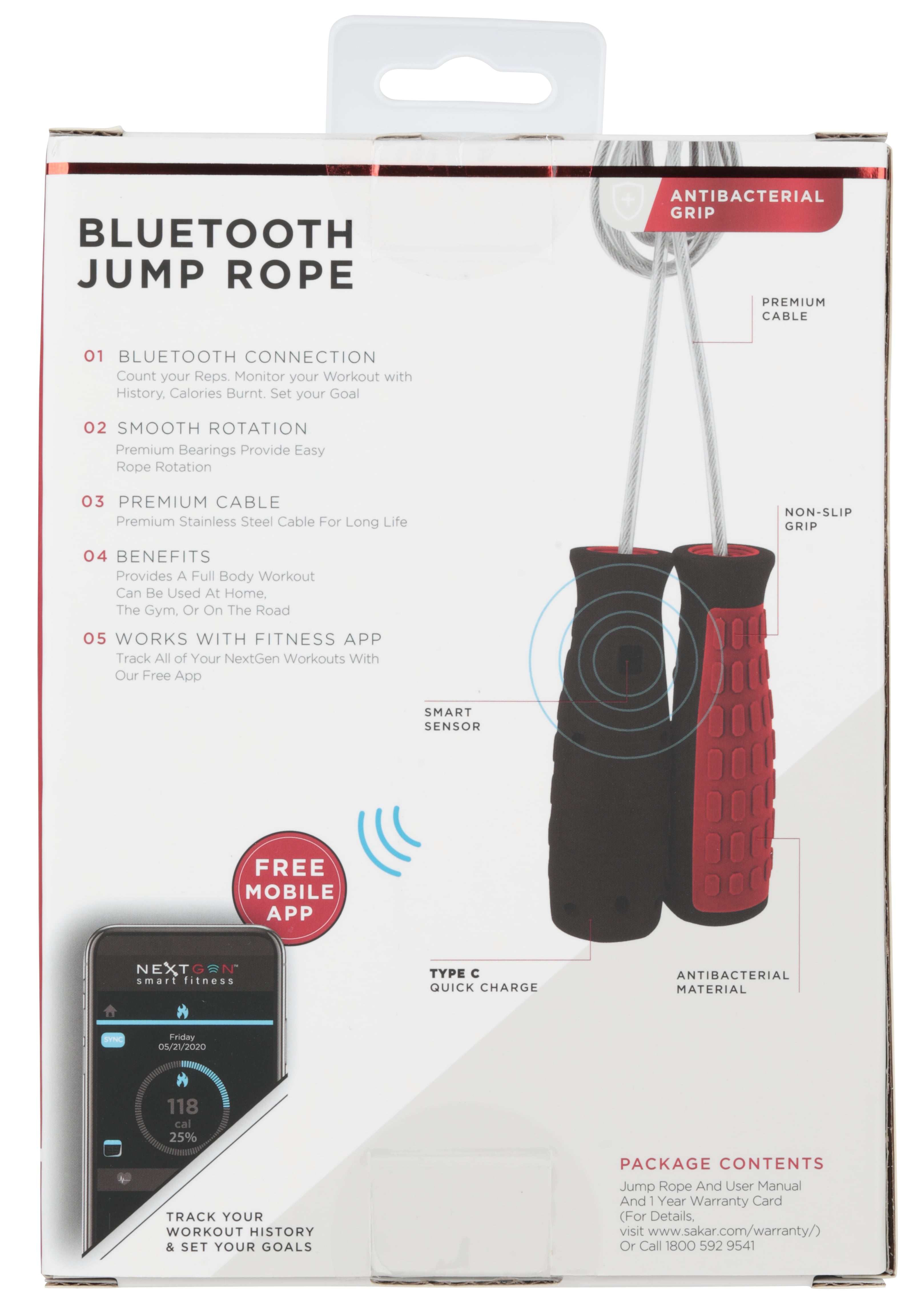 NextGen Smart Fitness Bluetooth Jump Rope • SMART & VERSATILE JUMP ROPE: Our jumping rope quickly pairs up with your smartphone through Bluetooth to accurately track your heart rate, rep count, calories burned and more so you can keep track of your overall fitness progress the smart way. • NO KINKING OR TANGLING: Thanks to the stainless steel build, you never have to worry about our exercise jump rope kinking or tangling. This workout skipping rope features heavy-duty ball bearings to ensure smooth rotations while being travel-friendly for use at home and on the go. • MADE FOR YOU: We combine a functional design with sturdy materials to bring you a speed jump rope that’s made for everyday use. Our workout rope features a steel rope with a clear protective coating to offer just the perfect balance between durability and safety. • RECHARGEABLE & ANTI-SLIP: Our jump ropes for adult’s fitness are designed with molded finger assist grips that ensure an anti-slip and comfortable grip while inhibiting sweat build-up. It features a rechargeable battery that provides up to 5 hours of use and comes with a USB Type-C cable. • COMPATIBLE WITH YOUR PHONE: This long jump rope for men and women is compatible with both Android and IOS devices that support Bluetooth technology which coupled with the mobile app allows you to store and observe your workout history and watch a wide variety of tutorial videos.