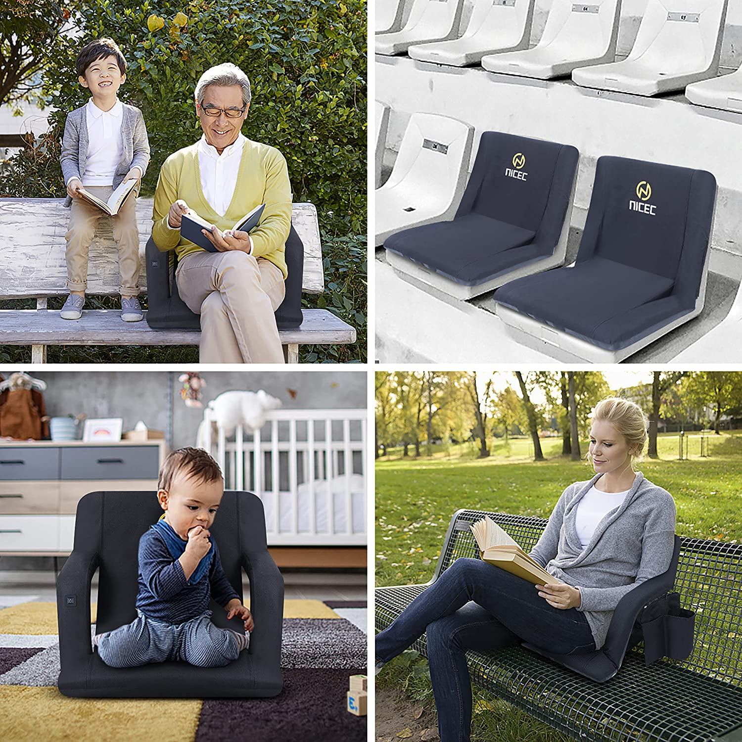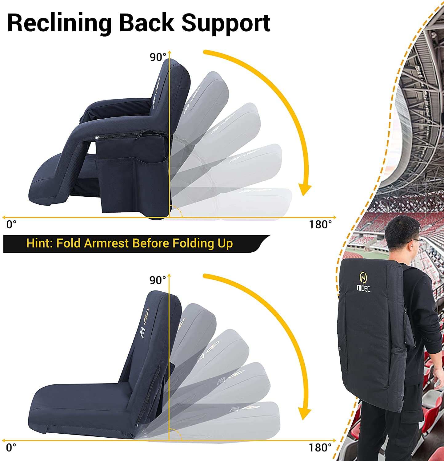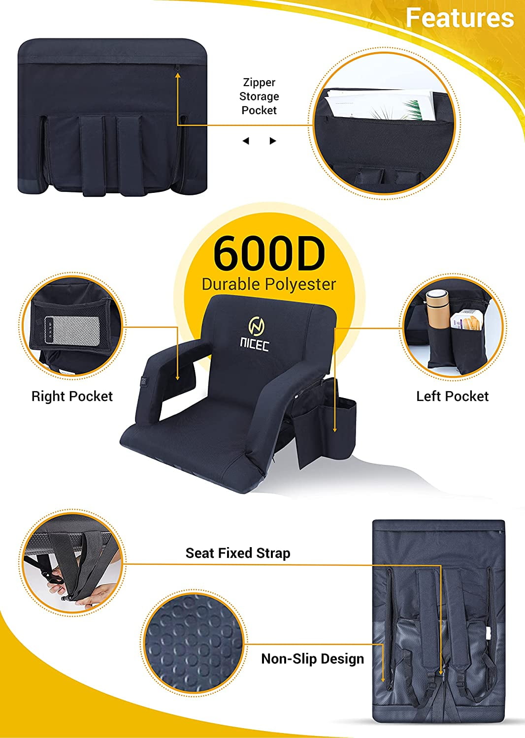 Nice C Heated Stadium Seats, Bleacher Chairs, 5 Reclining Positions Waterproof Cushion, Upgraded Ultralight, Foldable, Extra Thick Padding, with Shoulder Straps & Net Pockets(One Black,NO POWER BANK)