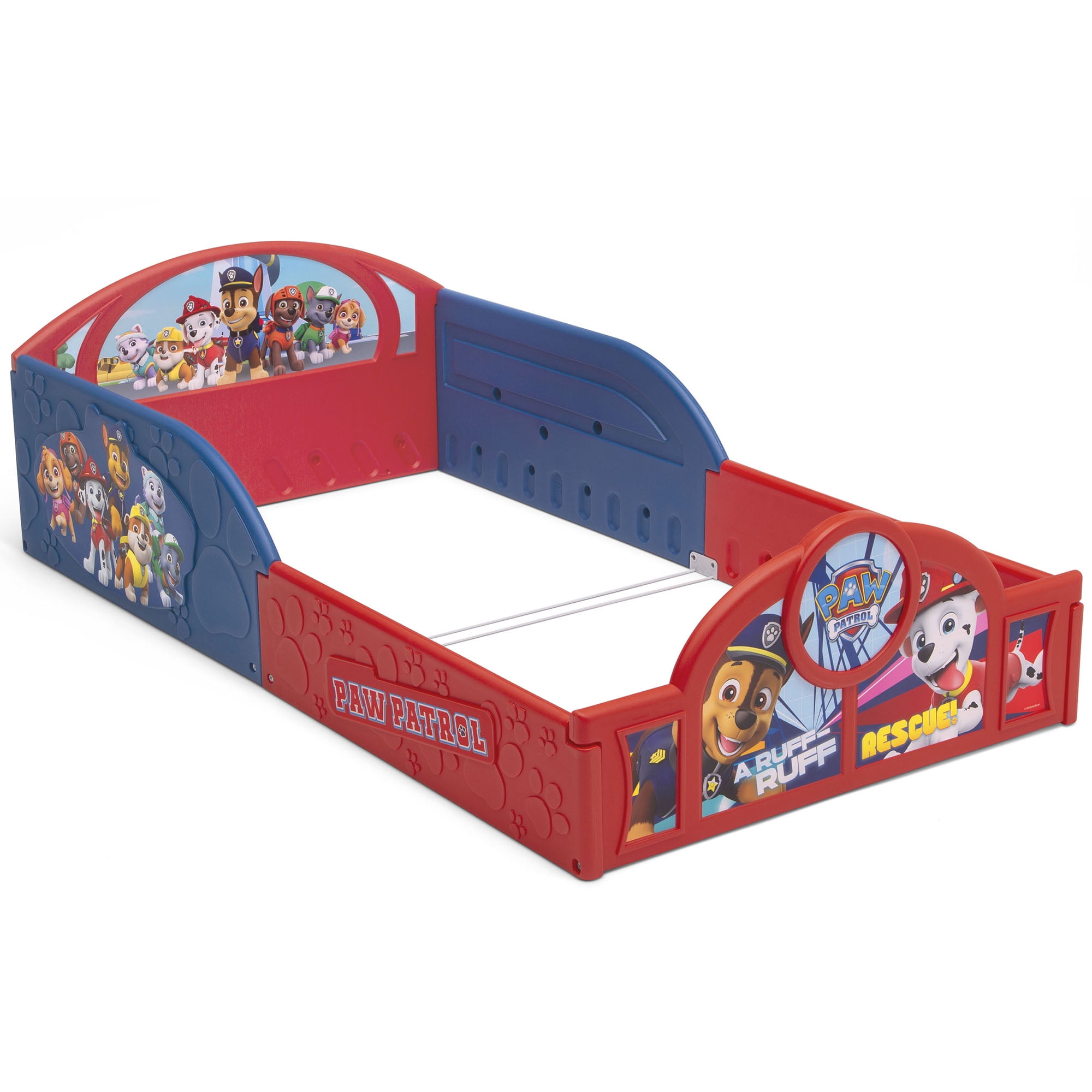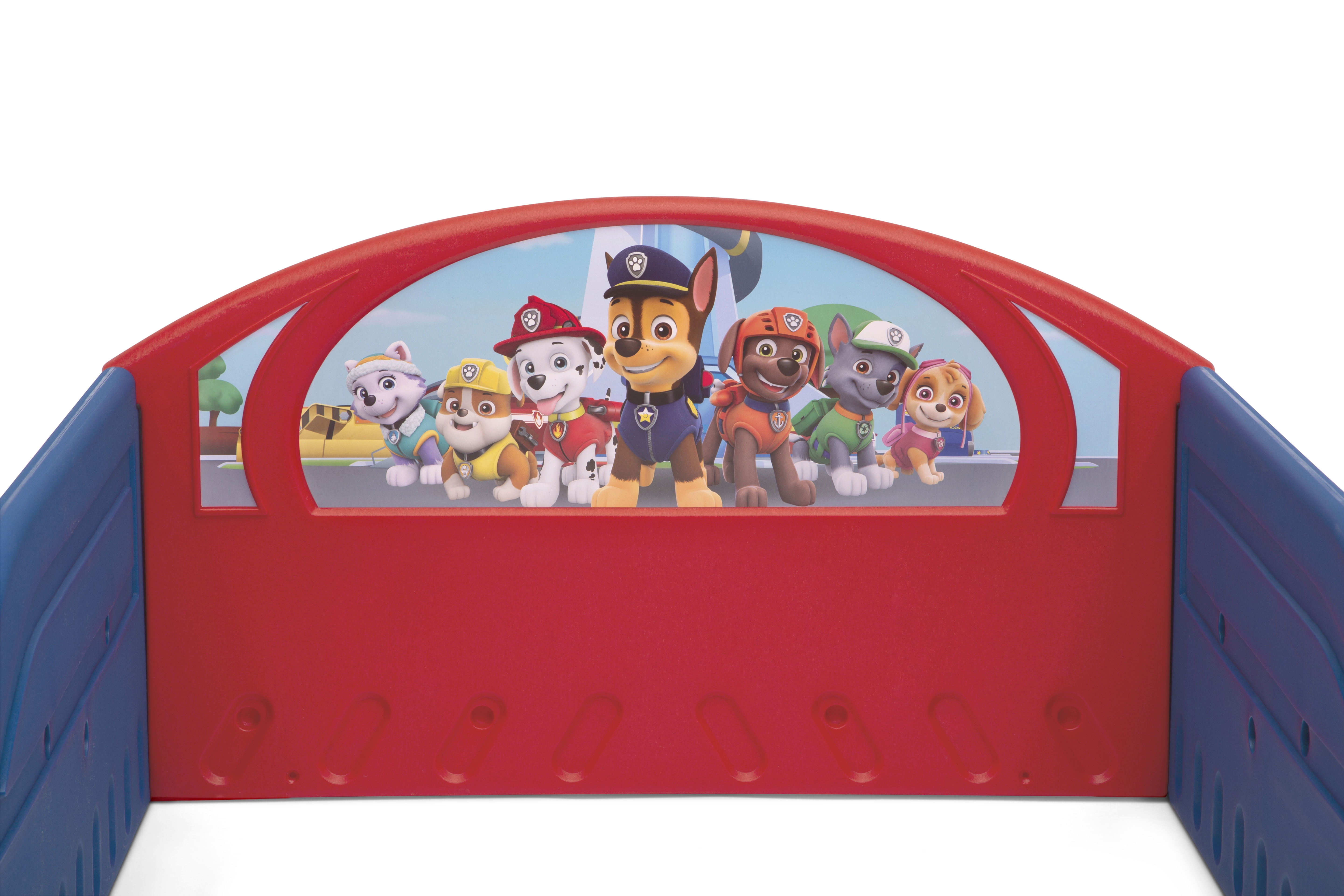 Transition their space from a nursery to a toddler room with the perfectly sized PAW Patrol Plastic Sleep and Play Toddler Bed from Delta Children. Featuring three-dimensional paw prints paired with colorful decals of Marshall, Chase, and the whole PAW Patrol pack, this study toddler bed creates a comforting environment that promotes a sound sleep. The PAW Patrol Plastic Toddler Sleep and Play Bed will also keep your little big kid secure throughout the night, its attached guardrails and low mattress height allows your child to enter and exit on their own. Attached Guardrails: Attached guardrails will ensure your little one is safe and secure throughout the night. A low mattress height makes it easy for kids to enter and exit on their own, reinforcing their big-kid independence. Sturdy Plastic: Built to last, this toddler bed?s sturdy plastic construction creates a cozy, inviting environment, promoting sound sleep for your little one. About PAW Patrol: PAW Patrol is a CG, action-adventure preschool series starring a pack of six heroic puppies: Chase, Marshall, Rocky, Zuma, Rubble, and Skye, who are led by a tech-savvy 10-year-old boy named Ryder. With a unique blend of problem-solving skills, cool vehicles and lots of cute doggy humor, the PAW Patrol works together on high-stakes rescue missions to protect the Adventure Bay community. From Marshall the firedog to Chase the police pup to Skye, who flies high in her copter, each pup brings unique personality and skill to the team, modeling the importance of teamwork and good citizenship. They all have special Pup Packs on their backs to help them handle anything – from rescuing kittens to saving a train from a rockslide! No matter how big the adventure, the PAW Patrol always has time for a game, a laugh, and an ear scratch from Ryder.
