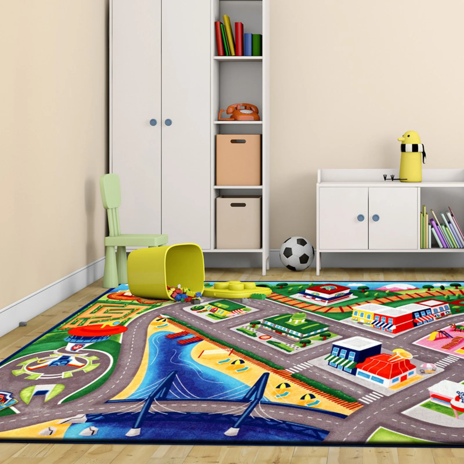 Kids will love to spend hours with their favorite pups as they work together to protect and serve Adventure Bay.This Jumbo sized interactive play rug features the village scene, Bay Bridge and the Lookout Tower. The Paw Patrol is always up for a challenge while also making sure there is time for a game or laugh! Jumbo Rug measures 4’6″ X 6’6″. Digitally Printed Polyester with Canvas Backing, Easy to Clean and Durable. Add your favorite Paw Patrol toys from your own collection to enhance this interactive experience.