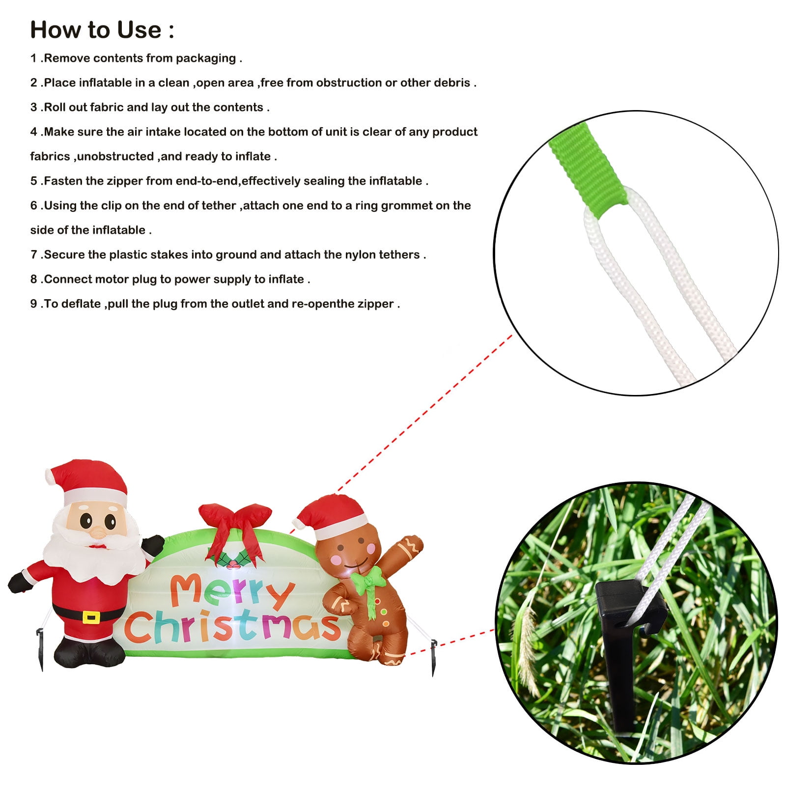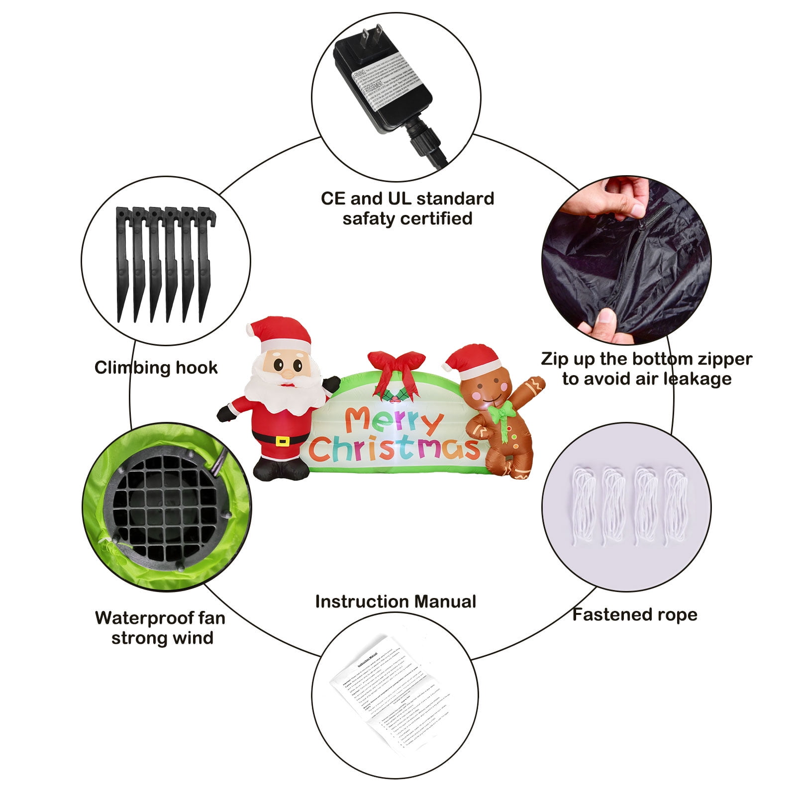 ☃️ 圣诞户外装饰 – 这是圣诞快乐的完美组合:内置 LED 发光圣诞老人和内置 LED 发光姜饼人。将它们用作室外草坪装饰和室外花园庭院装饰。 ☃️ 明亮 LED 灯 – 圣诞老人、圣诞快乐标志和姜饼人都配有 LED 灯,可以照亮您寒冷的假期。这也为您的家营造出温暖的氛围。 ☃️ 安全的户外装饰 – 该套装配有木桩和尼龙绳,可固定您的节日充气庭院装饰。包含使用说明书,产品已通过 CE 和 UL 标准安全认证。包括一个坚固的防水风扇。自动充气并包含底部拉链以避免漏气。 ☃️ 优质充气装饰品 – 圣诞老人、姜饼人和“圣诞快乐”标志均抗撕裂、防水,并采用最优质的材料制成,确保年复一年地重复使用。 ☃️ 满意保证 – 如果您对产品不满意,请随时与我们联系,帮助我们了解如何让您的体验更好! 有趣可爱的设计:这款圣诞充气玩具长 7.9 英尺,宽 1.6 英尺,高 4.2 英尺。利用这个有趣的季节来度过一个愉快的圣诞假期,包括带有圣诞快乐、快乐圣诞老人和姜饼人的标志。