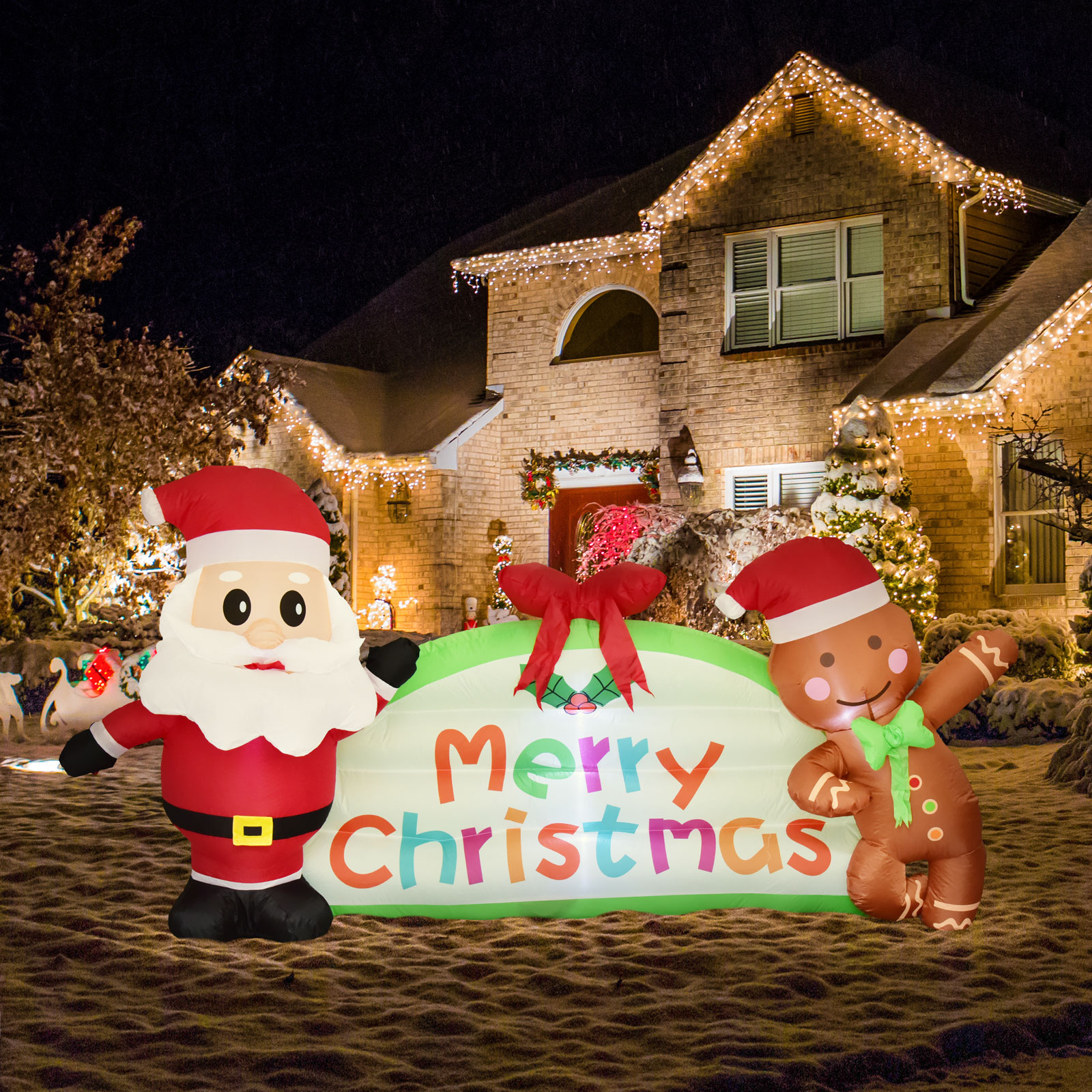 Nifti Nest 8 Ft Long x 4 Ft Tall Christmas Inflatable Decorations with Happy Santa and Gingerbread Man, Outdoor Decoration with LED Lights, Holiday Blow Up Outdoor Yard Decoration