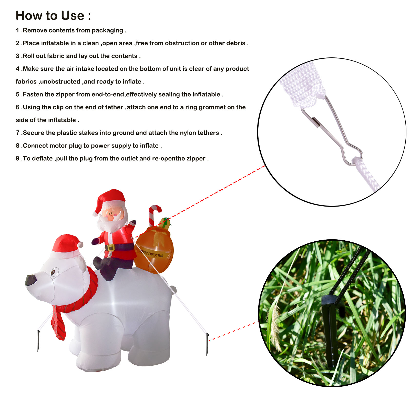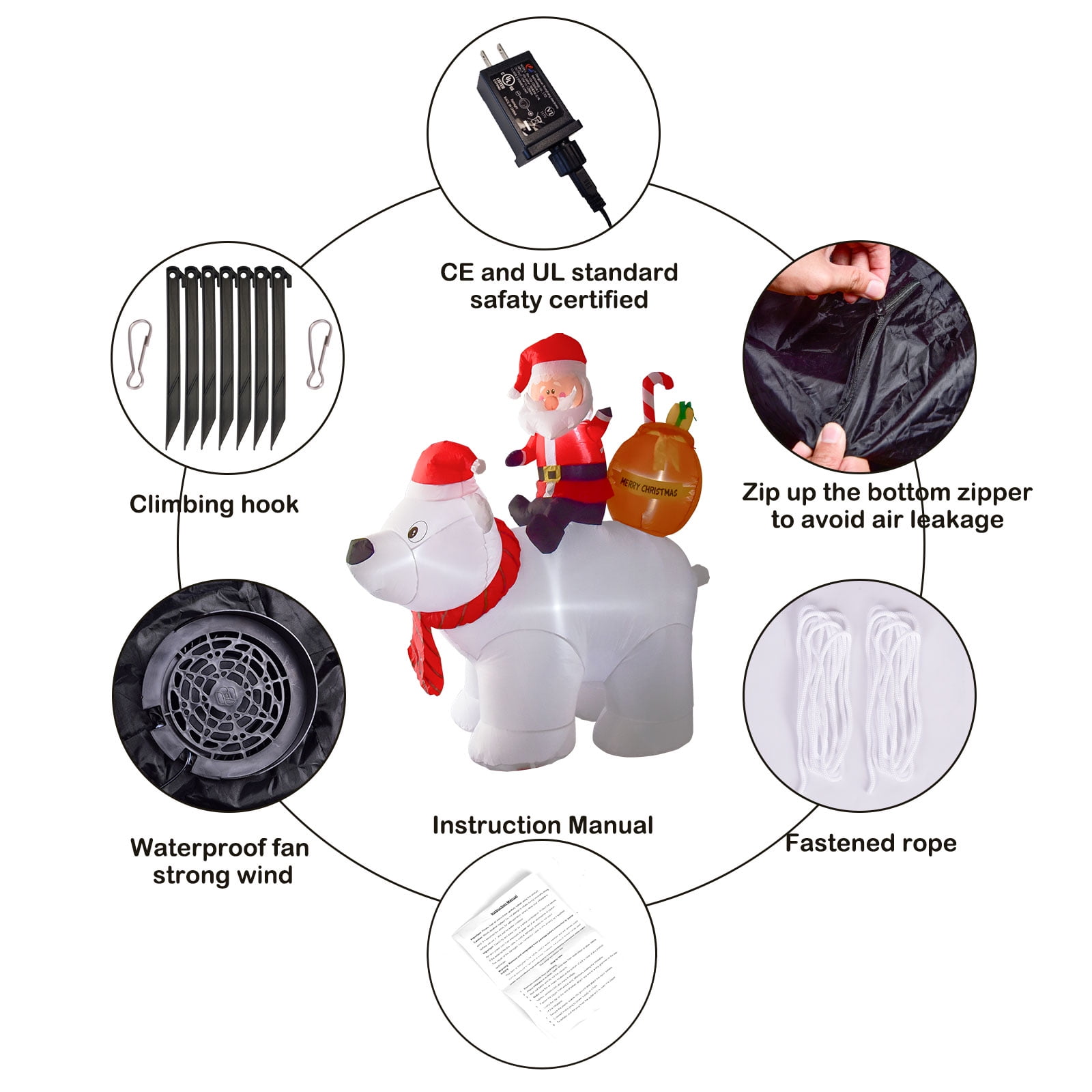 Nifti Nest The Bearing Gifts holiday blow up Christmas decor includes 1 Tiny Santa Claus riding on 1Arctic Polar Bear and carrying 1 Bag of Christmas Gifts, all measuring an enormous 6 Feet in Height The Arctic Polar Bear is dressed in cute and cozy winter attire while Santa Claus bears his classic warm red and bright white color. Christmas decor this cute is going to transform your lawn from Yawn to Keep Your Eyes On