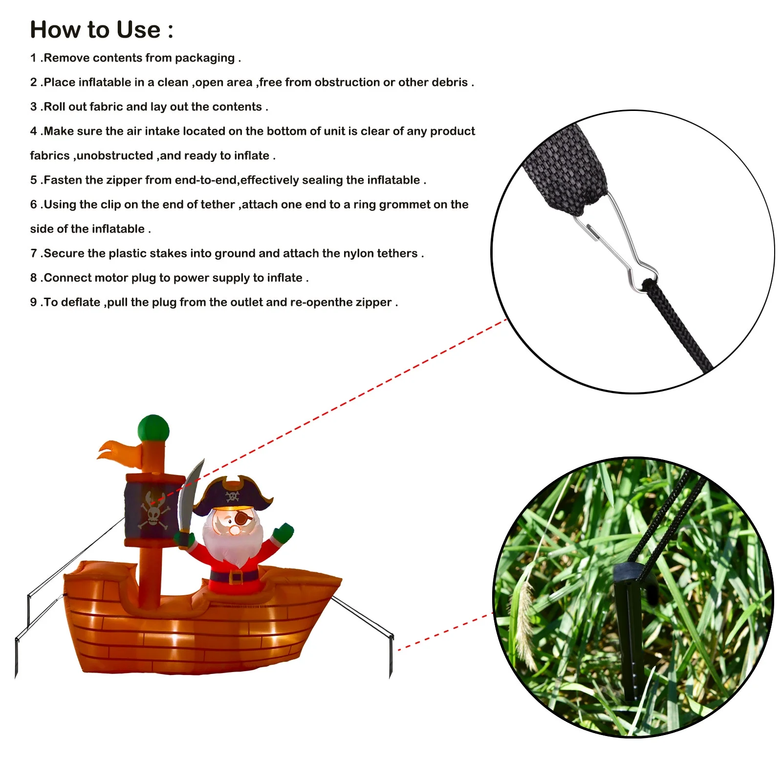 Nifti Nest the sea santa from nifti nest has 1 sea santa claus and 1 pirate ship. This amusing seasonal design comes with the santa claus you know and love on a larger-than-life Pirate Ship. Fare the seas in seasonal style with these Christmas inflatables which include santa with an eyepatch, Saber on a classic flying the pirate flag. Simple setup and storage With illustrated instructions on the packaging and an additional instructional manual in the box, setup is made simple. Pick a spot you’d like to grace with holiday joy, plug-in the inflatable with included power cord that stretches and watch your christmas outdoor decorations blow up in moments. Further, Sea Santa features easy-deflate technology through a backside zipper which makes for easy take-down and storage