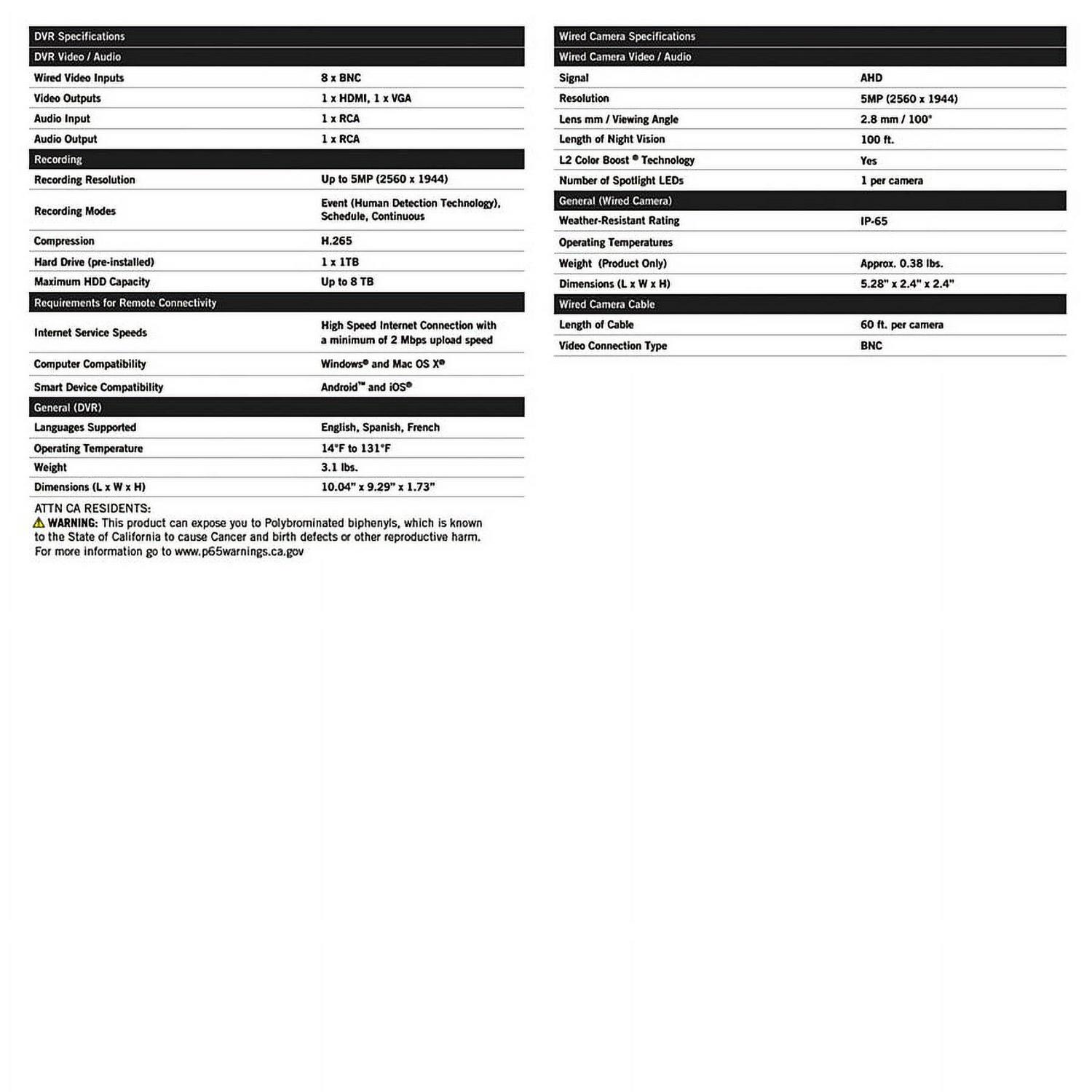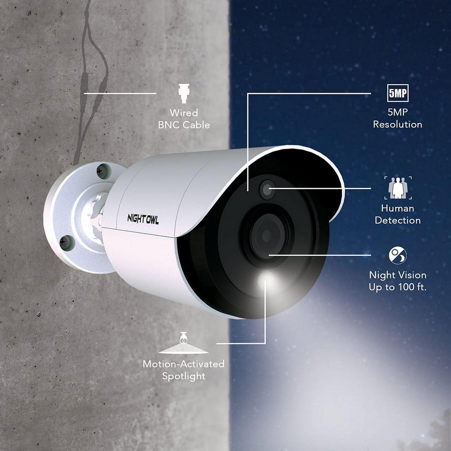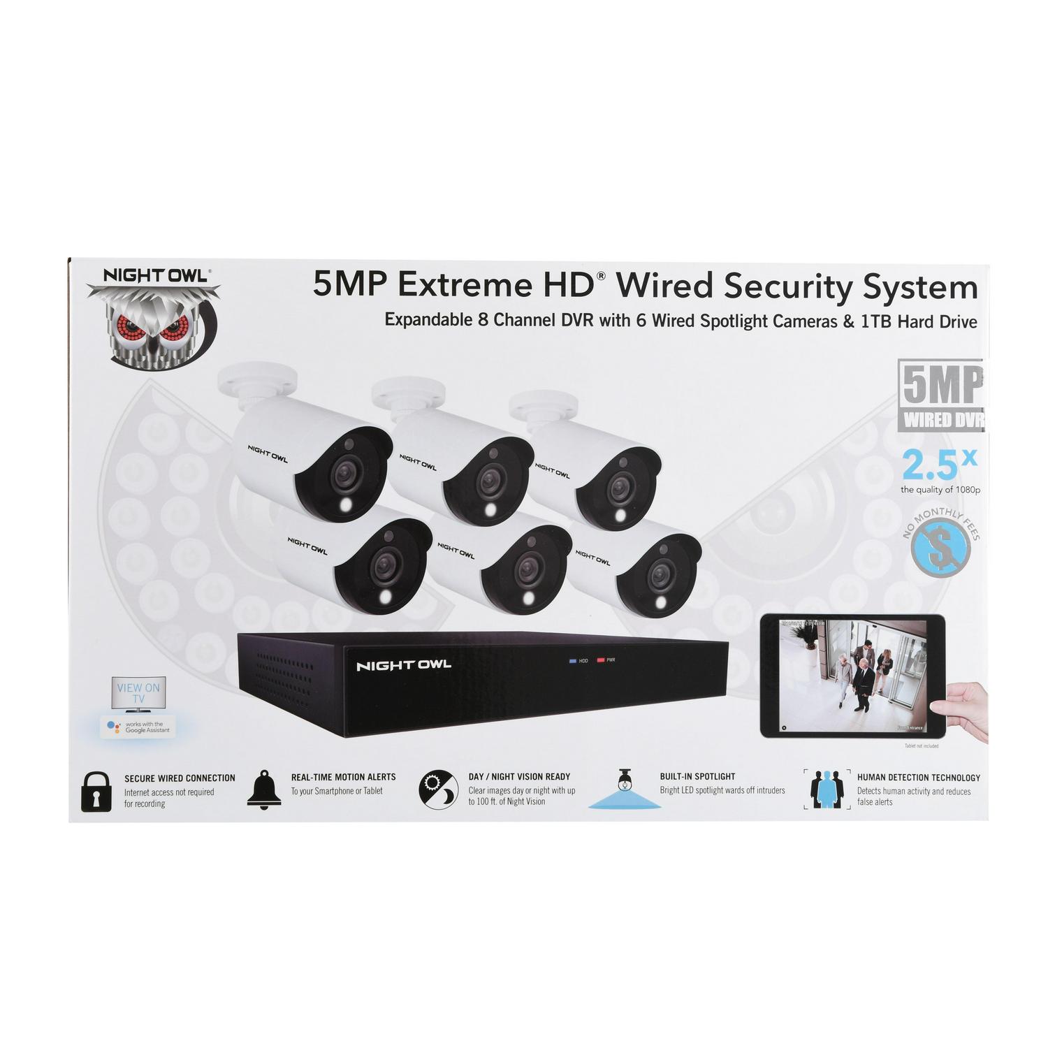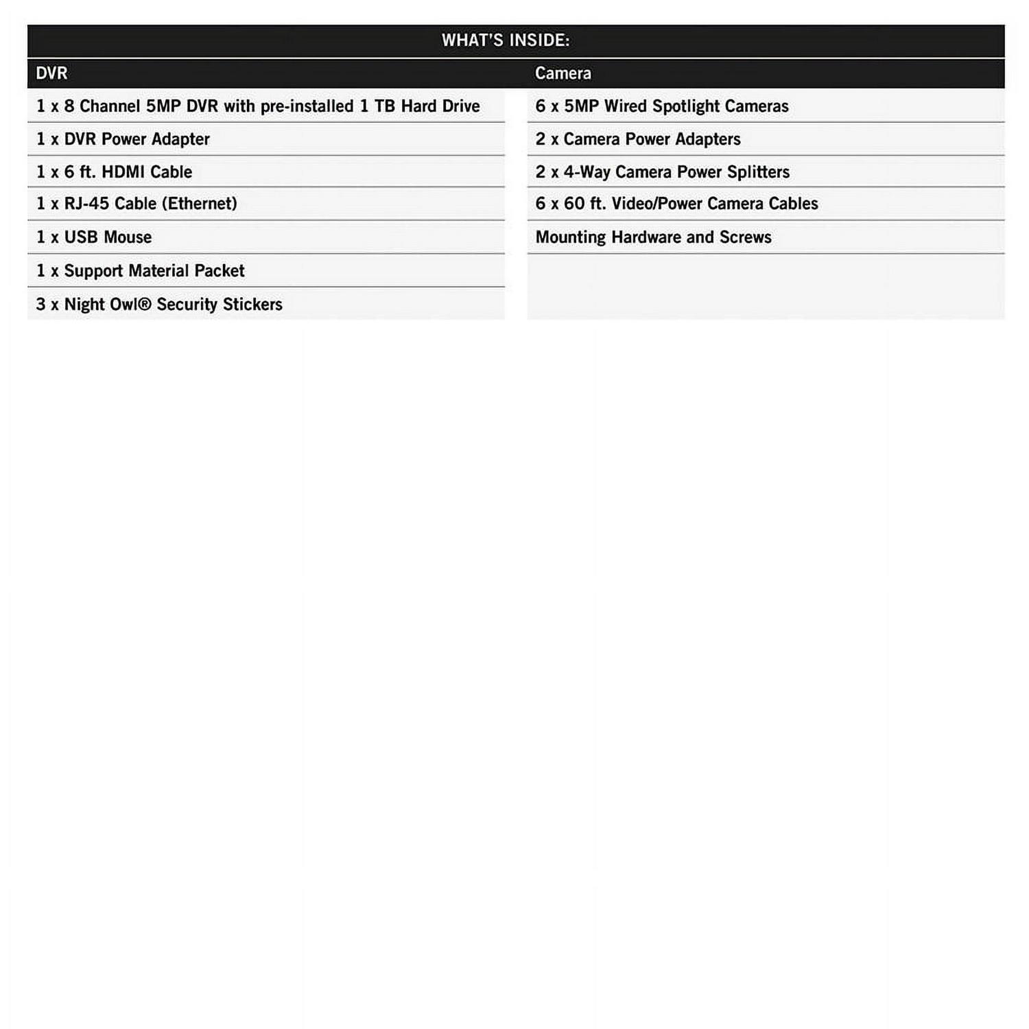 Introducing Night Owl s 5MP (Megapixel) Wired Security System with Human Detection Technology and Motion-Activated Spotlights. At 5MP, you capture recordings with clarity and precision. There are absolutely no fees for storing your recordings. Simply keep everything on the pre-installed 1TB hard drive. Human Detection Technology uses advanced algorithms to detect human motion, thereby reducing false alerts to your Smart Device and saving hard drive space. A built-in motion-activated spotlight activates anytime one of the 5MP HD Wired cameras senses human motion, adding an extra layer of security to your world. The weather-resistant indoor/outdoor cameras generate 2.5 times more pixels than standard 1080p video resolution. Additionally, continue recording in full-color video even in low-light settings with L2 Color Boost Technology. As light fades, these cameras provide crisp and clear video in full color only switching to Night Vision when necessary. Night Vision up to 100 ft. and wide-angle viewing provide extreme coverage for your home or business. The Night Owl HD Wired Security System works alongside a free remote viewing App for iOS and Android Smart Devices. You can view on a PC or Mac with our free computer software. Plus, you have access to free 24/7 technical support in English, Spanish and French, to provide all the support you need. Experience the quality, reliability of Night Owl with our new 5MP system. System Includes: DVR: 1 x 5MP (Megapixels) HD Wired DVR with 1TB Pre-installed Hard Drive (Total number of channels varies by model) 1 x DVR Power Adapter 1 x 6 ft. HDMI Cable 1 x RJ-45 Cable (Ethernet) 1 x USB Mouse 1 x Support Material Packet 3 x Night Owl Security Stickers Wired Cameras: 5MP (Megapixels) HD Wired Spotlight Cameras (Quantity varies by model) Camera Power Adapter (1 per 4 cameras) 4-Way Power Splitter (1 per 4 cameras) 60 ft. Video/Power Camera Cables (1 per camera) Mounting Hardware and Screws (3 per camera)