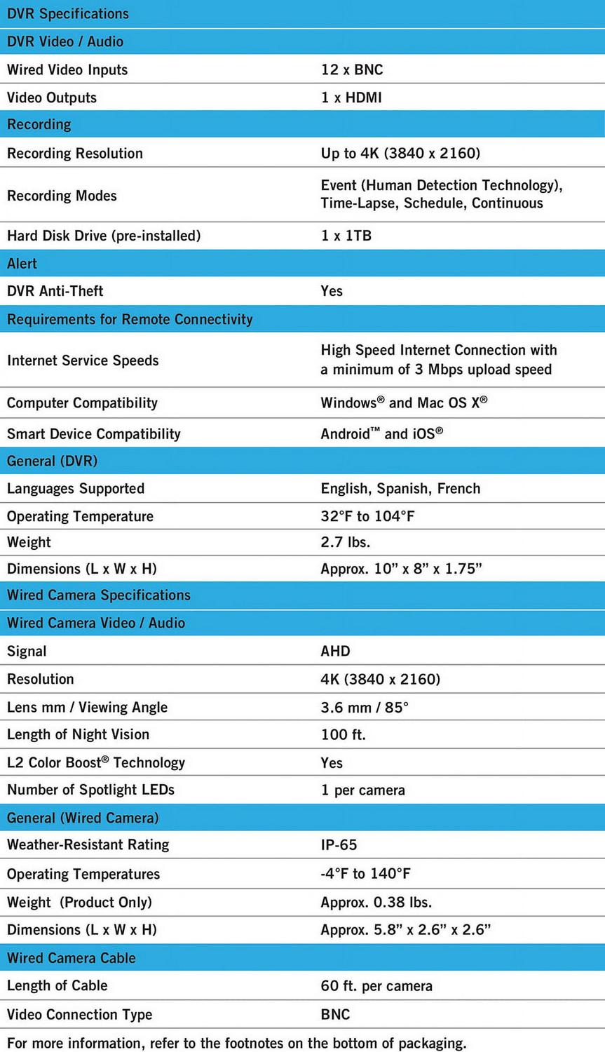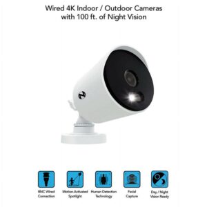Proudly American, Night Owl is excited to offer our U.S. designed and engineered 4K Ultra HD Wired Security System with Human Detection Technology, Motion Activated Spotlights and enhanced security features. The camera s bright spotlight activates when it senses human motion, stopping trespassers in their tracks. Human Detection reduces false alerts to your Smart Device, while Facial Capture takes a snapshot of a person s face and sends you a real-time alert. New to video security systems, 2-Step Verification and Single Sign-On prevent unverified access to your system. How about security for your security There are no fees for storage. Keep everything on the hard drive. You own your recordings! These cameras are for indoor and outdoor and use Color Night Vision to continue recording in full color in dark settings, only switching to Night Vision if necessary. Night Vision up to 100 ft. and wide angle viewing provides extreme coverage for your home or business.