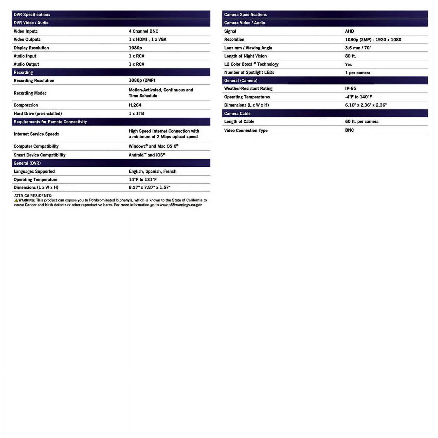Introducing Night Owls 1080p HD Wired Security System with Built-in Motion-Activated Spotlights. At 1080p, you capture recordings with clarity and precision. There are absolutely no fees for storing your recordings. Simply keep everything on the 1TB pre-installed hard drive. A built-in motion-activated spotlight activates anytime one of the 1080p HD Wired cameras senses motion, adding an extra layer of security to your world. This system includes 4 weather-resistant indoor/outdoor cameras that generate 1080p HD video resolution. Additionally, continue recording in full-color video even in low-light settings with L2 Color Boost Technology. As light fades, these cameras provide crisp and clear video in full-color only switching to Night Vision when necessary. Night Vision up to 80 ft. and wide-angle viewing provide extreme coverage for your home or business.