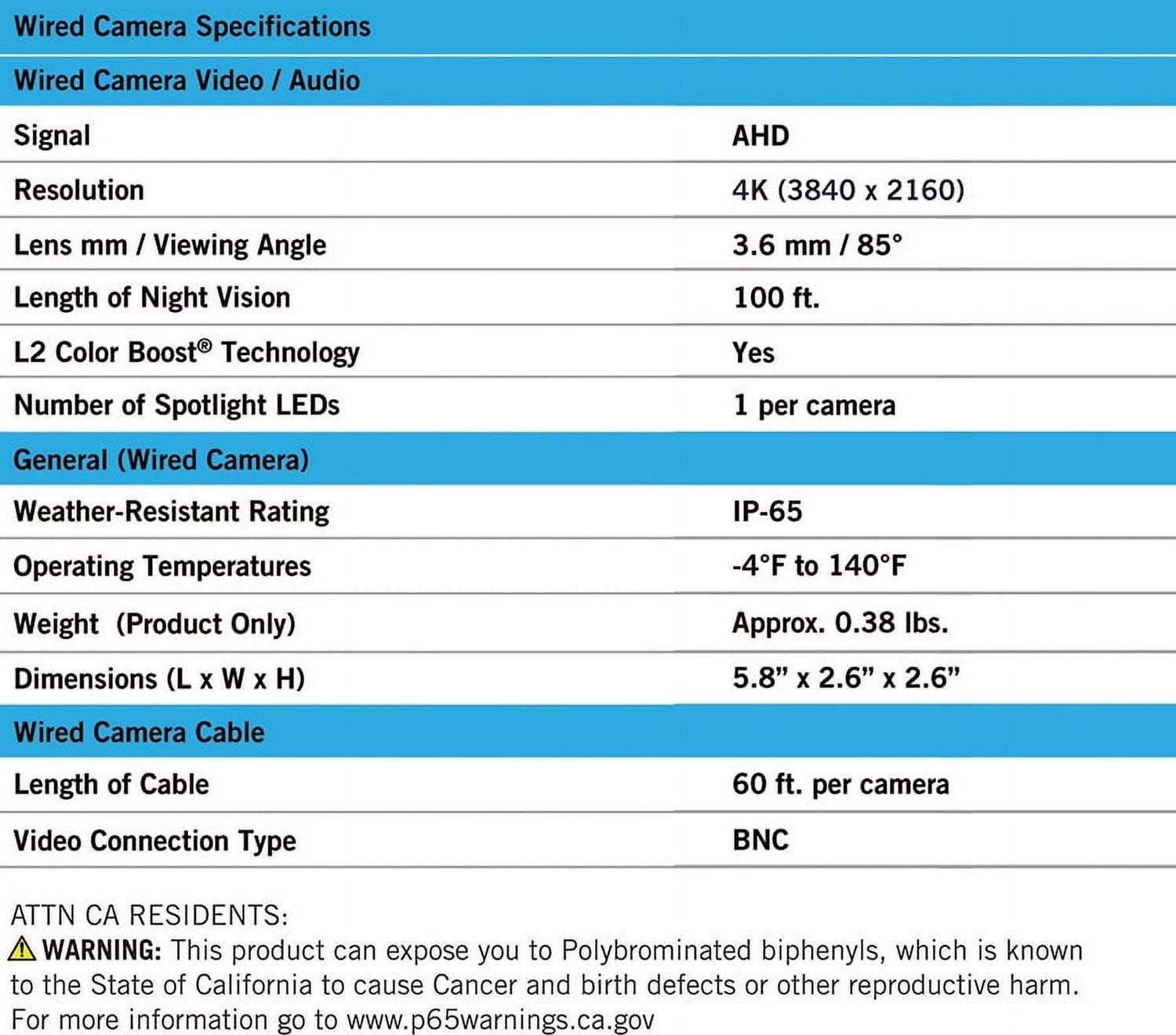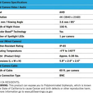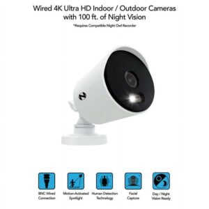 Proudly American, Night Owl is excited to offer our U.S. designed and engineered 4K Ultra HD Wired Cameras with Motion Activated Spotlights and Human Detection Technology. The camera s bright spotlight activates when it senses human motion, stopping trespassers in their tracks. When used with a compatible recorder, Human Detection reduces false alerts to your Smart Device, while Facial Capture takes a snapshot of a person s face and sends you a real time alert. These cameras are for indoor and outdoor and use Color Night Vision to keep recording in full color in dark settings, only switching to Night Vision if necessary. Night Vision up to 100 ft. and wide angle viewing provides extreme coverage for your home or business. Night Owl’s wired technology uses a secure wired connection for real CCTV. A wired connection delivers uninterrupted viewing and recording, providing you with true around the clock protection. When you connect these add-on cameras to your existing recorder, our free remote viewing app for iOS and Android Smart Devices keep you connected and provides easy access to your recordings.