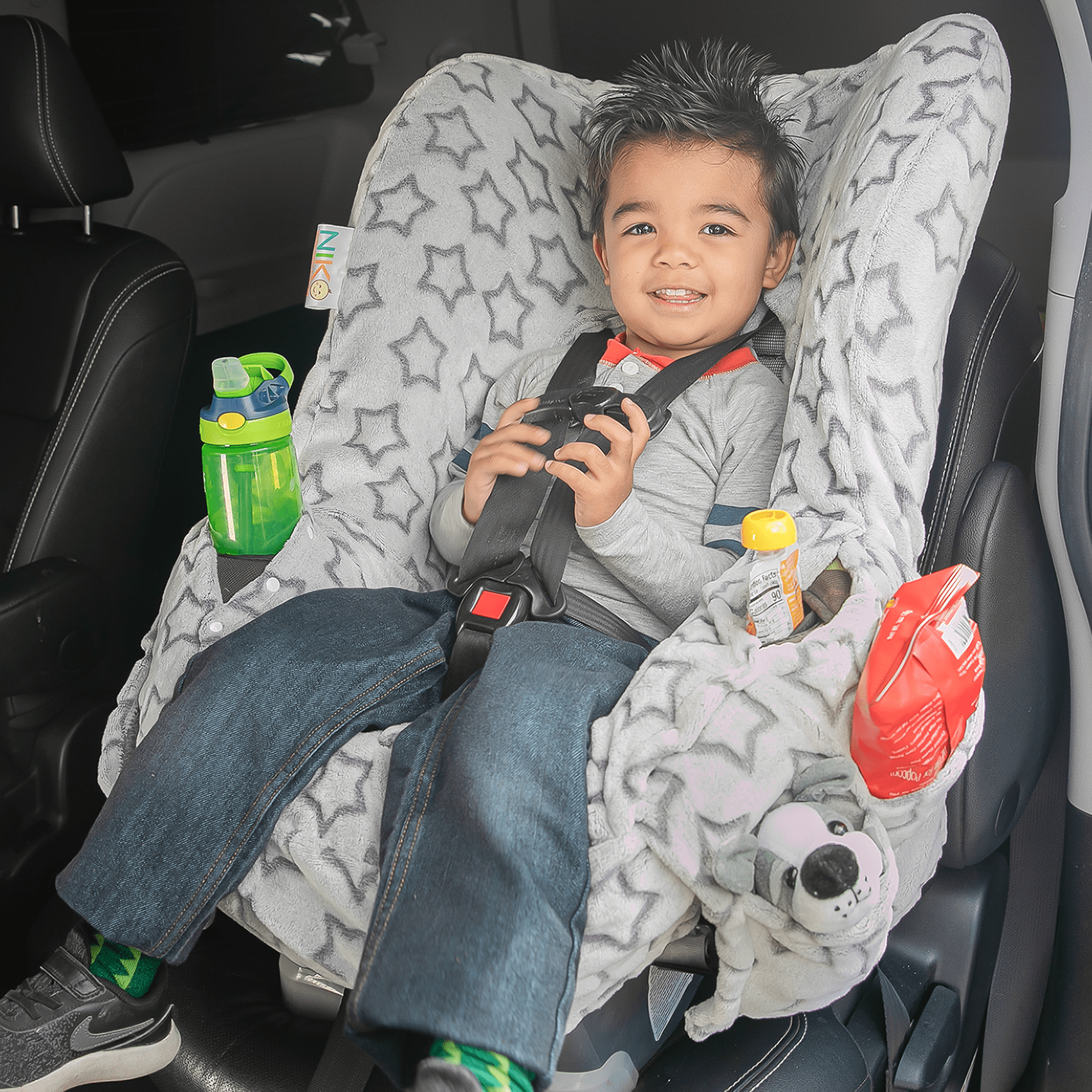 Best for winter, cooler climates or for children that really love being snuggly and warm! Think plushy animal fabric, the unisex NIKO Easy Wash Children’s Car Seat Cover is the answer to a constant problem for many parents and grandparents: sticky, messy, filthy car seats! It’s so easy to put on – literally takes seconds – and when it gets dirty, just pull it off and throw it in the wash! Made with high-quality, super-soft fabric, super-strong elastic, and sturdy double stitching, you can re-use it over and over again! The NIKO was extensively crash-tested by Calspan laboratory to ensure it does not interfere with the safety features of the seat.