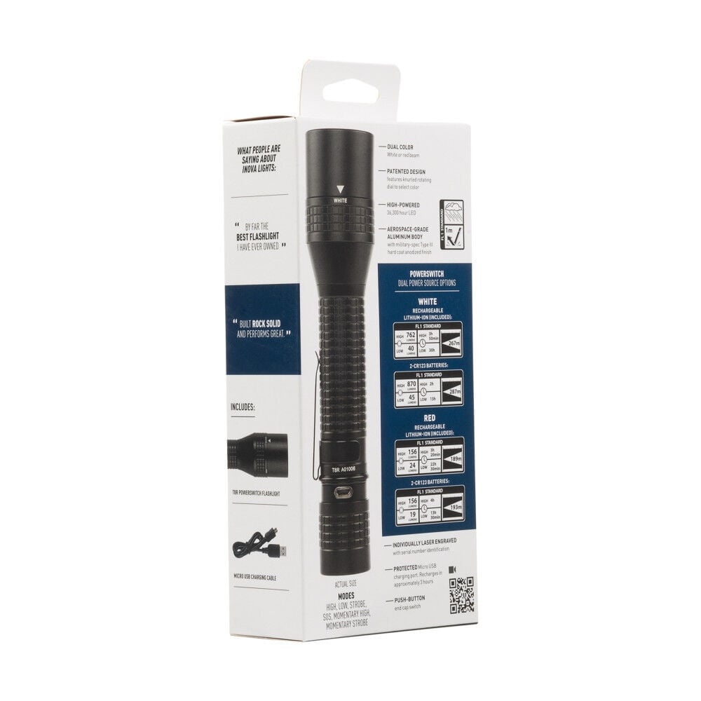 Precision engineered to meet the serious technical and functional needs of professionals everywhere, the Inova T-Series LED Tactical Flashlights offer powerful illumination, handling responsiveness, and tactical grade durability. The Inova T8R is micro USB rechargeable and offers the ability to switch between a powerful 762 lumen white beam or a red beam for preserving night vision. The patented knurled color-select dial makes it simple to switch between white and red beams. With the ability to project a white beam up to 876 feet and a red beam up to 620 feet, this dual-color flashlight is perfect for tactical, outdoor, and home use. Engineered for professional-grade use, the T8R has an end-cap switch that activates High, Low, Momentary High, Strobe, and SOS modes for the ultimate in versatility and performance. The T8R features a rechargeable/replaceable Lithium Ion battery that can be recharged anytime using the included micro USB cable – simply pull the tailcap to reveal the protected charging port. The unique tailcap design can also be extended and locked to create a built-in flashlight stand. With a precision machined, aluminum body featuring a military-spec Type III hard coat anodized finish, the T8R is engineered to be reliable even in the most extreme conditions.