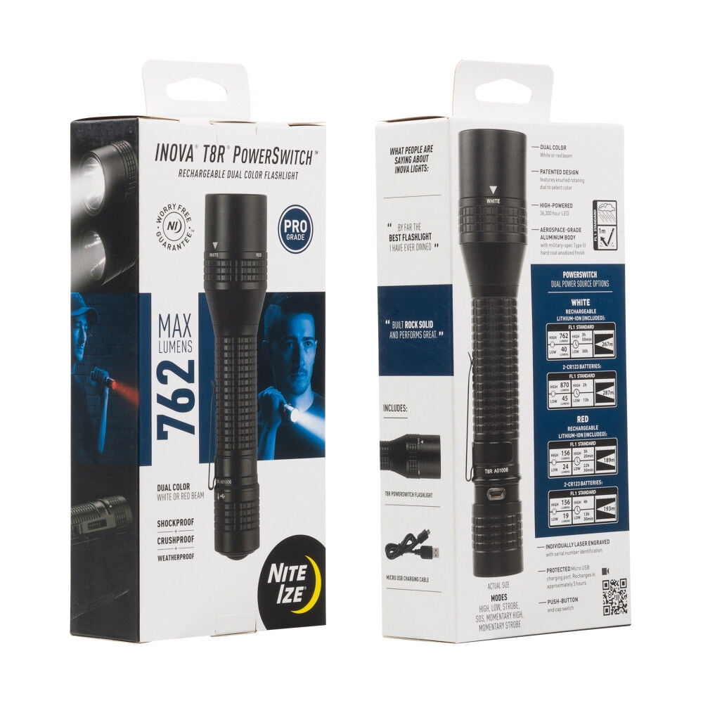 Flashlight with Dual Mode: This tactical flashlight can switch between bright white and red LEDs by twisting the head; the flashlight’s red LEDs can preserve night vision Versatile Flashlight Power Sources: The dual-power source runs on an included micro USB rechargeable or replaceable INOVA Lithium Ion battery or two CR123 batteries Rechargeable Flashlight with Light Modes: The tactical flashlight end-cap switch activates six modes: high, low, momentary high and strobe, strobe, and SOS modes Versatile Flashlight Design: This rugged handheld flashlight has a unique tailcap design that can also be extended and locked to create a built-in flashlight stand About Nite Ize: Our inventor-driven products organize your life, protect your gear, light your way, and creatively solve everyday problems; every product is backed by our Worry Free Guarantee Do NOT charge flashlight when it contains any batteries besides the INOVA Rechargeable Battery (Part #: PSRBA).
