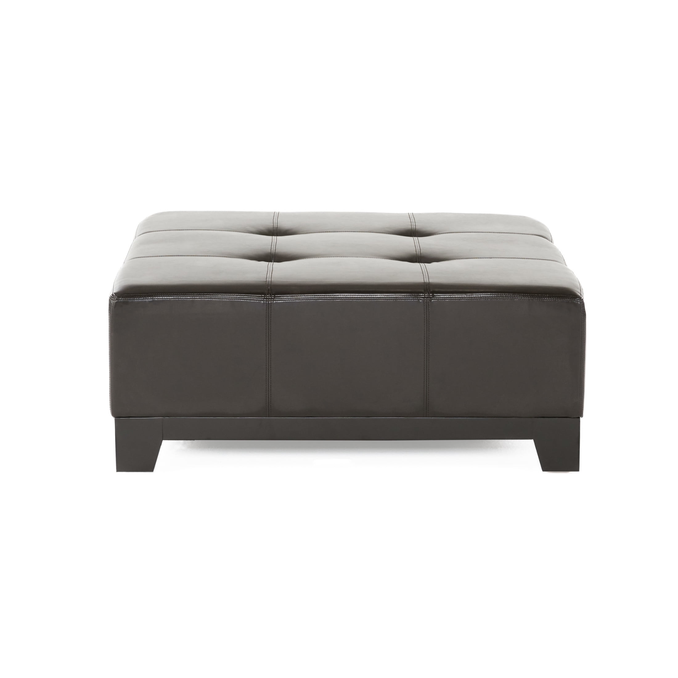 Includes: One (1) ottoman Wooden frame and legs with an espresso brown finish Espresso brown bonded leather upholstery Padded foam fill Button-tufted top Works as a coffee table, footrest, or as additional seating Dimensions:39 inches long x 39 inches wide x 16 inches high Weighs approximately 44 pounds