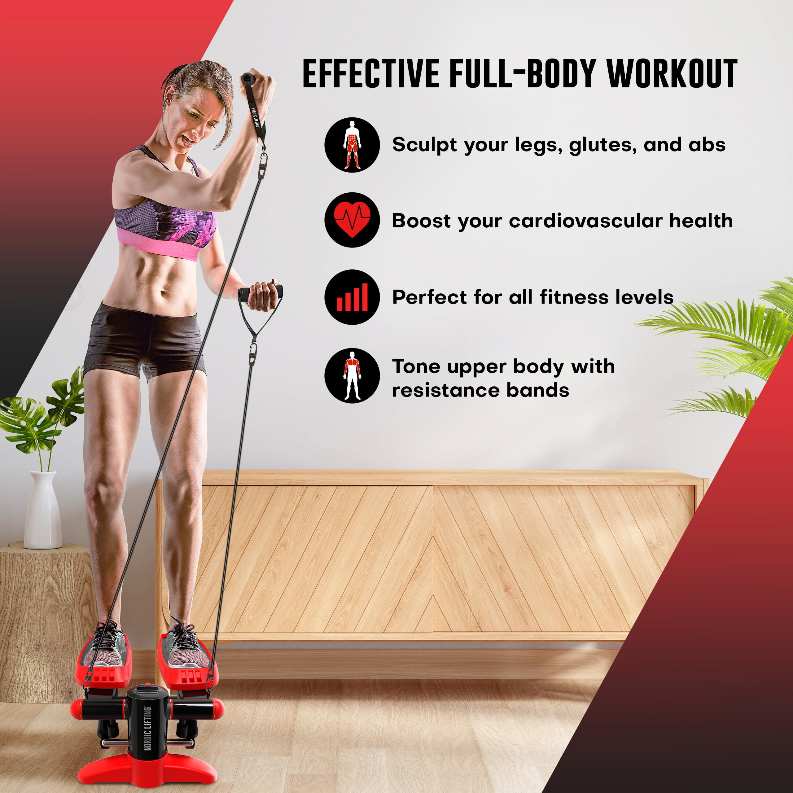 Premier and Functional Mini Stepper for Convenient Cardio Exercise Built with your convenience in mind, the Nordic Lifting mini stepper is a functional cardio machine that is compact and portable, making it easier for you to set it up anytime, anywhere. This handy foot cardio machine has a maximum weight capacity of 286 lbs and comes with resistance bands in three sizes for a more challenging exercise: (20 inches = 25 lbs, 28 inches = 20 lbs, 39 inches= 15 lbs) We offer a +1 year extra warranty for your mini stepper. Simply use the included registration card to extend your warranty to 2 years. Full Cardio Workout, Mini Cardio Stepper Machine Small,built-to-last and structured for you to perform a full cardio workout without occupying too much space in a room. Our mini stepper features a non-slip dotted rubber mat, a sturdy balance bar drive and hydraulic cylinder so you can exercise without worrying about mishaps and accidents. Thi