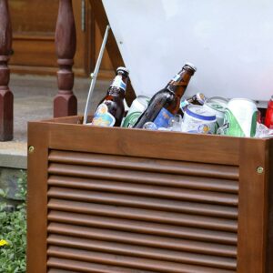 This cooler features double-wall plastic insert to maintain temperature of your drinks on a hot day. The wooden patio cooler does come fully assembled. Also features handles which are added on both sides for added convenience during use. This wooden patio cooler offers stylish design while providing functionality. This piece is a prefect addition to any patio or outdoor space!
