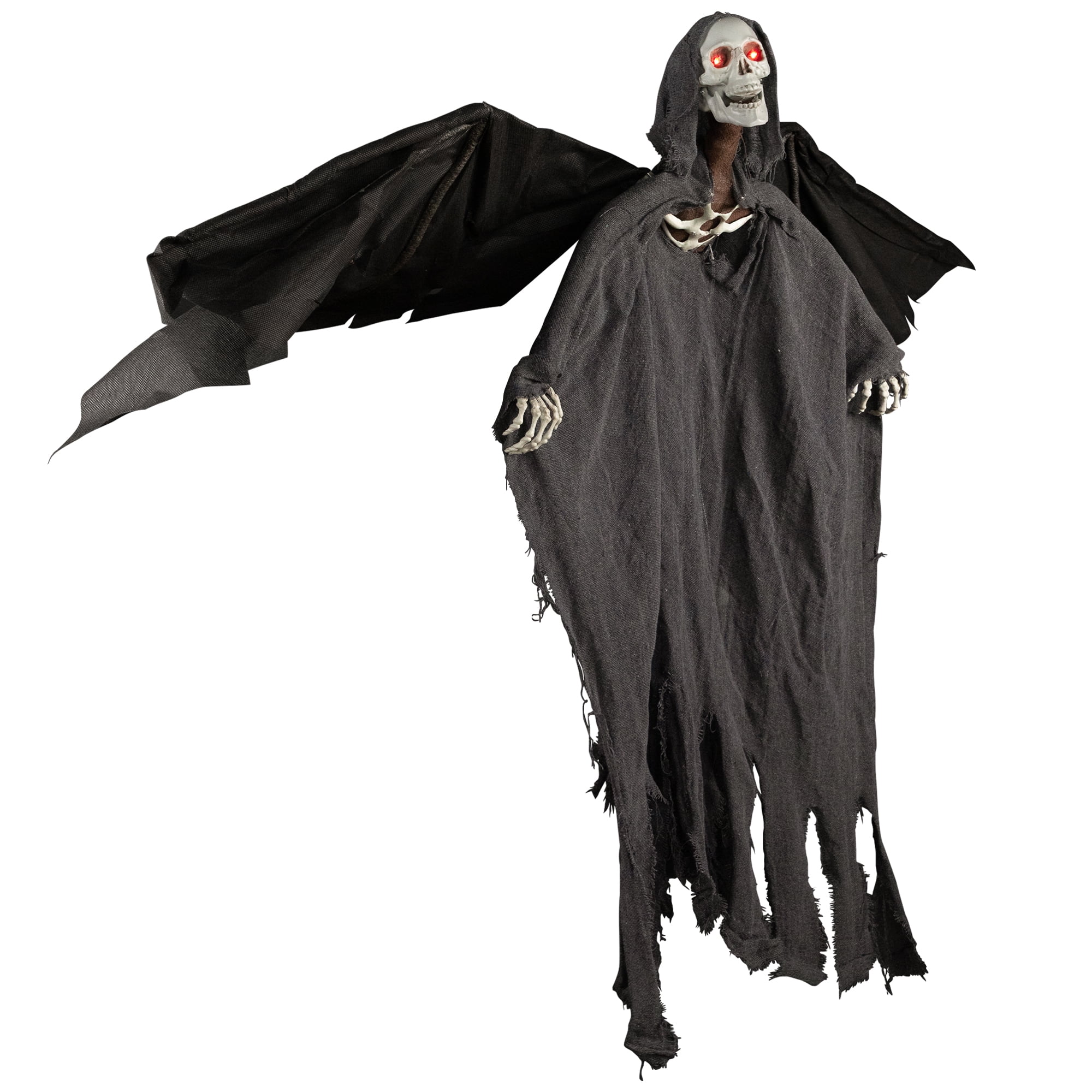 Hanging animated reaper Halloween decoration Eyes light up; wings and hands move while he laughs maniacally Reaper is both touch and sound activated; Comes ready for hanging Reaper designed with skeletal fingers and face; For indoor or covered outdoor use Measures 42 inches by 50 inches wide by 7 inches deep
