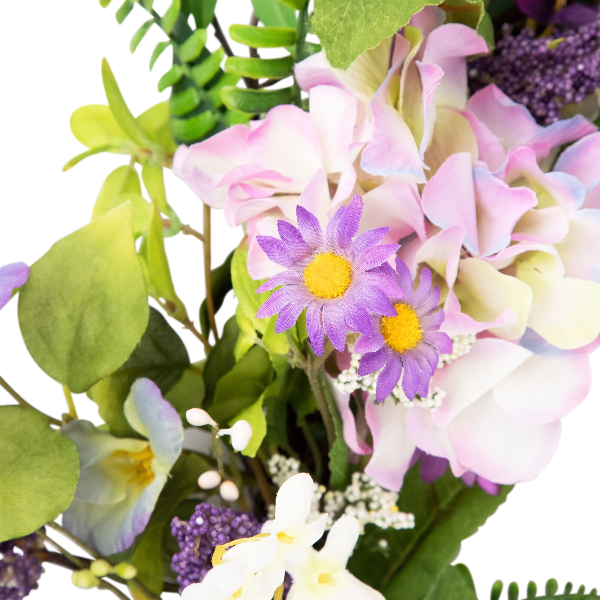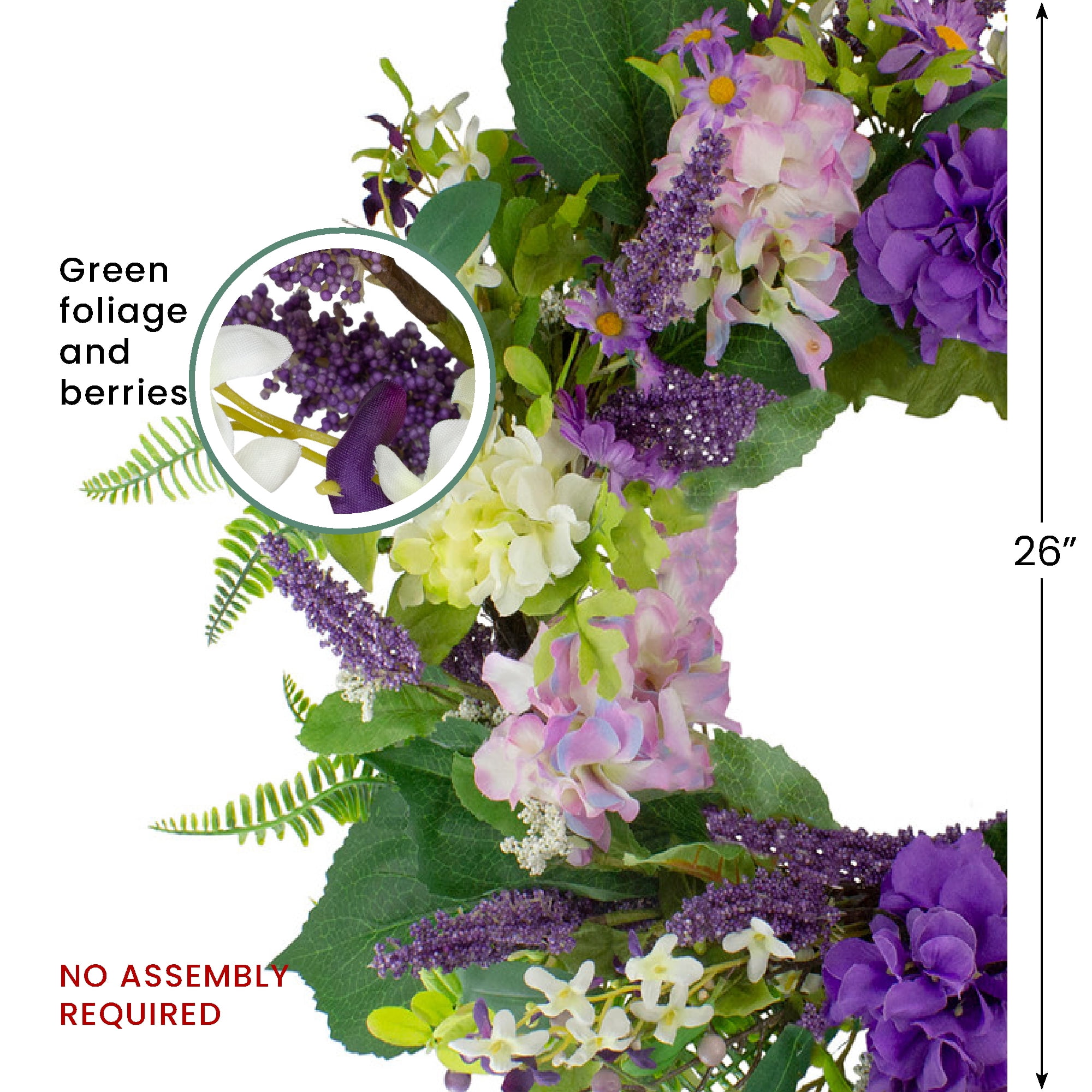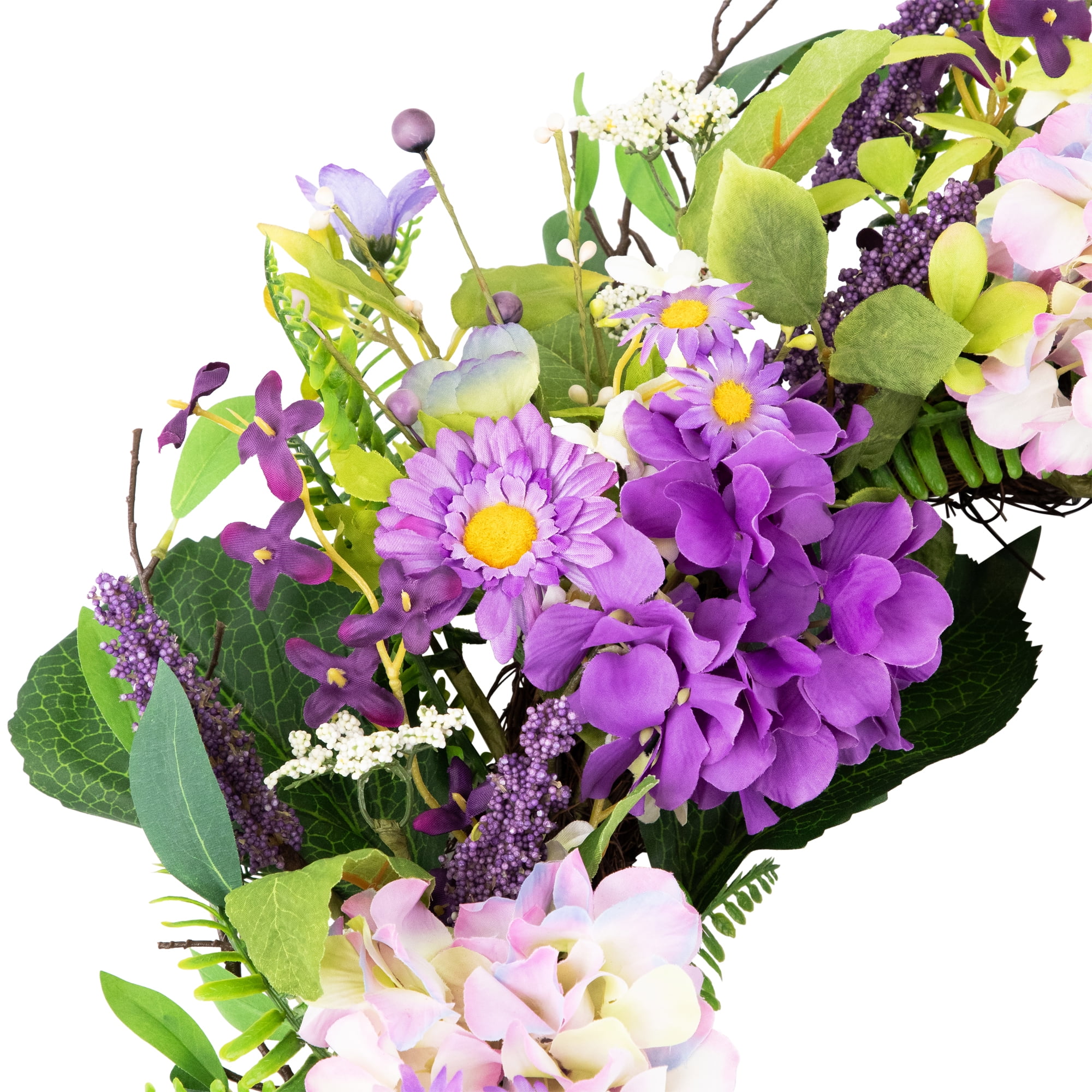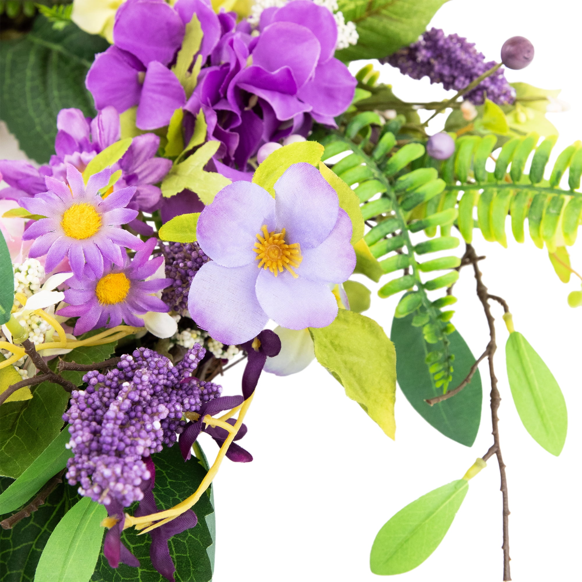 Floral spring hydrangea and fern wreath Small purple and white flowers throughout Purple berries and small pip berries accent this wreath Hangs on a natural round twig grapevine Measures approximately 26 inches in diameter by 6 inches deep