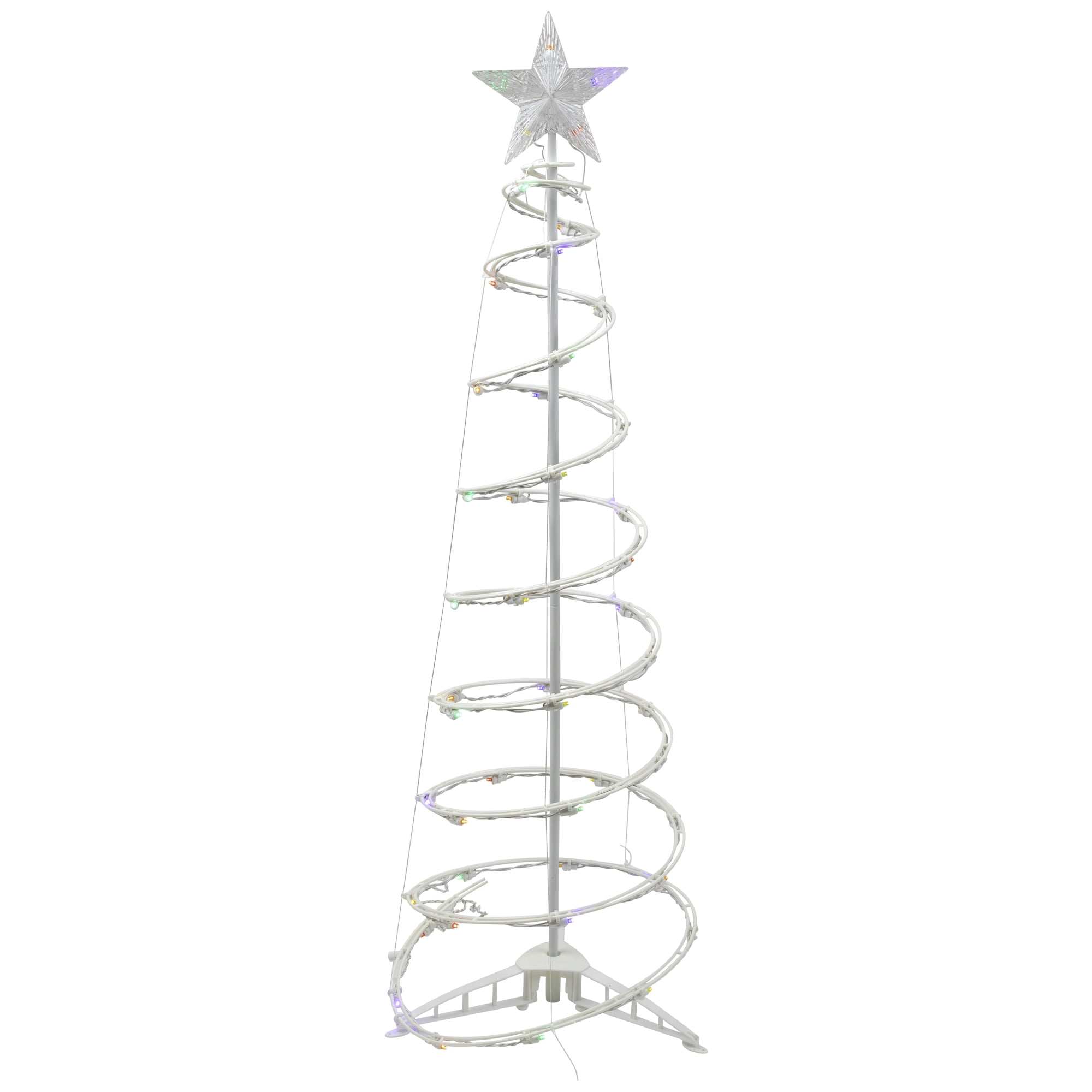 White spiral Christmas tree outdoor yard decoration Designed with a clear star tree topper and multicolor lights 50 concave wide angle LED lights; replacement bulbs and spare fuse included Quick and easy assembly; UL certified for indoor and outdoor use Approximately 4 foot high by 16 inches in diameter