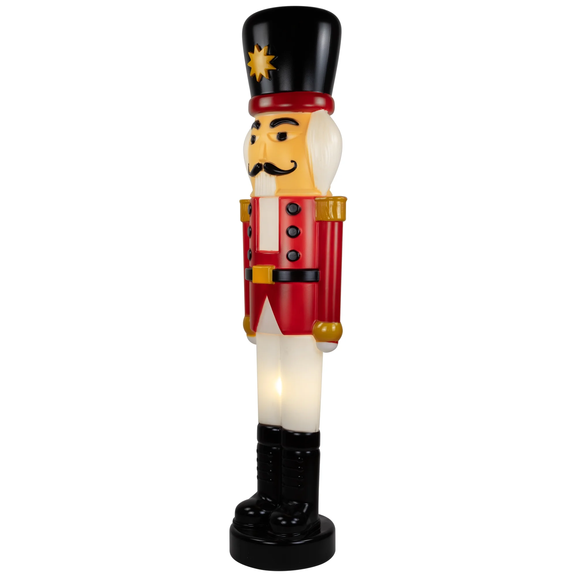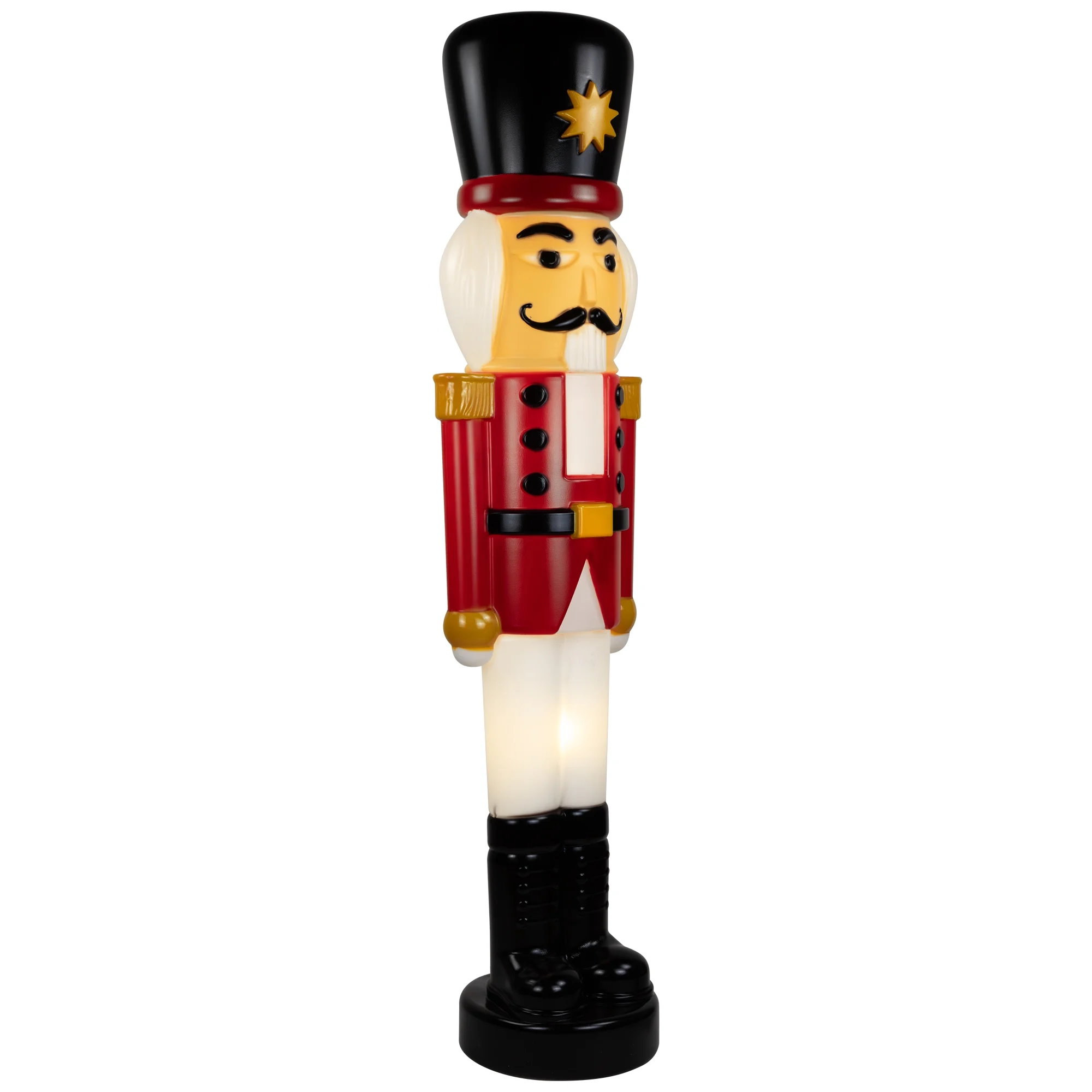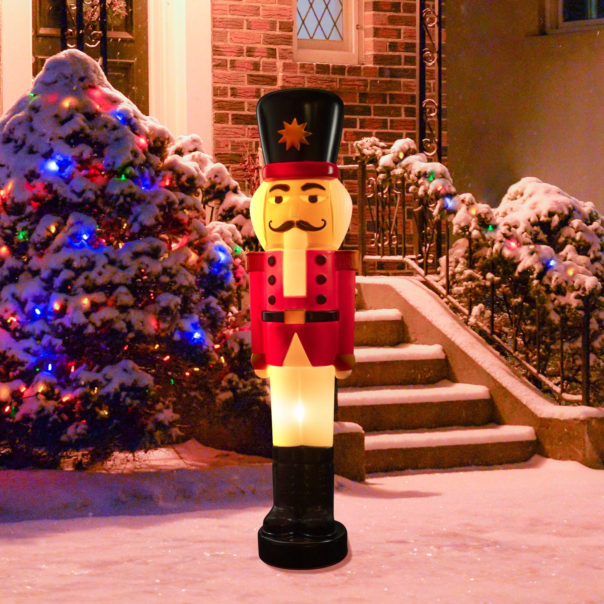 Nutcracker soldier outdoor Christmas decoration Retro-style blow mold construction Lighted with 2 clear C7 incandescent bulb UL approved and certified for indoor or outdoor use Measures 59 inches high by 15 inches wide by 11.5 inches deep