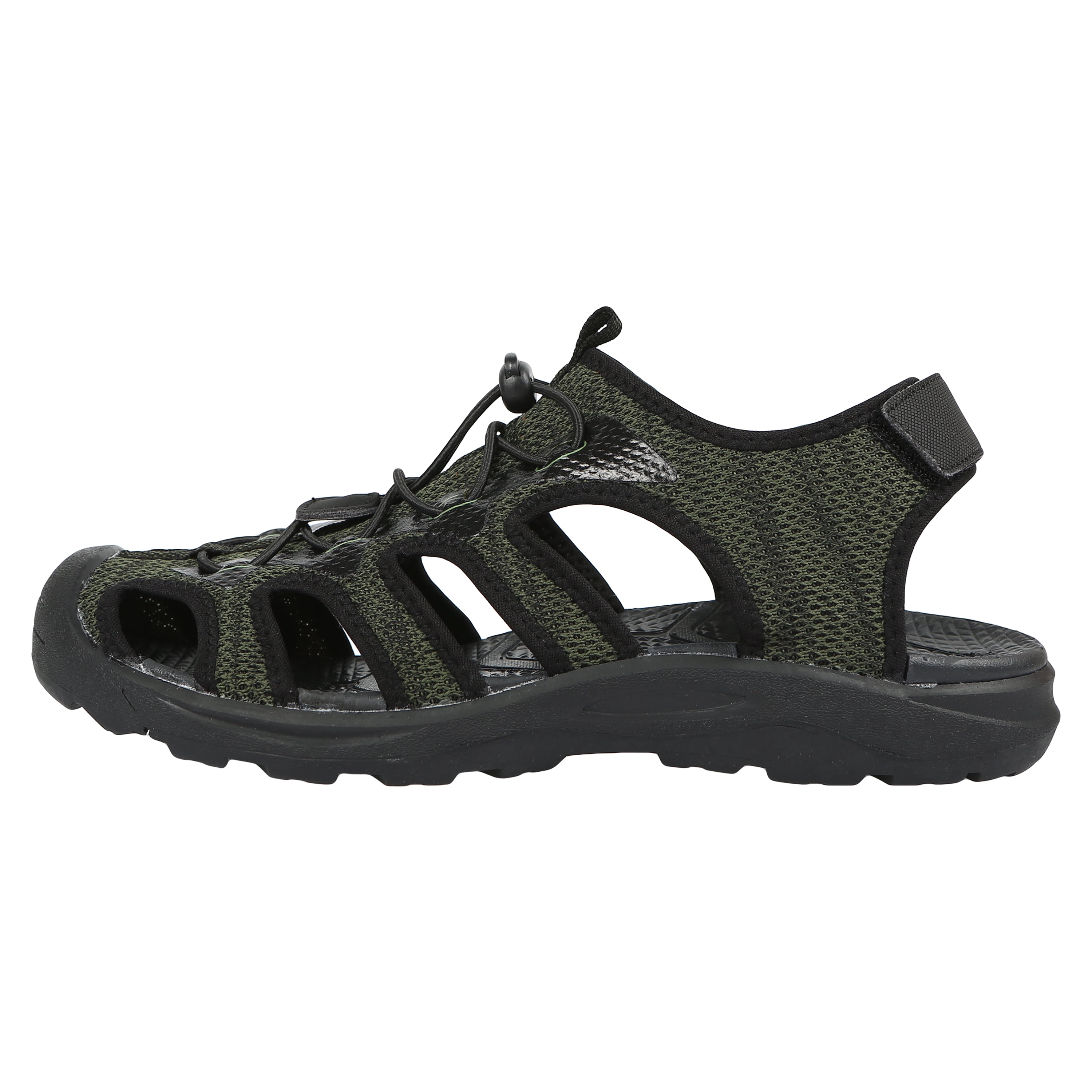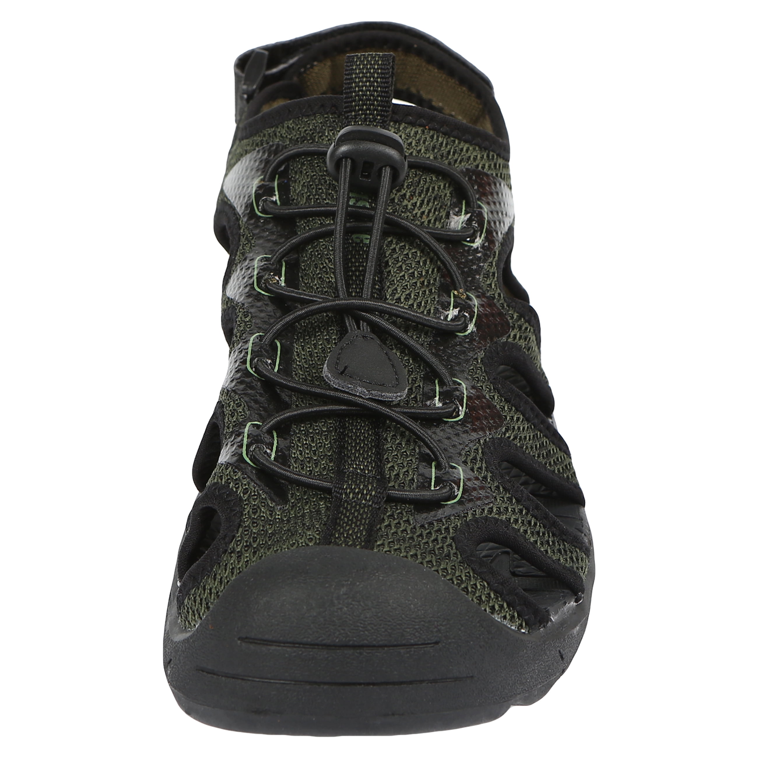 This closed toe sandal has a lightweight quick dry knit upper that allows for reliable breathability. Lightweight compression molded EVA insole provides all day comfort. Elastic drawstring lacing system and adjustable heel strap keep feet secure while making it easier to get on and off. Synthetic rubber toe cap protects feet when hiking, biking, and more. Durable multi-directional rubber traction outsole ensures reliable traction for any activity.