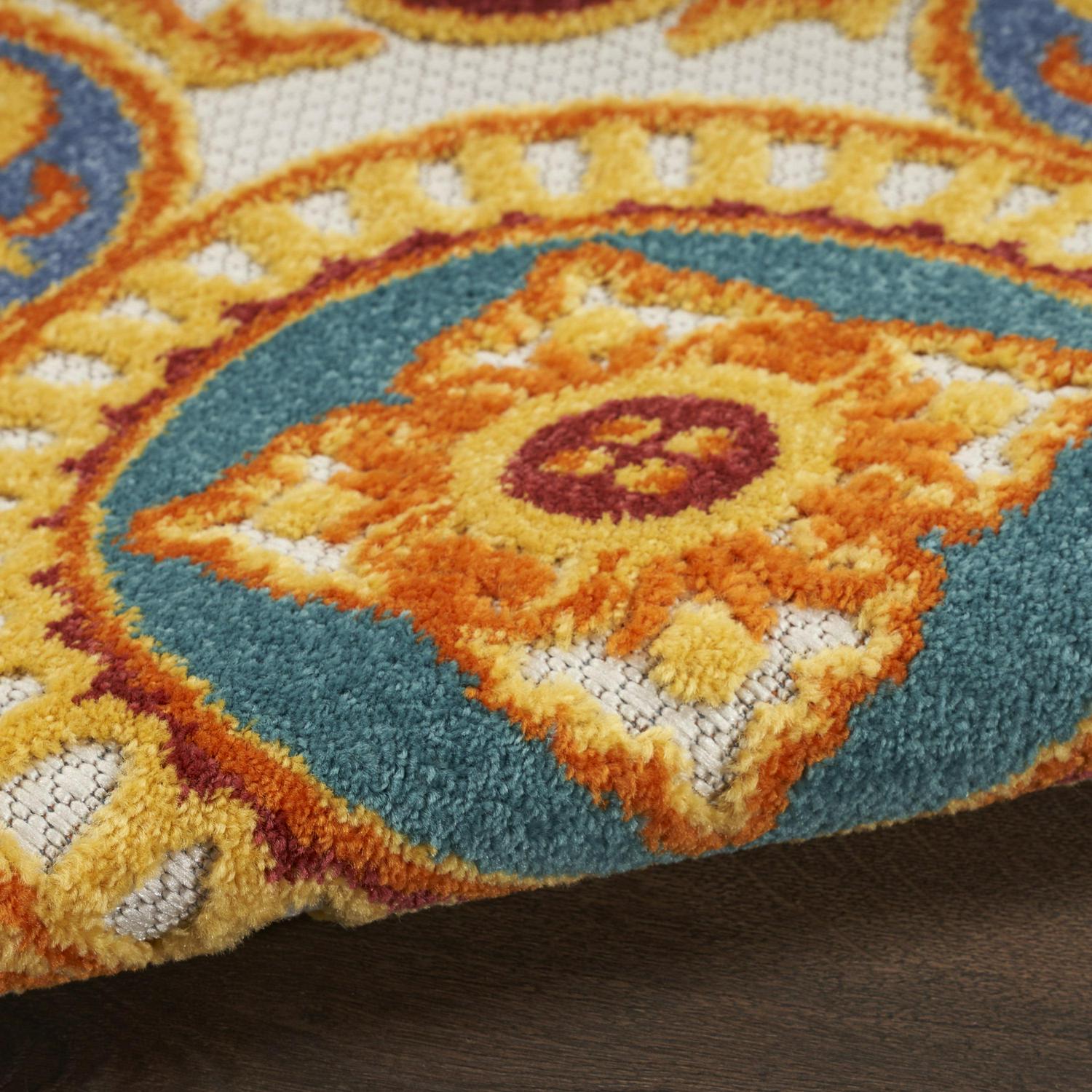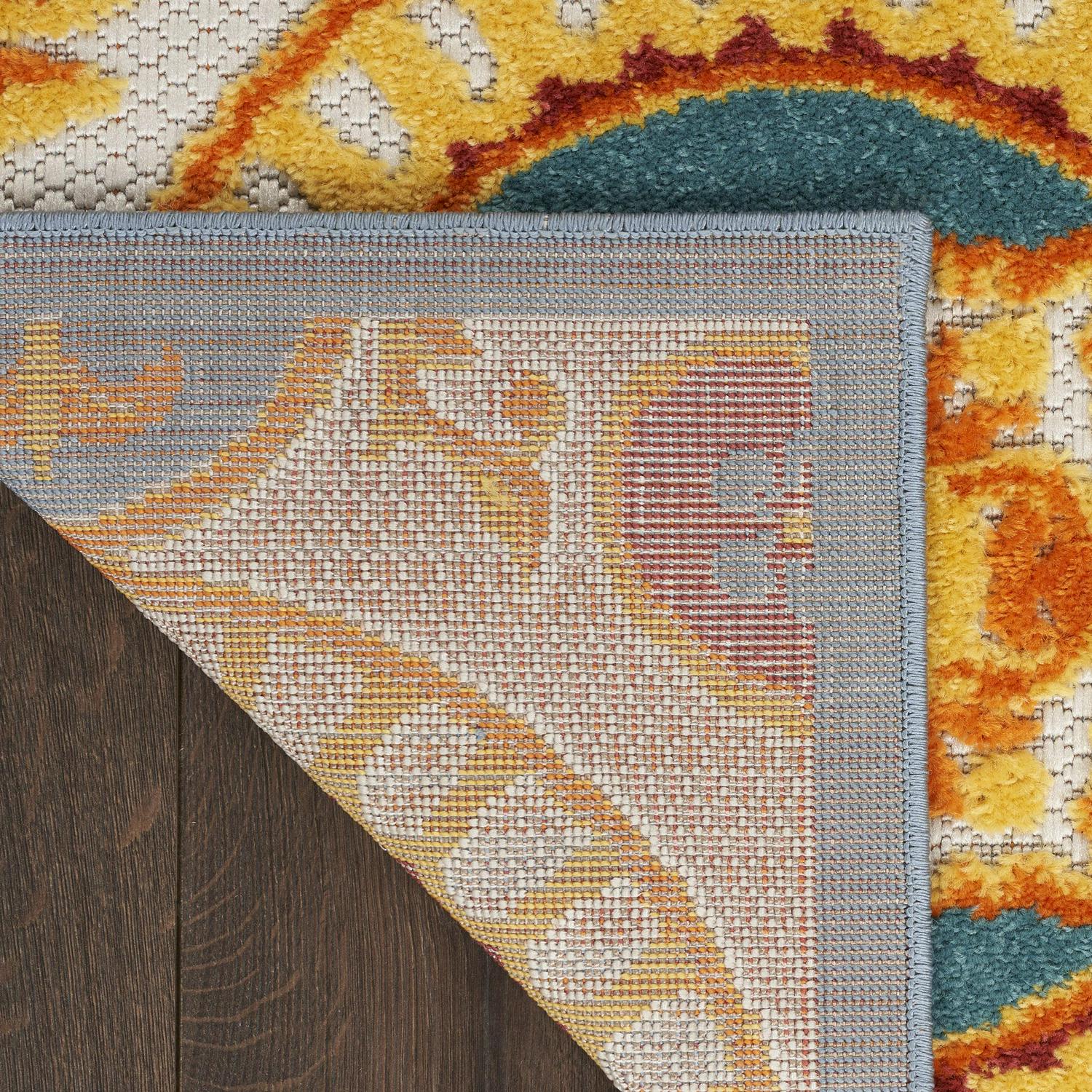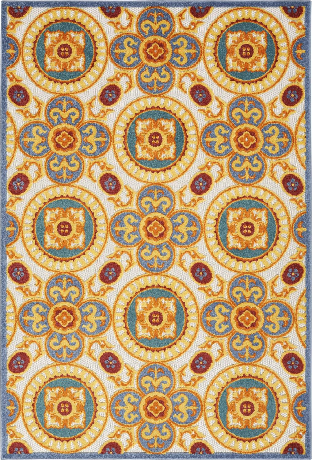This sunny and sensational collection of flat-woven indoor/outdoor rugs is pretty, practical, and perfect for high-traffic areas. With its inviting assortment of classic and contemporary designs, tempting color palettes, and terrific textures, these multipurpose rugs will afford an air of simple sophistication to any environment. Transform your space into an elegant retreat with this outdoor rug from the Aloha Collection. The oversized Spanish tile pattern evokes feelings of relaxation and ease, with a beautifully pigmented multicolored palette and subtly raised texture that draws the eyes. Machine-made from polypropylene for durability in a flatweave construction that s easy to clean: simply hose rinse and air dry.