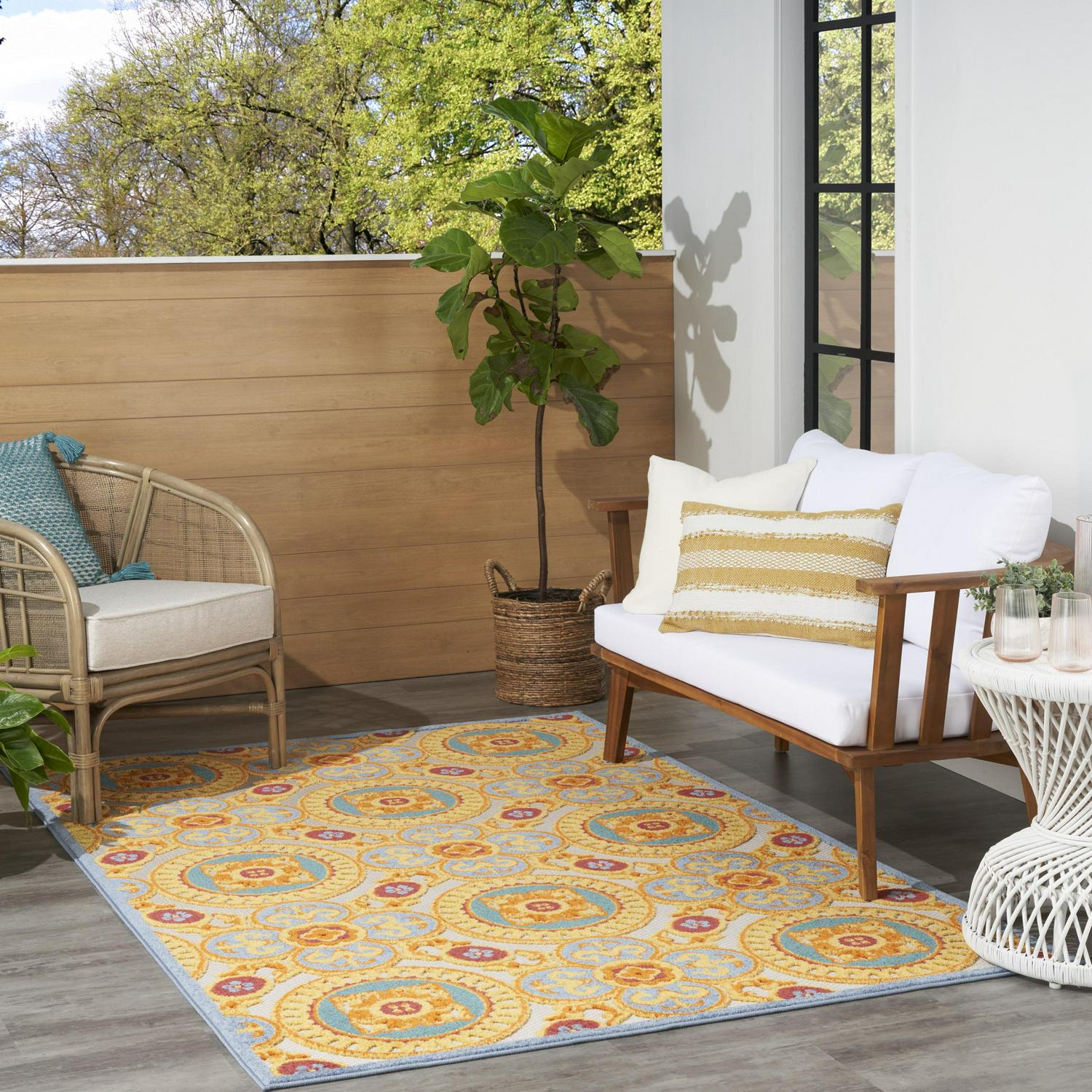 - Global-inspired outdoor rug adds a relaxed, laid-back vibe