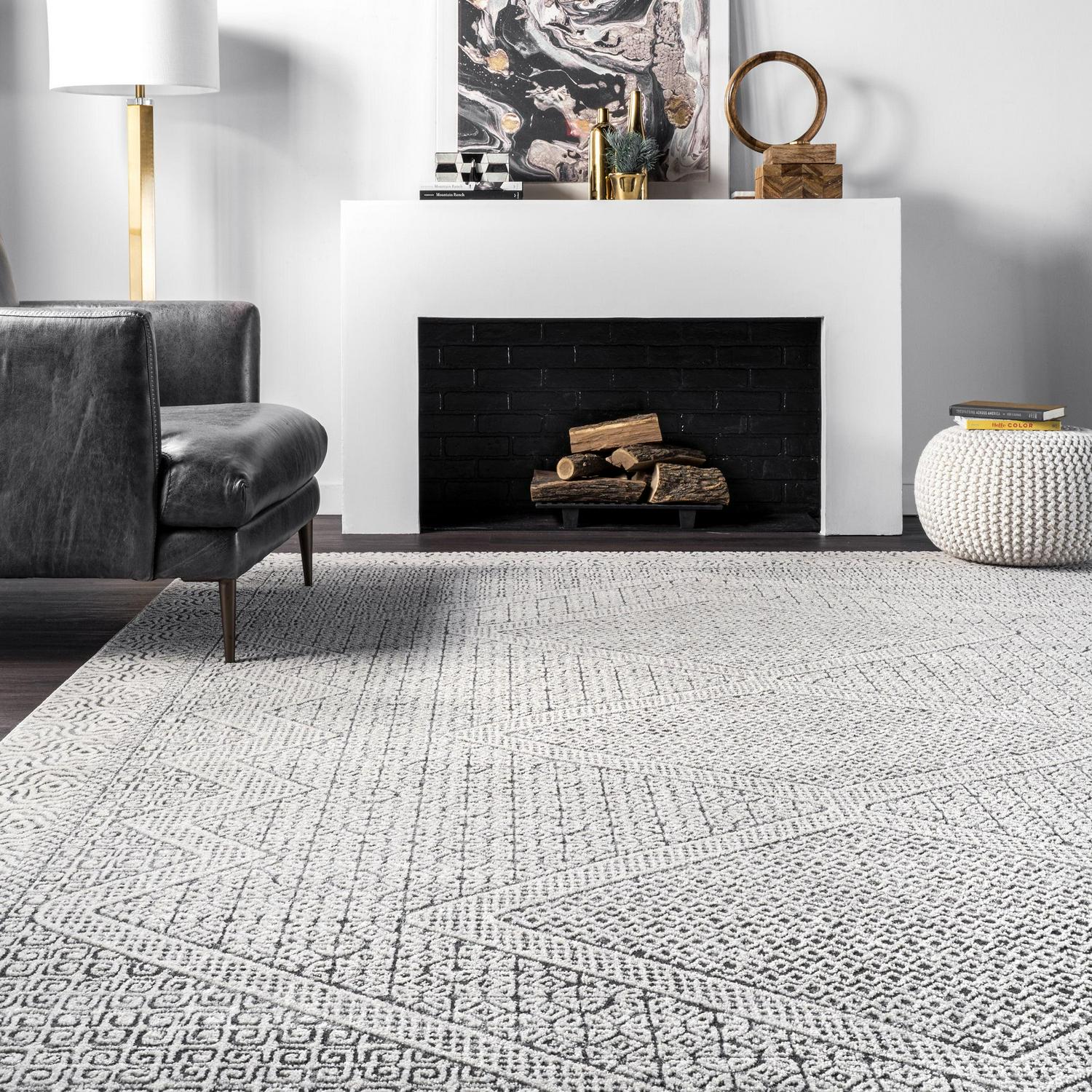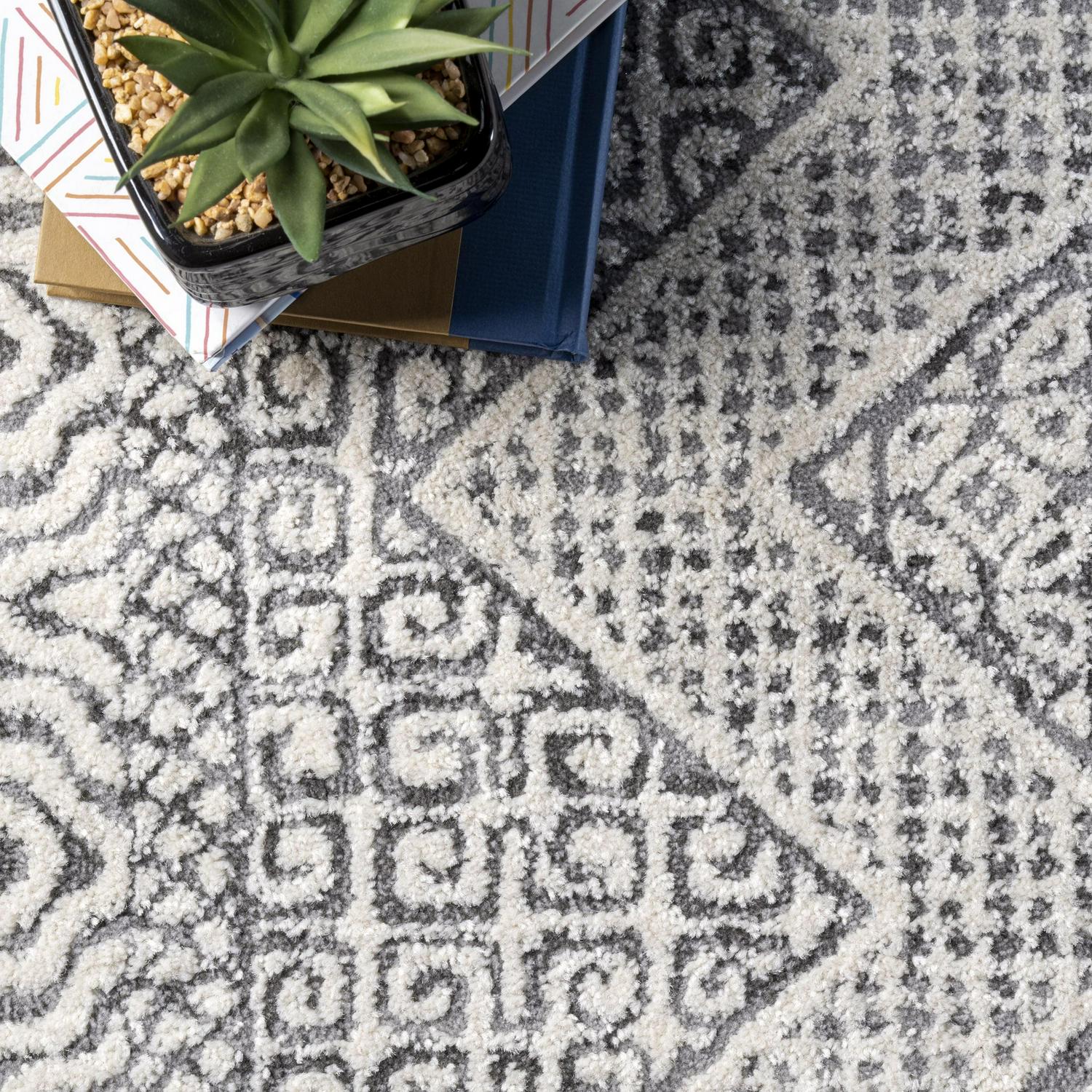 Make a statement with this transitional Moroccan area rug. The intricate geometric motifs make it an ideal enhancement to a modern aesthetic, while also being able to pair with farmhouse designs. Machine made in Turkey from durable soft fibers, this floor covering is built to last while feeling delightful underfoot. Your dream home awaits with our pet-friendly and easy to care for area rugs.