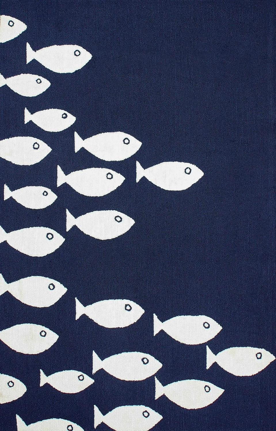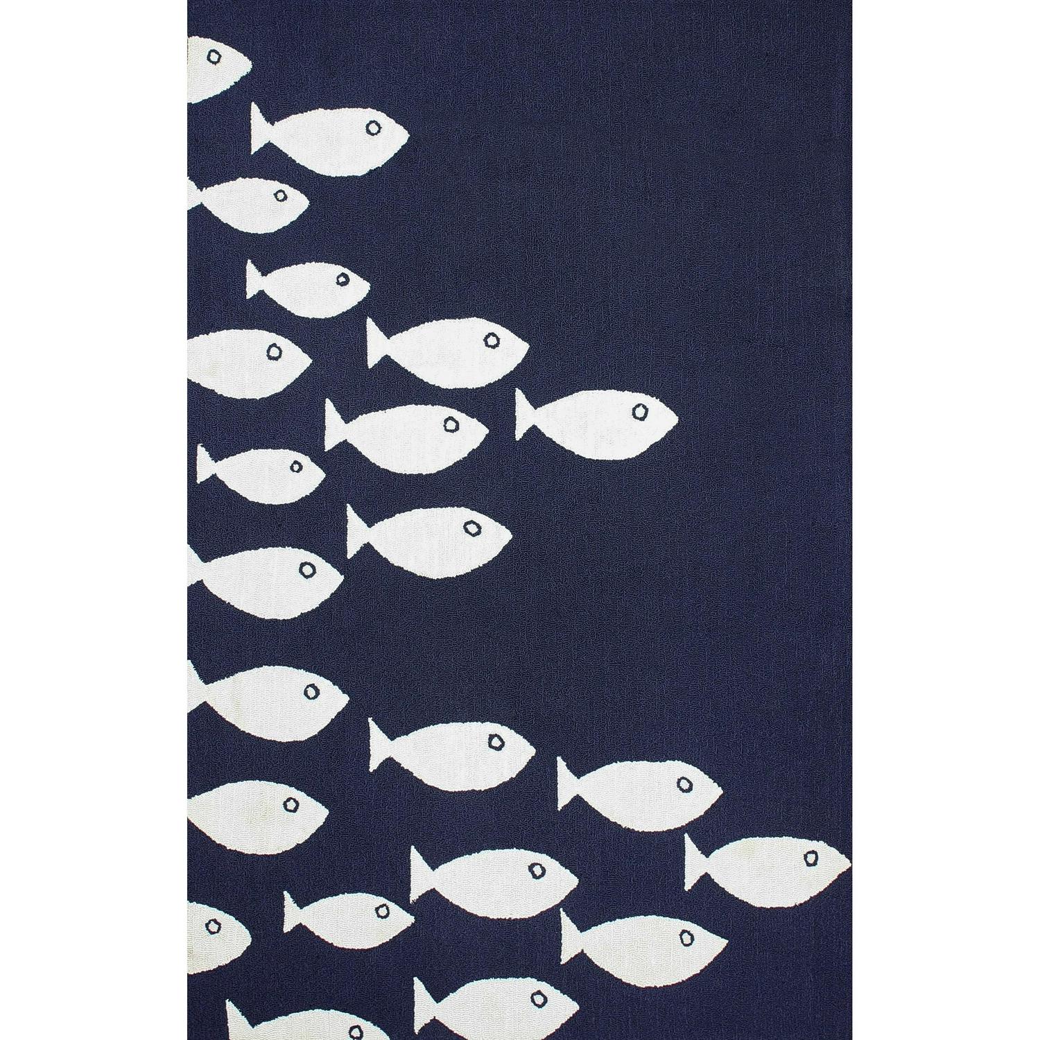 A school of white fish swim against a navy ground on the Nuloom Vivienne Indoor/Outdoor Area Rug. This hand-hooked area rug is made of weather-resistant polypropylene for use indoors or out. Size options ensure a perfect fit for your space.