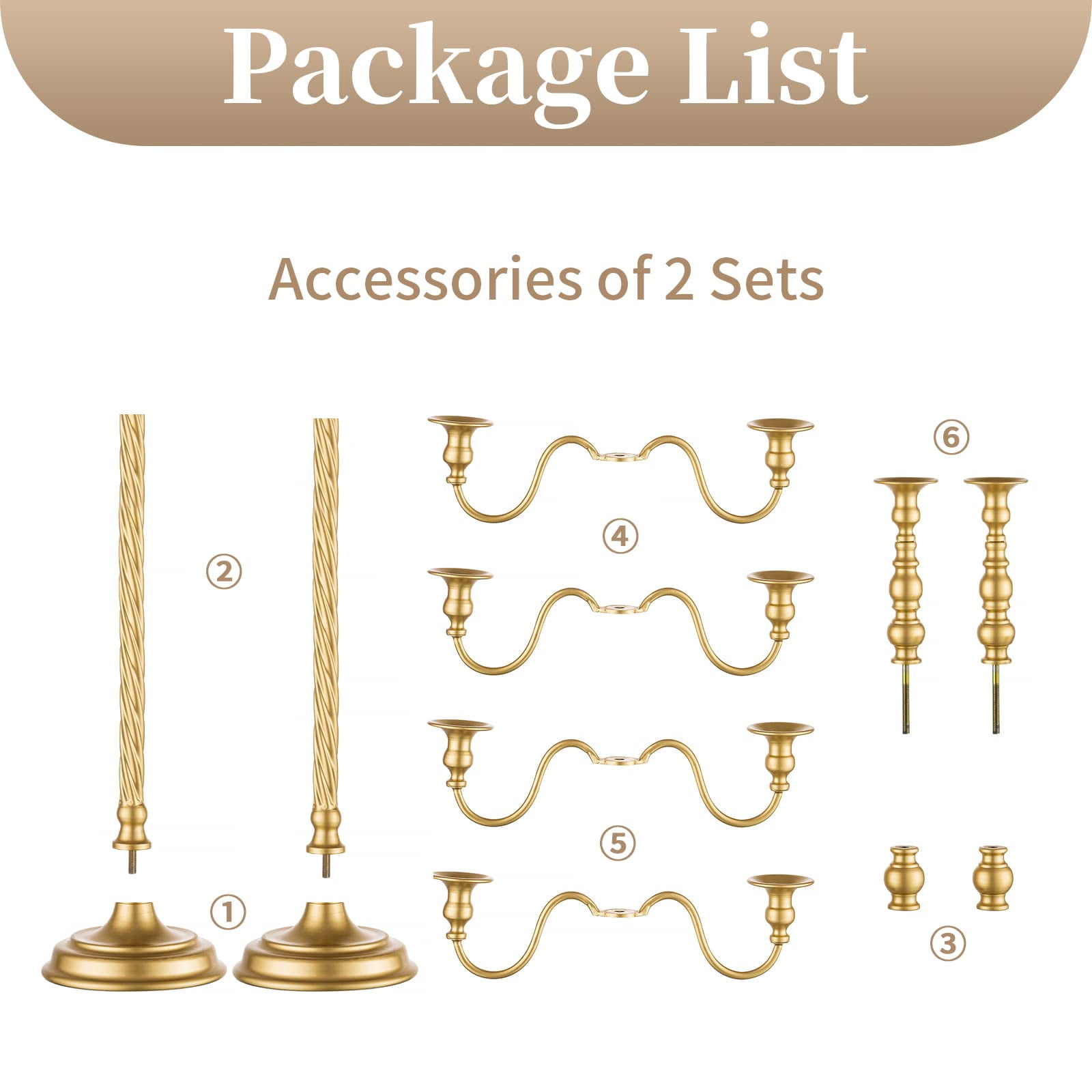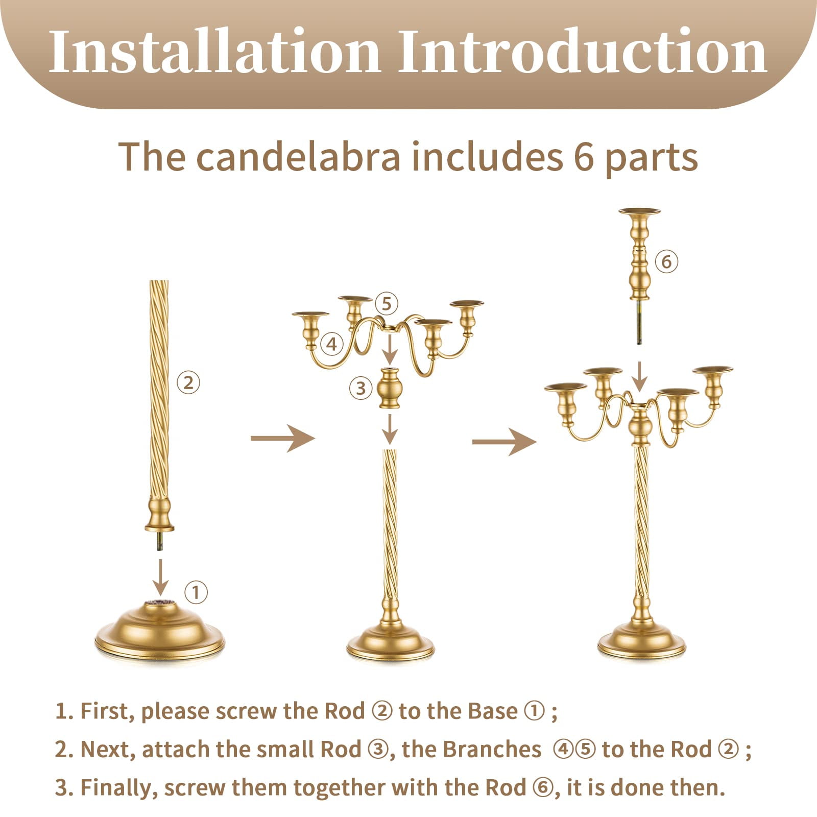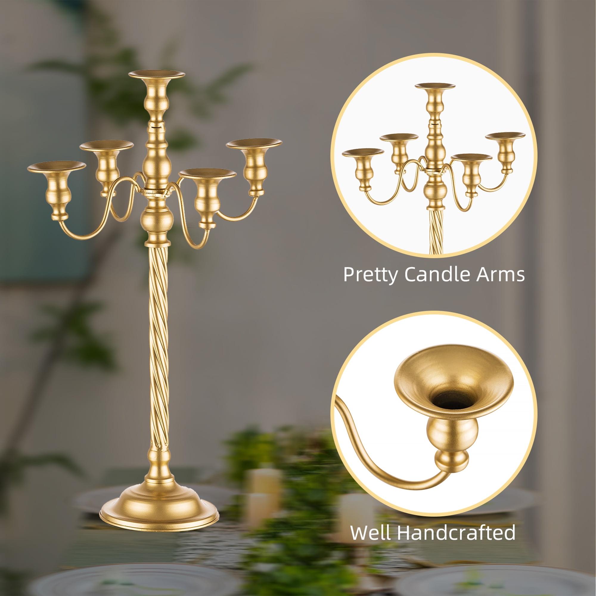 At Nuptio, everything is about wedding. Nuptio Gold Candelabra with scroll-branch and classic pedestal, adds vintage vibe and romantic glow to the place where it sits. Gold Candlestick Holder comes in 2 sizes, measures 21 inch and 28 inch tall, will add proper dimension to your table decor. The wedding candelabra with 5 arms makes it more than a candle holder; with candles, you can also decor along the arm flowers for stunning centerpieces for your event wedding tables or to brighten up your dinner table. The gold candle holder will add grandeur to your scene, no matter for wedding decor, glorious and festive holiday decor, events or anniversary or sweet table decor.