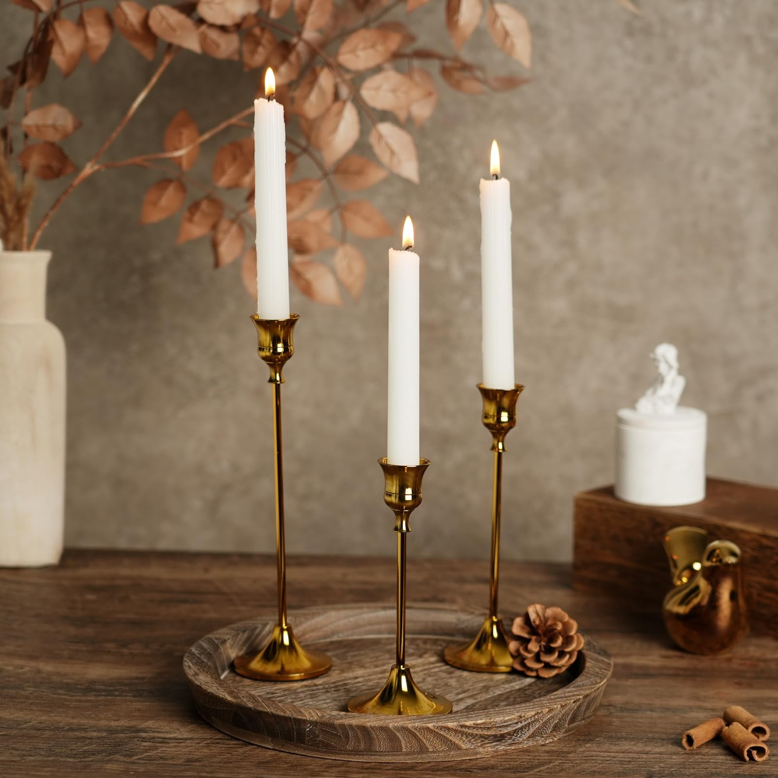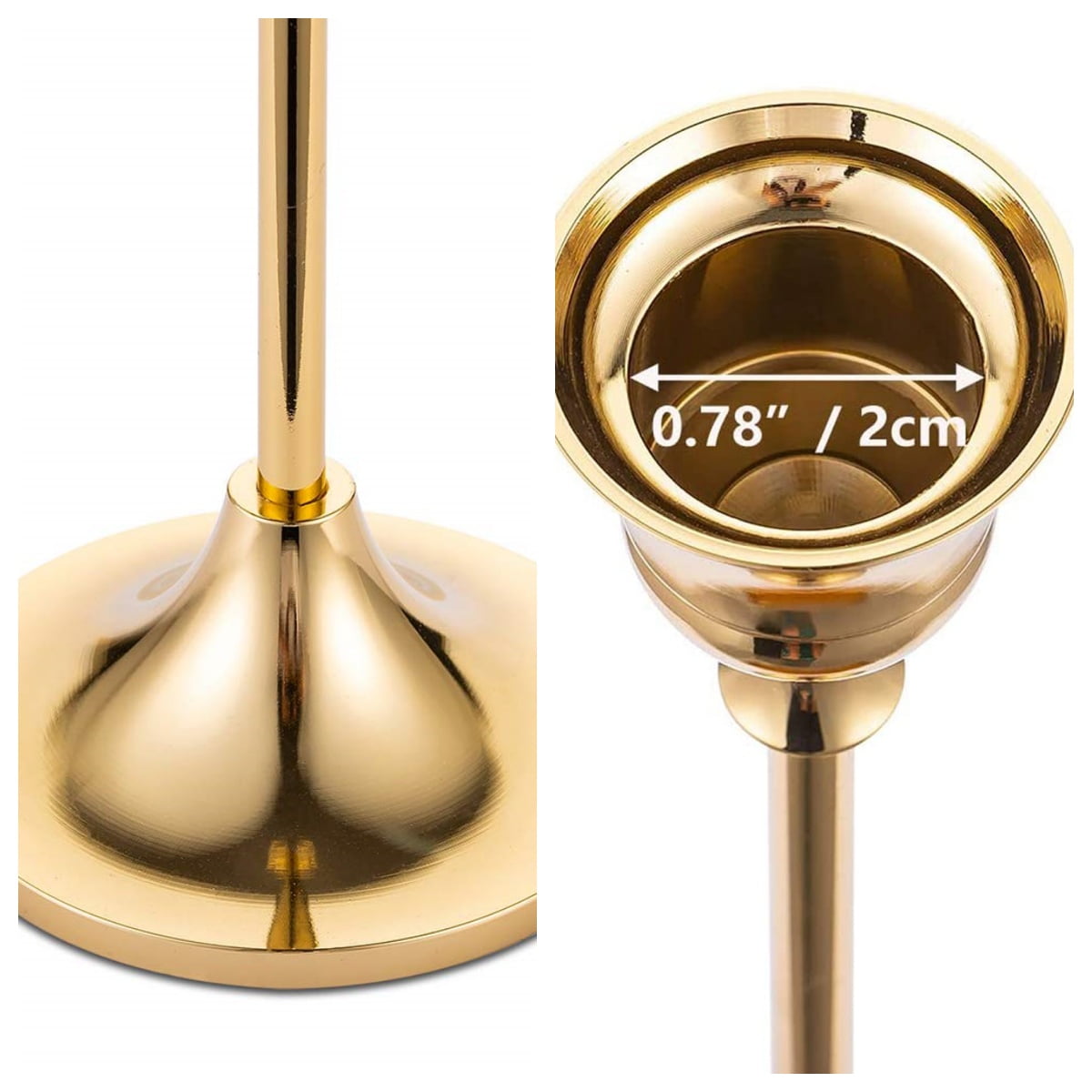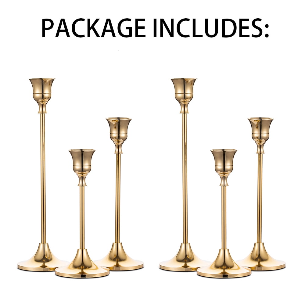 Packageincludes: Size: S: 5.9”(15cm) & M: 7.3”(18.5cm)& L:9.3”(23.5cm) height, 2.7”(6.8cm) base diameter.Fits normal size3/4 inch thick taper candles or LED candles.2 set (2S+2M+2L) brass gold candleholders for table centerpiece. Candles are not include. Elegantdesign: Candlestick holder made of high quality aluminum alloy witha good weight. Surface has been polished and electroplated several times tomake it have good corrosion resistance.The bottom is lined with felt so itwon’t scratch your surfaces. Itfeels like being in a upscale restaurant when the candle islighted. Modern& Chic: single-head metal gold candlestick holder in brassfinish were inspired by Mid-Century design. Ideal for adding timelesselegance to your mantle, dinner table or special event. It can bedisassembled, which is more convenient for cleaning and storage, and prolongs the service life of the candleholder Applications:Ornamentsfor birthday, candlelight dinner, dining room, living room, parlor, study andbar. Great choice for celebrating, day of commemoration, creating atmosphere,housewarming gift, nice metal candelabra. Customercare: Nuptio always put customer satisfaction in our top-priorityposition, each customer who buys products from our store can enjoy a one-yearwarranty. If you have any problems with our products or services, please don’thesitate to contact us, we’ll getback to you within 24 hours.