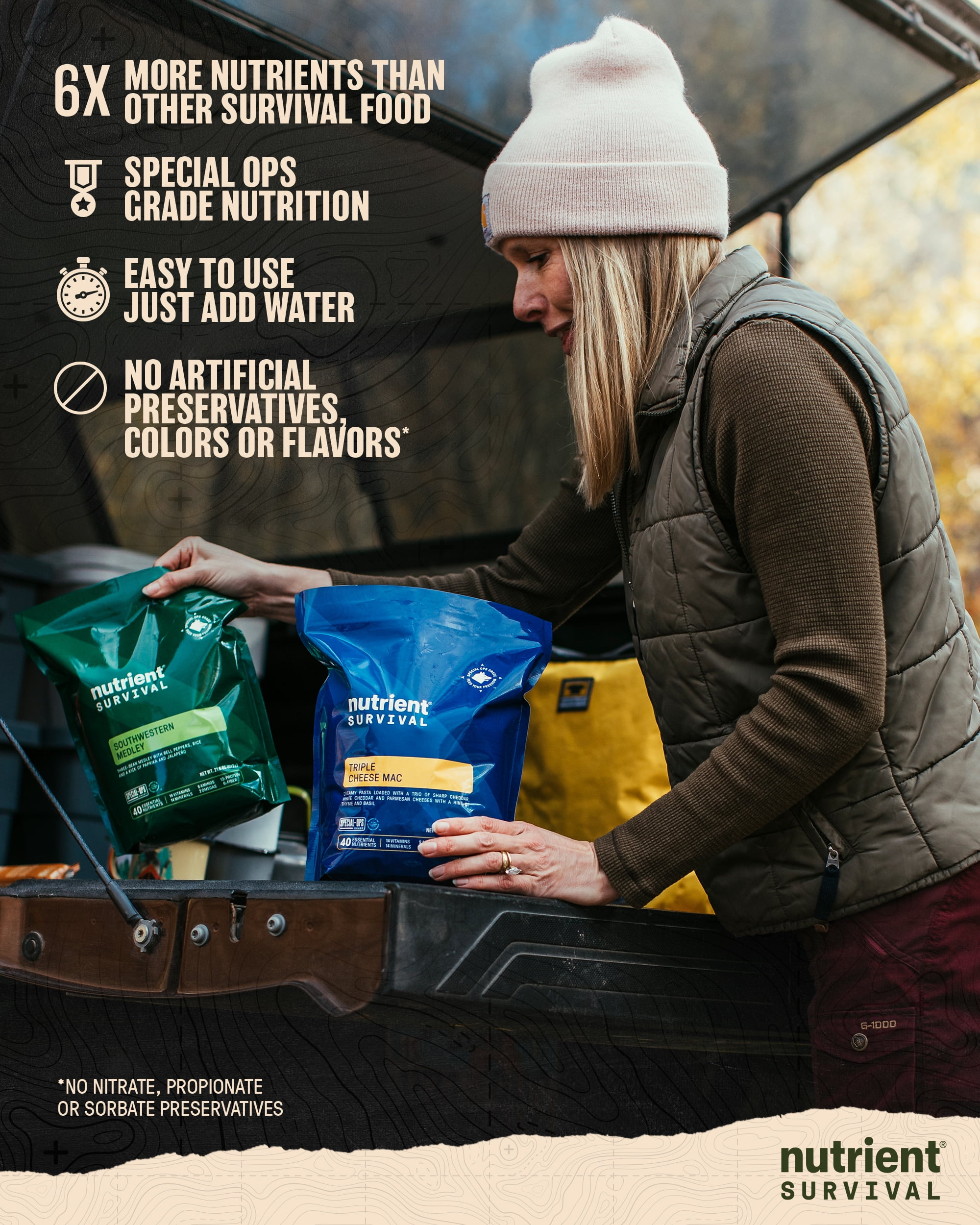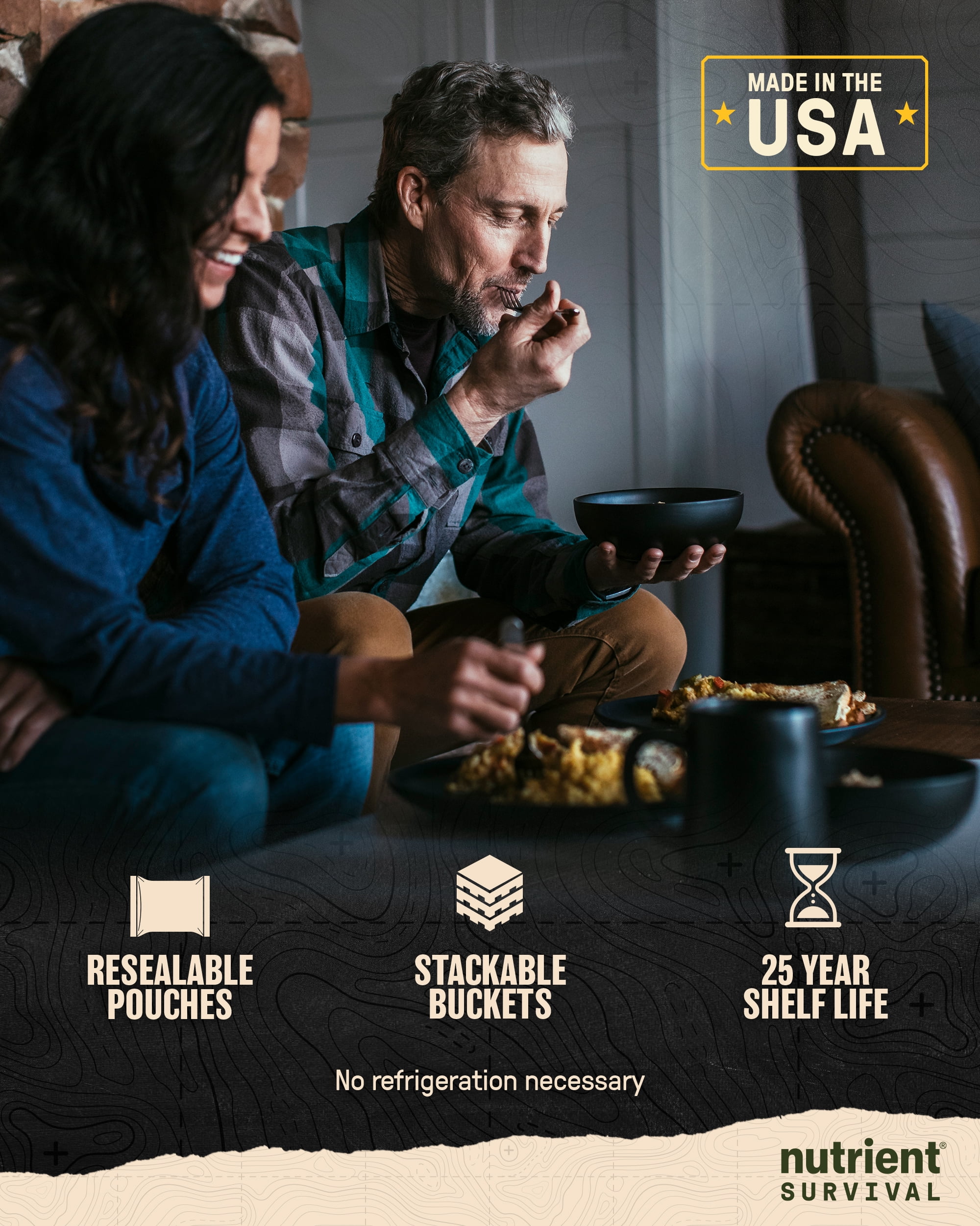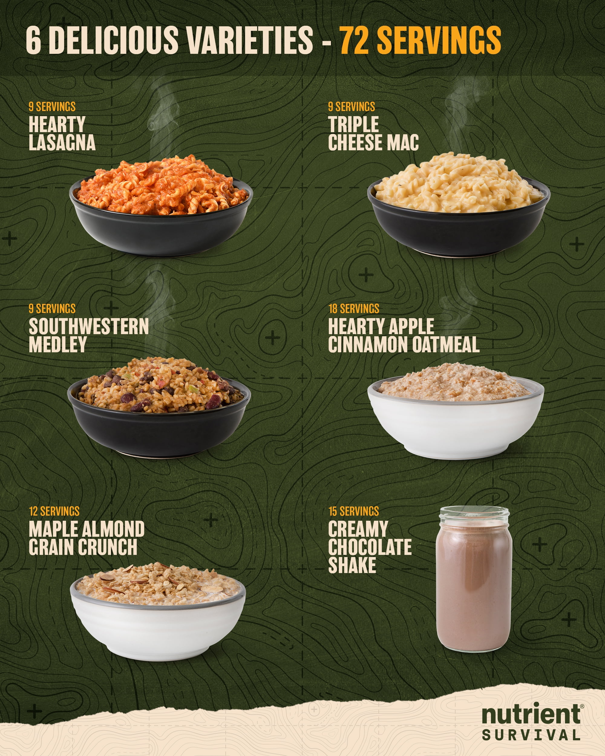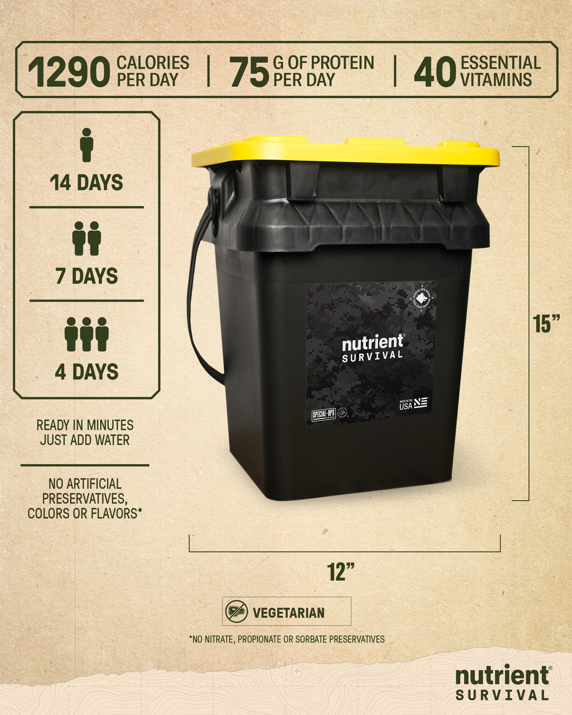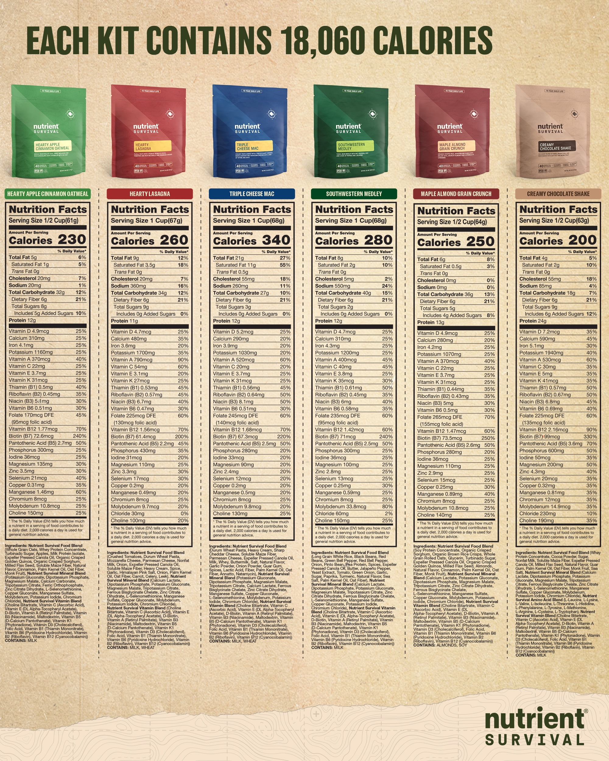 Contains 72 servings for 18,060 calories and 1,047 grams of protein (1,290 calories and 75 grams of protein a day). Every prepper knows to have enough food on hand in case of an unexpected emergency. But the smartest preppers know that just having food isn’t enough. In fact, you can eat all the food you want and still be malnourished, if that food doesn’t have the nutrition you need. Other survival food companies like to talk about CHEAP calories – but we like to talk about QUALITY calories. That’s why Nutrient Survival has 6 times the nutrients per calorie than other survival food. That makes us Special Ops grade nutrition. No other brand comes close. Feed Your Freedom with this collection of six best-selling favorites – Triple Cheese Mac, Hearty Lasagna, Southwestern Medley, Hearty Apple Cinnamon Oatmeal, Creamy Chocolate Shake, and Maple Almond Grain Crunch. Each variety comes sealed tight in a large resealable pack with 15-year shelf life. Plus we pack it all up in a BONUS FREE, premium heavy duty 5 gallon storage container with a recessed, snap on, lockable lid for stackability and security. Plus a sturdy handle for easy carry and 75 pound weight capacity. Get one a month and be ready for anything. Each kit contains 18,060 calories and 1,047 grams of protein (1,290 calories and 75 grams of protein a day) not to mention an Excellent Source of essential vitamins, minerals, amino acids, omegas and fiber.
