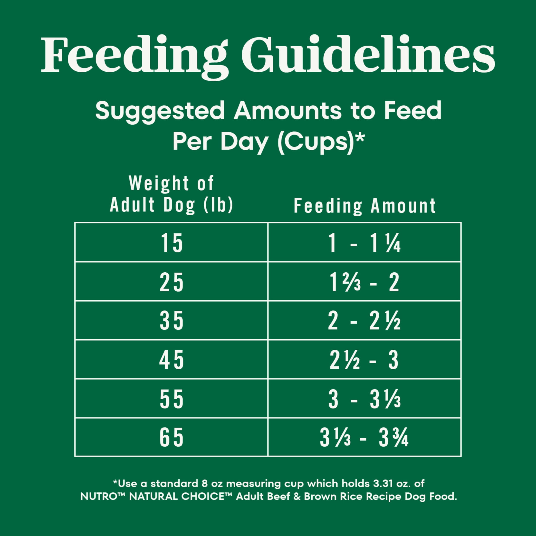 We understand that pet owners want the best for their dogs. That’s why Nutro has a partnership with trusted farmers and suppliers to source high-quality ingredients, giving your dog quality nutrition both you and your pet will appreciate. Made with beef as the #1 ingredient, and crafted with vitamins, minerals, and other nutrients, Nutro Natural Choice Adult Dry Dog Food, Beef & Brown Rice Recipe brings real, recognizable ingredients to every mealtime. Crafted with wholesome grains and fat, this dry dog food promotes healthy energy for your dog. There is no chicken by-product meal, corn, wheat, or soy protein and no artificial flavors, colors, or preservatives in this quality dry dog food recipe, although trace amounts may be present due to potential cross-contact during manufacturing. With ingredients that promote healthy skin and coat, digestion, and immunity, this dry dog food recipe also supports your dog’s vitality. Packed with delicious flavor, high quality ingredients, and supportive benefits, serve your furry loved one something they will love with Nutro Natural Choice Dry Dog Food Recipes.
