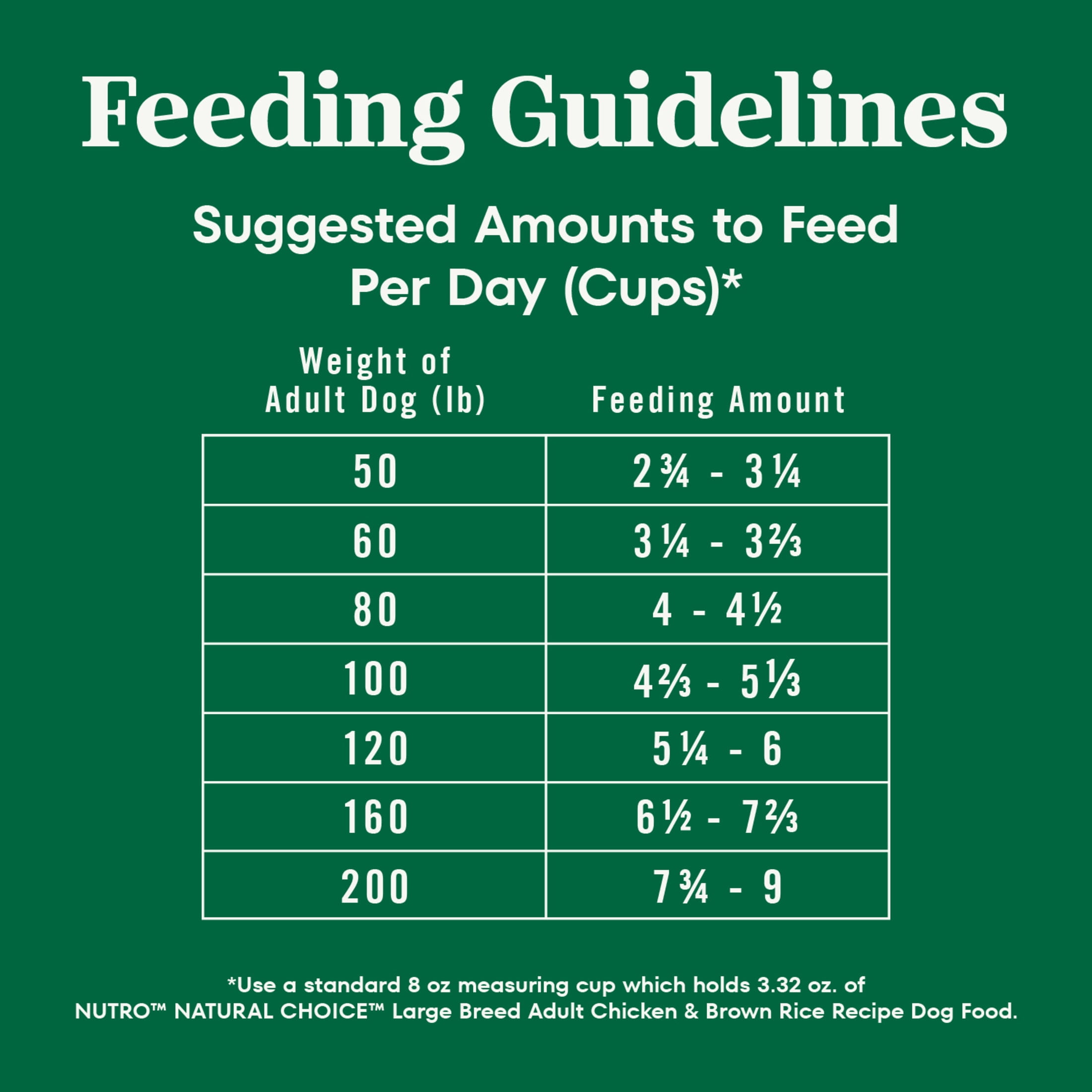 We understand that pet owners want the best for their dogs. That’s why Nutro has a partnership with trusted farmers and suppliers to source high-quality ingredients, giving your dog quality nutrition both you and your pet will appreciate. Made with chicken as the #1 ingredient, and crafted with vitamins, minerals, and other nutrients, Nutro Natural Choice Adult Large Breed Dry Dog Food, Chicken & Brown Rice Recipe brings real, recognizable ingredients to every mealtime. Crafted with natural sources of Glucosamine and Chondroitin, this dry dog food supports healthy joints in your large breed dog. There is no chicken by-product meal, corn, wheat, or soy protein and no artificial flavors, colors, or preservatives in this quality dry dog food recipe, although trace amounts may be present due to potential cross-contact during manufacturing. With ingredients that promote healthy skin and coat, digestion, and immunity, this large breed dry dog food recipe also supports your dog’s vitality. Packed with delicious flavor, high quality ingredients, and supportive benefits, serve your furry loved one something they will love with Nutro Natural Choice Dry Dog Food Recipes.