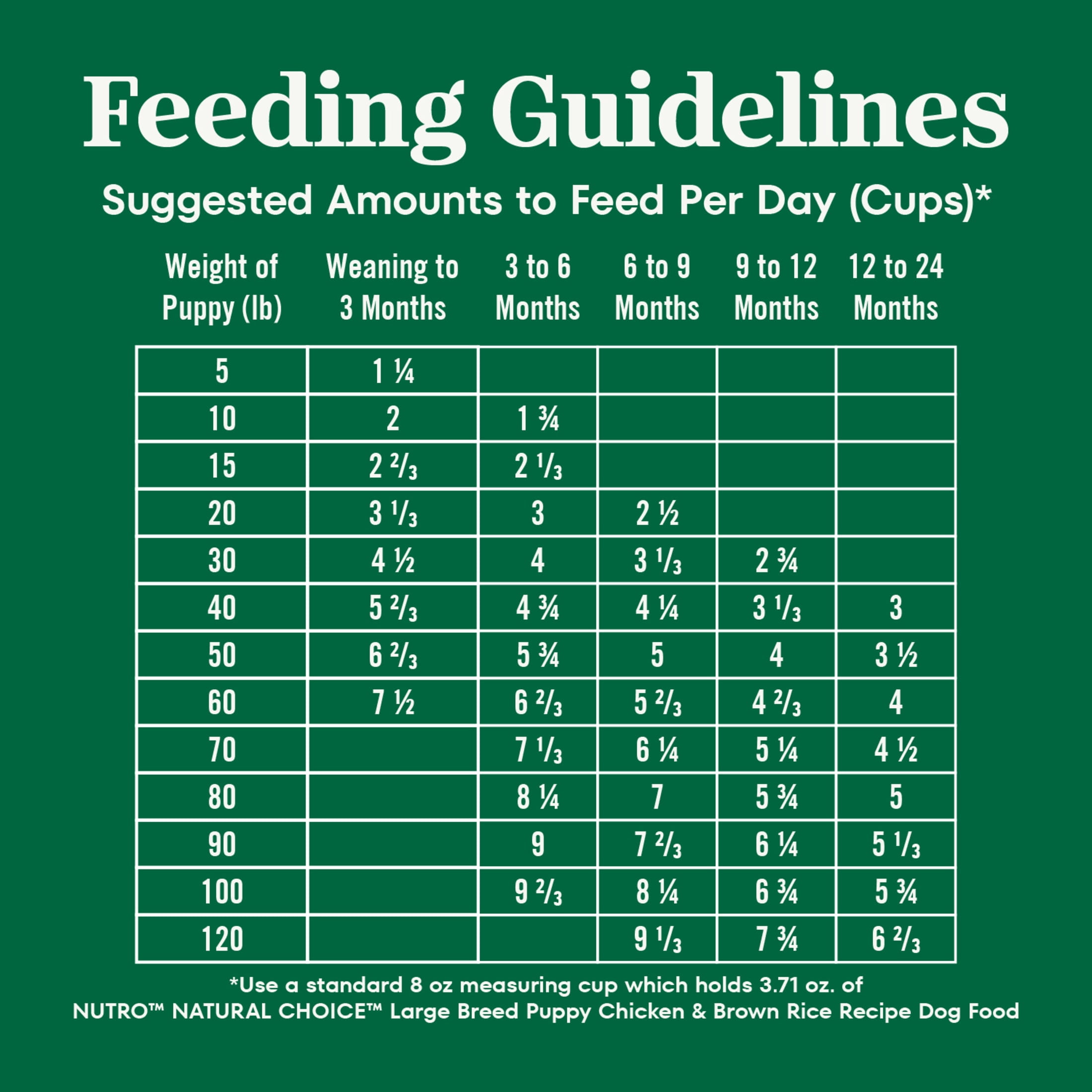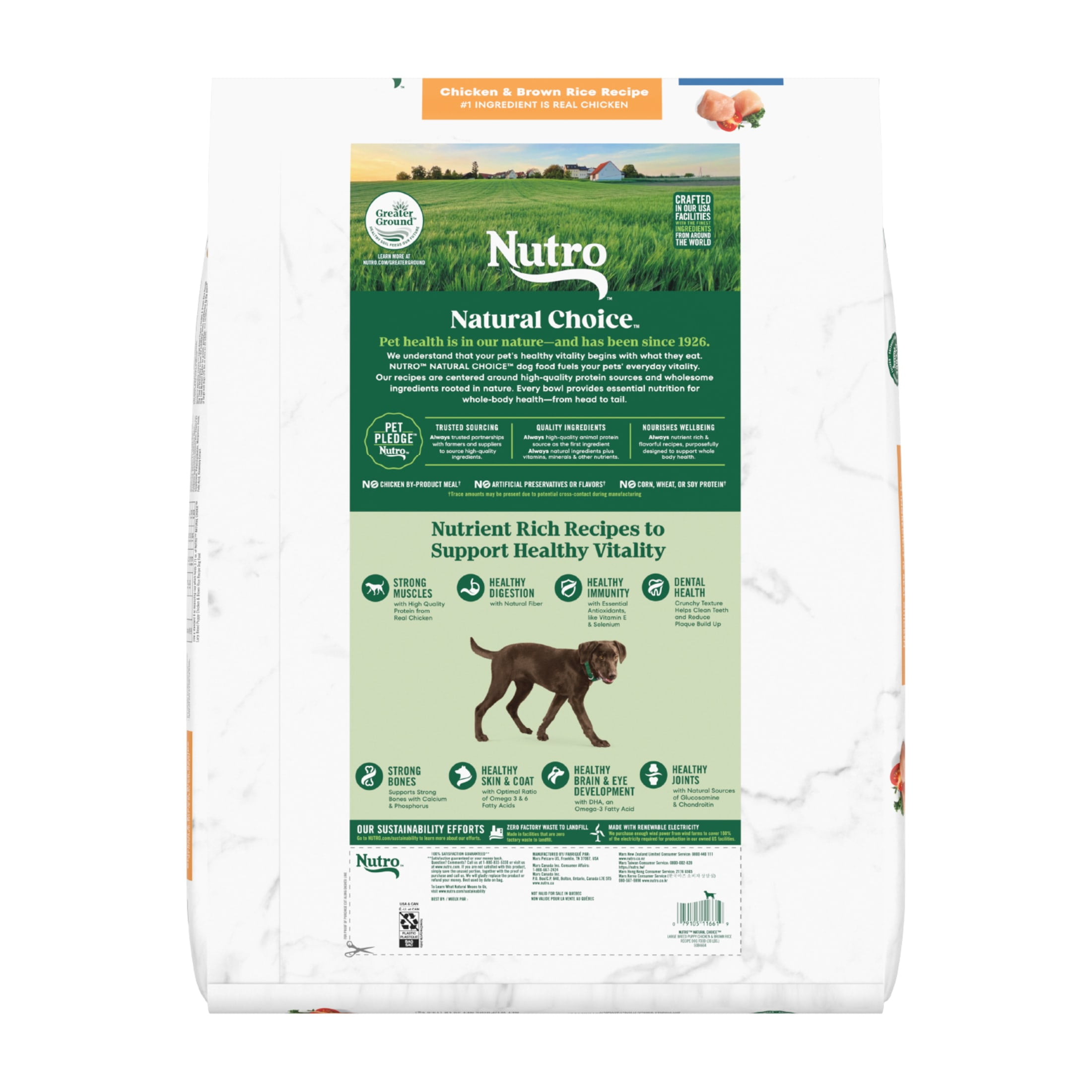 We understand that pet owners want the best for their dogs. That’s why Nutro has a partnership with trusted farmers and suppliers to source high-quality ingredients, giving your dog quality nutrition both you and your pet will appreciate. Made with chicken as the #1 ingredient, and crafted with vitamins, minerals, and other nutrients, Nutro Natural Choice Large Breed Puppy Dry Dog Food, Chicken and Brown Rice Recipe brings real, recognizable ingredients to every mealtime. Crafted with DHA, an Omega-3 Fatty Acid, this dry dog food supports healthy brain and eye development in puppies. There is no chicken by-product meal, corn, wheat, or soy protein and no artificial flavors, colors, or preservatives in this quality large breed puppy dry dog food recipe, although trace amounts may be present due to potential cross-contact during manufacturing. With ingredients that promote healthy skin and coat, digestion, and immunity, this large breed puppy dry dog food recipe also supports your puppy’s vitality. Packed with delicious flavor, high quality ingredients, and supportive benefits, serve your furry loved one something they will love with Nutro Natural Choice Dry Dog Food Recipes.