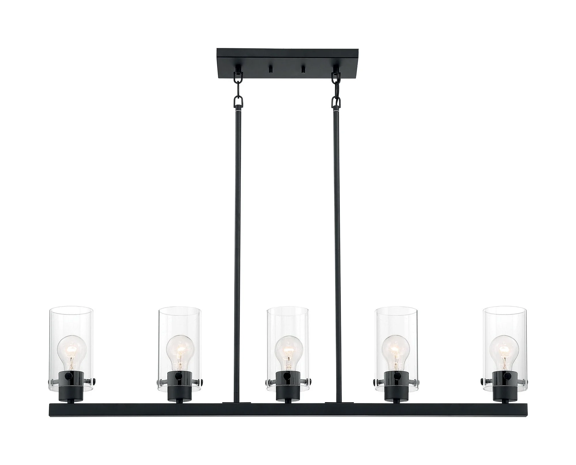 Nuvo Lighting-60/7276-Collection: Sommerset, Finish Color: Matte Black, Width: 4.5″, Height: 8.75″, Length: 38.5″, Number Of Bulbs: 5, Wattage: 60 Watts, Dimmable: No, Moisture Rating: Dry Rated, Desc: Sommerset; 5 Light; Island Pendant Fixture; Brushed Nickel Finish with Clear Glass 1 Year Limited Clear / Mounting Direction: Up / Shade Included: Yes. ,-Sommerset-5 Light Island in Modern/Contemporary Style-4.5 Inches Wide by 8.75 Inches High-Matte Black Finish