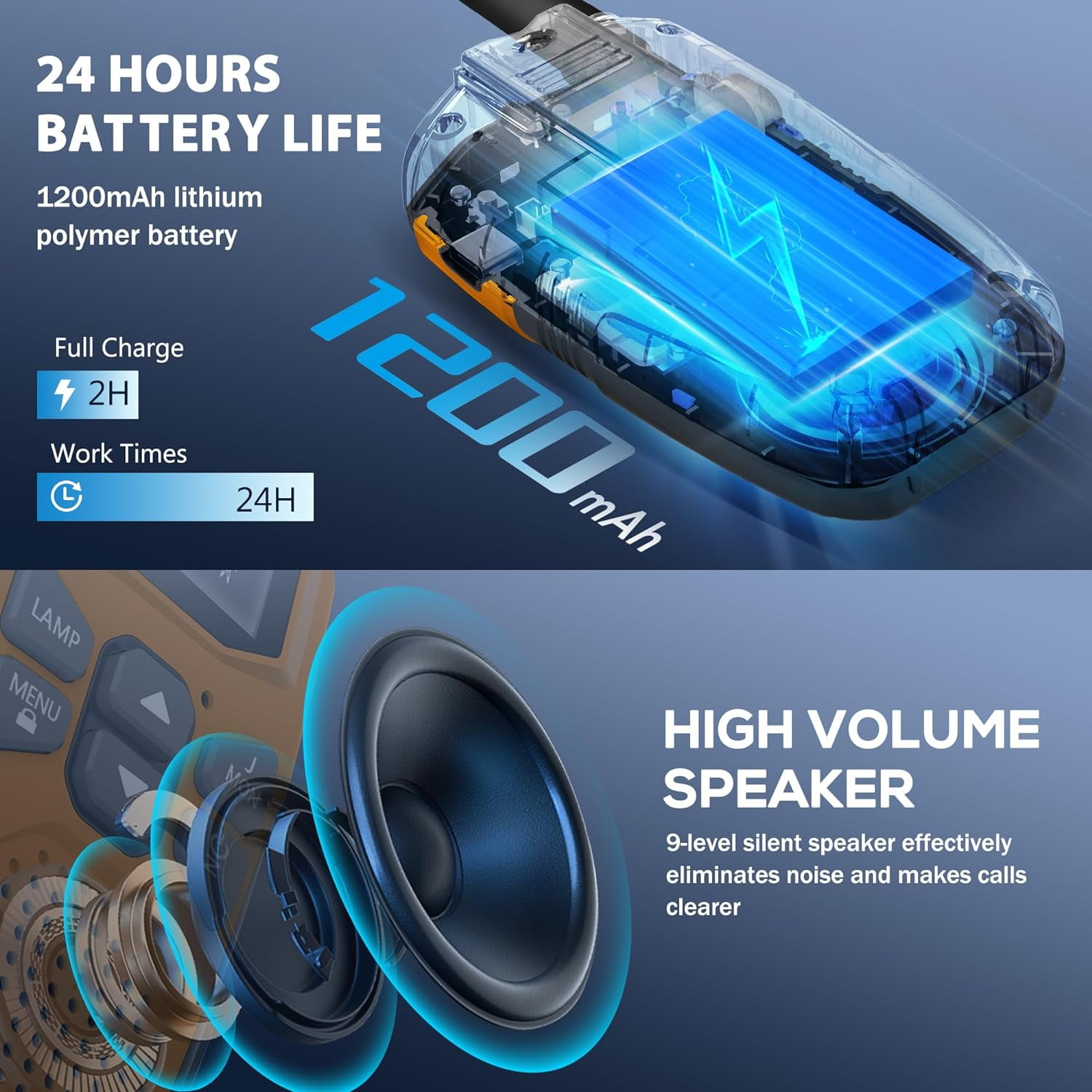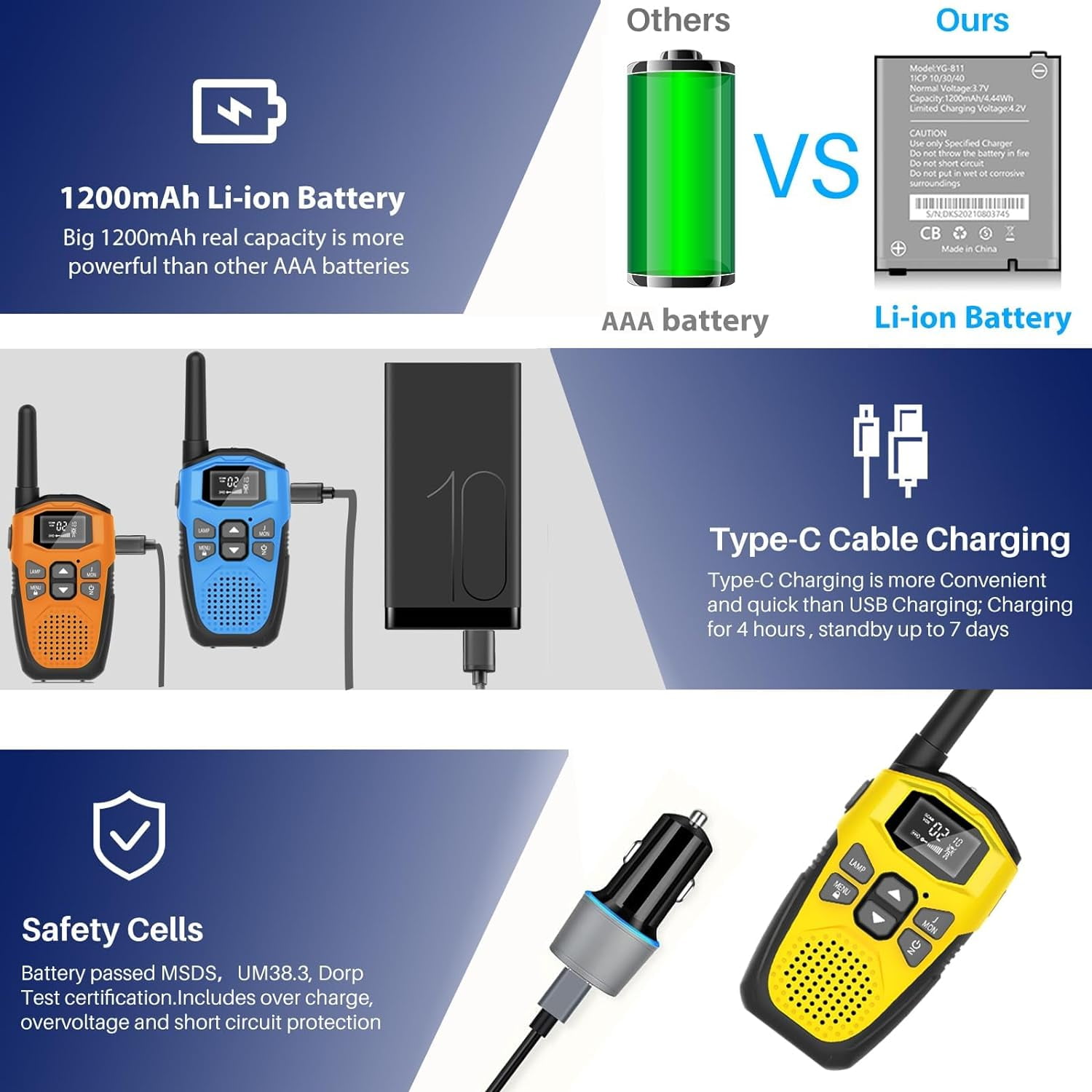 Walkie Talkies Long Range for Kids Adults 3 Pack, NXGKET Rechargeable 2 Way Radios 22 FRS Channels with LED Flashlight, VOX, Clear Voice Type-C Charging Portable for Boys Girls Gift,Built-in 1200mAh Li-ion Batteries For Camping Hiking Trip Features: 【RECHARGEABLE LI-ION BATTERY & LONG STANDBY】 Our Walkie Talkie equipped with built-in rechargeable 1200mAh lithium_polymer batteries and USB Type-C charging cable,which can be used for 1 days with a full charge and up to 3 days in standby. Compare to AAA Batteries, the rechargeable li-ion battery is more safe, economy and longer life to charge anytime and anywhere. 【MULTIPLE FUNCTIONS AND EASY TO USE】 The 3 pack walkie talkie is very easy to use and designed for kids girls boys over 3 years old. Set the same channel and subcode, then press the PTT button to talk. Easy operation. This radio supports many advanced features, such as Volume adjustment, VOX-hands free, Auto squelch, Auto memory, Auto scan, Auto power saving, Low battery alert, Keypad lock(Channel-lock), Drop-protection,Large LCD screen with backlight,Voice Adjustable etc. 【SUPPORT ANY SAME CHANNEL RADIO】 NXGKET walkie talkie has 22 channels and 121 interference eliminator codes, which help the signals are not disturbed by the anti-interference performance.One-to-one or one-to-more communication function allow other walky talky regardless of brand to communicate on same channel and privacy code. 【LONG RANGE & CLEARER SOUND】 Our Walkie talkies can reach 5km in open areas such as rural areas, suburbs or seaside, etc. where there is no shelter. If in cities or towns, walkie talkies can reach 1.5km. Keep the one in touch without a moblie phone.The radio sound quality is clear and loud without noise and quick response when talk to another. 【BEST TOYS FOR KIDS OUTDOOR GAME】 Flashlight makes our walkie talkie the best choice for outdoor play. The built-in LED flashlight can even be used as an emergency light. It is a useful camping survival accessory and nighttime exploration toy for kids.Perfect for locations with extreme weather conditions, solo hiking, camping, hunting, etc . 【Lifetime Support】 NXGKET 2-WAYS Radio has been tested to comply with FCC standards.(FCC ID: 2AYV7YG-813), The introduction of advanced technology and strict quality process control of walkies give us the courage to offer a 1-year warranty. Please feel free to contact us if any concerns about the item. Package Included: 3* Rechargeable Walkie talkie Built in 3* 1200mAh Li-ion Battery 3* Belt Clip 1* Type-C Cable 1 * User’s Manual