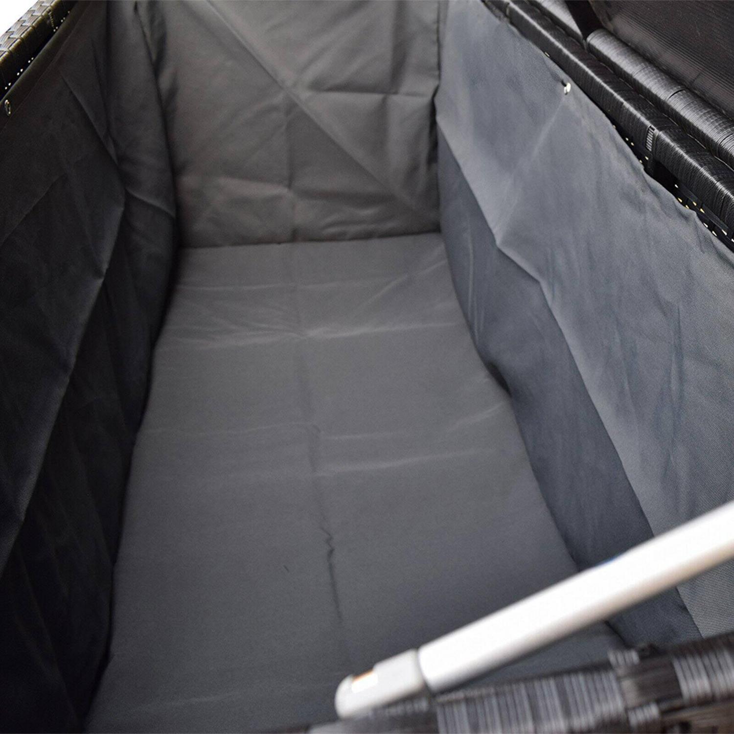 Tuck pool toys, outdoor cushions, and more in the Oakland Living 113 Gallon Indoor/Outdoor Wicker Deck Box – Black. A pneumatic hinged top makes it easy to access whatever you choose to store inside this generous deck box. For versatile style, it’s woven of black all-weather resin wicker. A black weather-resistant liner protects the items inside.
