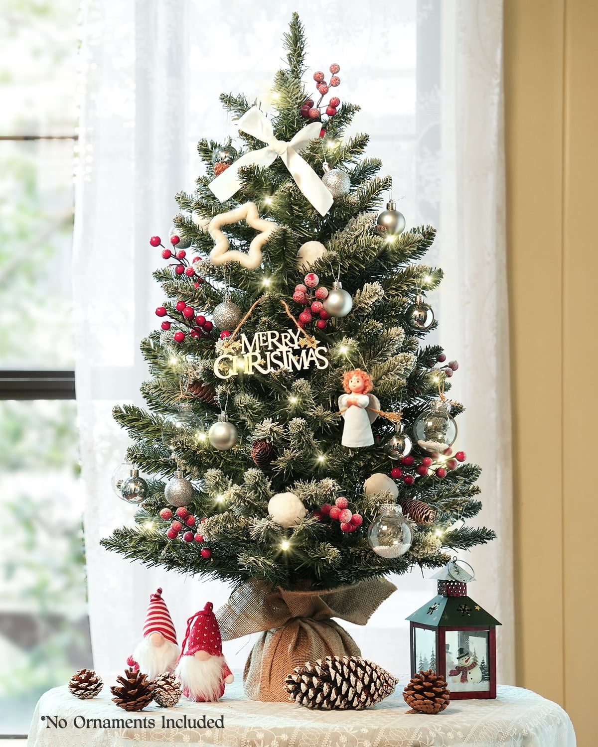 🎄FULL NATURAL APPEARANCE: OasisCraft small artificial Christmas tree is 3 feet tall with cloth bag base and features 98 individually crafted branches to create full bodied branches. Plus, there are artificial snow bushes on pine cones and branches, creating a fuller and more realistic look. 🎄8 MODES LED LIGHT: The tabletop Christmas tree with pine cones come with 50 LED lights. Press the battery box button to switch 8 modes: Combination, In waves, Sequential, Slow Glow, Chasing, Slow Fade, Flash, Steady on. You can set different lighting modes according to your favorite atmosphere. 🎄PREMIUM SAFE PVC MATERIAL: This mini Christmas tree with LED lights is made of high-quality PVC material, known for its excellent fade and crush resistance, ensuring its durability during many festive seasons. In addition, the flame-retardant PVC material ensures safe indoor use without any unpleasant smell. 🎄NO ASSEMBLY REQUIRED: It’s easy to assemble this little prelit Christmas tree with cloth bag base. Simply remove from the box and adjust the leaves to achieve a full, beautiful shape, it’s a quick and hassle-free process. 🎄PERFECT SIZE FOR SMALL SPACES: Our compact Christmas tree with red berries takes up little space and can be placed in many places including your living room, dining room or office. It brings holiday cheer to gatherings. 🎄1 YEAR WARRANTY: OasisCraft tabletop Christmas tree is guaranteed for 1 year. If you have any problems, please feel free to contact us. We’ll provide excellent customer service to track product quality. . .