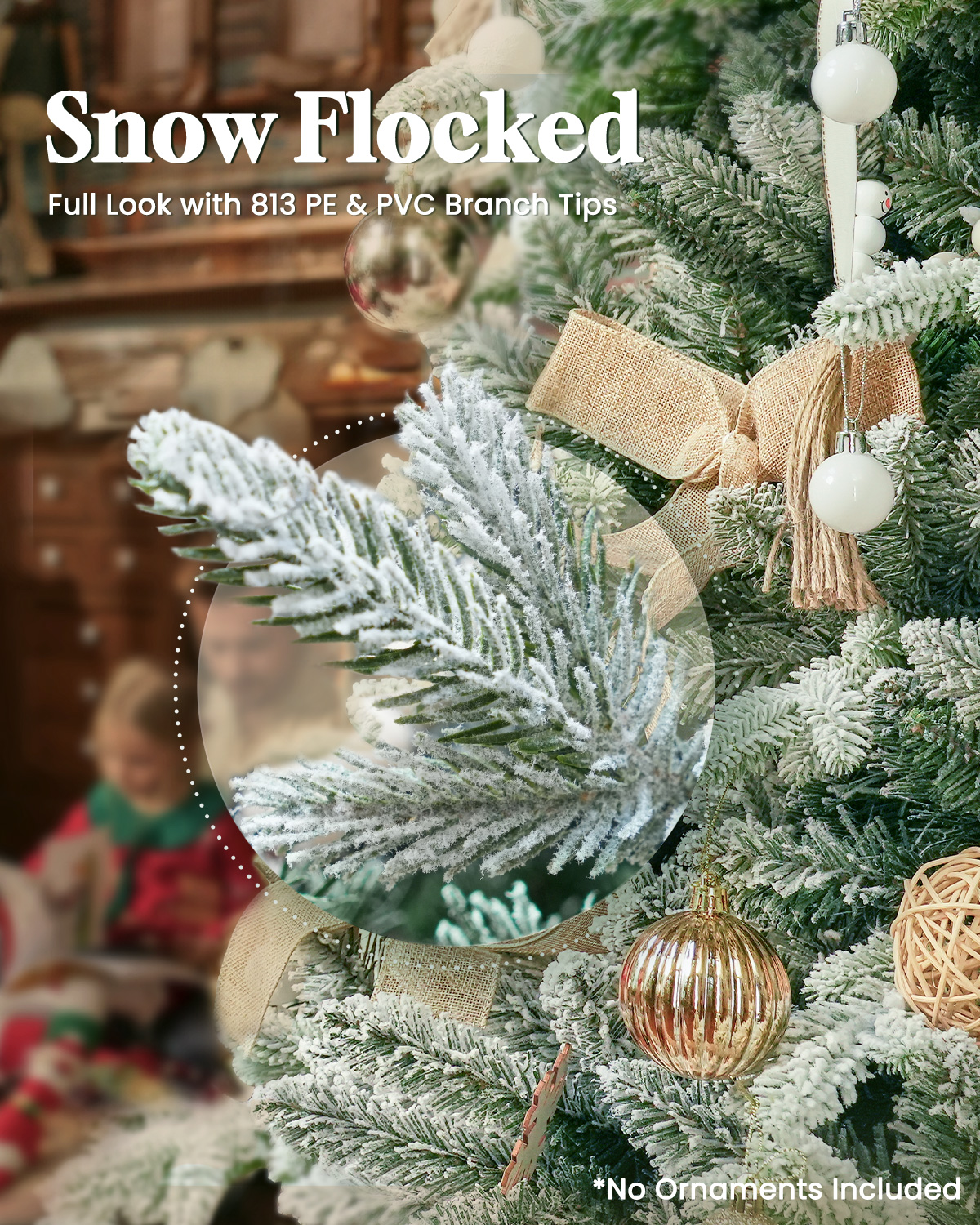 OasisCraft 6.5 Foot Pre-lit Flocked Aspen Fir Artificial Christmas Tree, PE & PVC 813 Branch Tips Full Prelighted Xmas Tree with 350 Clear Lights