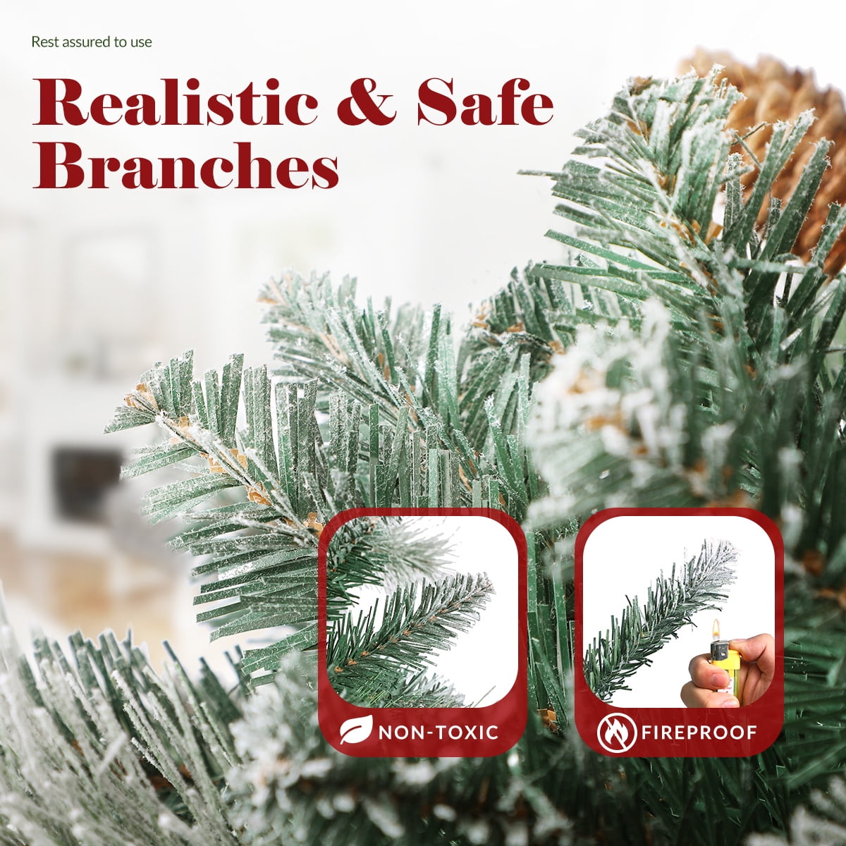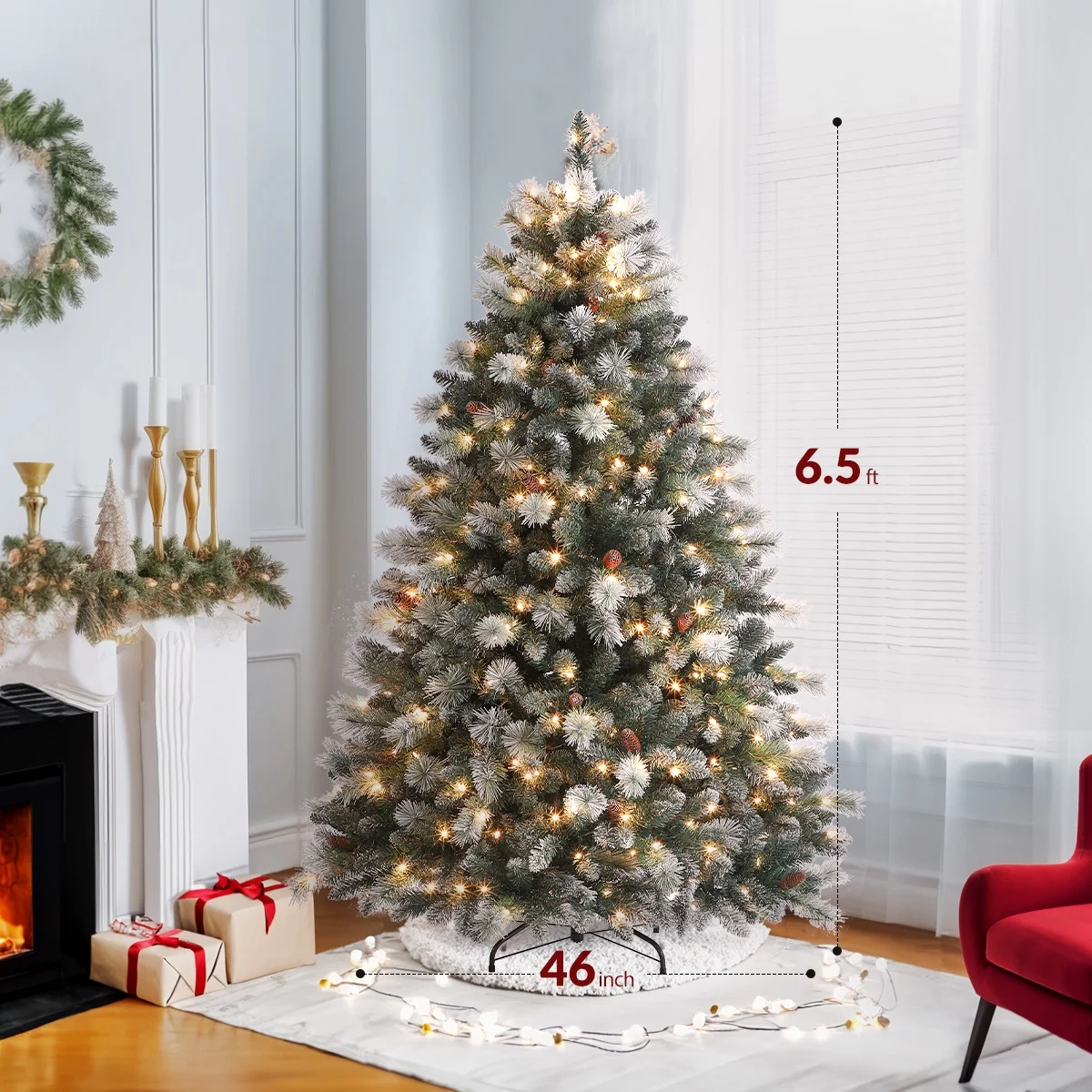 🎄Perfect Size for Home Decoration: 🎄Standing at 6.5-Feet tall, 46 inch wide, this hinged Christmas tree is an eye-catching to stairs, living room or fireplace during the holidays 🎄Warm and Charming: 🎄Especially designed to capture the enchantment of a winter wonderland for your home, this tree is decked with warm tips green needles and large brown pine cones. The fresh green pine tips, dusted with snow for a crisp wintry ambiance, evoke cheerful images of family ski trips and snowball fights up in the Rockies. Its clear lights fill your home with an amber brightness. 🎄PRE-STRUNG LIGHTS: 🎄Pre-lit Christmas Tree with incandescent, warm white lights, ready to brighten up your room for the season 🎄Easy Set Up: 🎄OasisCraft Pre-lit Christmas Tree takes just minutes to set up and take down. The flocked Christmas with 1418 tips and 350 light and conveniently disassembles into 3 hinged sections for storage. Spend some time in Decorating with your family, memorize each moment in this lovely season. 🎄The 180-days Warranty & Fast Shipped:🎄 7 self-support inventory covers 50 states on America. Fast delivery, Shipping soon. Provided 180-days Warranty, make you christmas without any scruple.