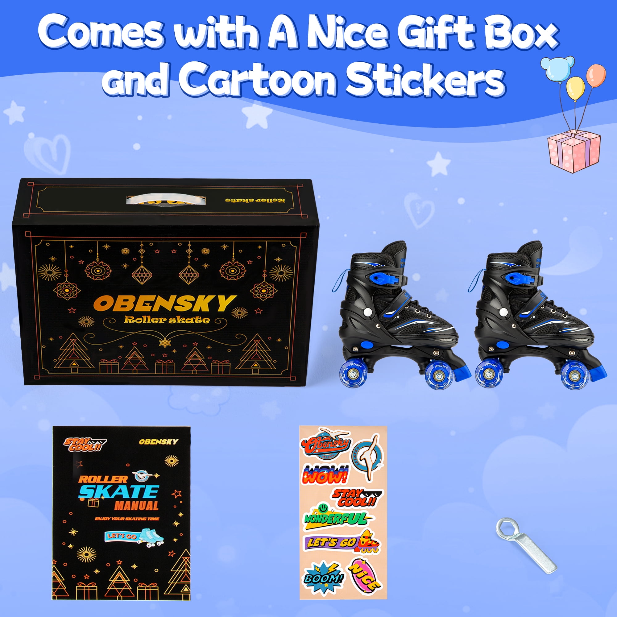 4 SIZE ADJUSTABLE: Easy and concenient 1 push button to adjust different sizes, OBENSKY roller skates for kids toddler can be adjusted to 4 different sizes to fit different foot lengths easily. They are perfect choice for your kid’s growing feet. We have 3 sizes (S/M/L) for choosing, please must confirm the size before placing the order. 8 WHEELS ILLUMINATING: All wheels will shine when sliding. Especially at night, when your child puts on the quad roller skates, it is absolutely hard to resist the feeling like a star, and he will more confident and thrilled. The most convenient thing is that the wheels’ light are self-generated without any battery required. DURABLE & COMFORTABLE: Designed with triple protective, strap, buckle and shoelace are together to keep feet in the most comfortable position, give more support to your ankle, reduce fatigue and ensure safety. 82A PU wheels and ABEC-7 bearings are durable that re perfect for both indoor rink use and outdoor street skating. Procide safe ankle support and protece you along the way. PERFECT GIFTS for KIDS: Beautiful gift box packaging, exquisite cartoon pattern design, unique shining fabric, fashionable color matching, this is our roller skates. Which is lovely and dazzling, be loved by boys and girls, Designed with two row wheels are more stable and easy for kids beginners, That exactly a best gift for kids or friends in birthdays, holidays and special enents. BEAUTIFUL STICKERS for FREE: This set inclueds the fun and colourful stickers. It is free for OBENSKY fans and colourful stickers. You can stick stickers on shoes or other places. make it your unique skates.