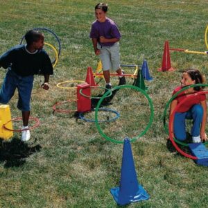 Create challenging and fun-filled movement activities with a set that lets you custom-design obstacle courses to match your group s ability level. Kids will build agility and coordination as they hop over poles, crawl through hoops and more. Ideal for indoor and outdoor use. Sturdy cones and hoop holders won t slip on gym floors and they re heavy enough to withstand outdoor breezes. Flat-sided hoops slide easily into the slot-fit cones and holders; tough plastic clips keep poles level. Your options are endless! Bright primary colors add to the fun. Includes: 8 cones (4 18 and 4 12 ) 4 14 long hoop holders 12 hoops (4 15-1/2 , 4 19 and 4 26-3/4 ) 8 hurdle bars (4 15-1/2 and 4 27 bars) 8 clips